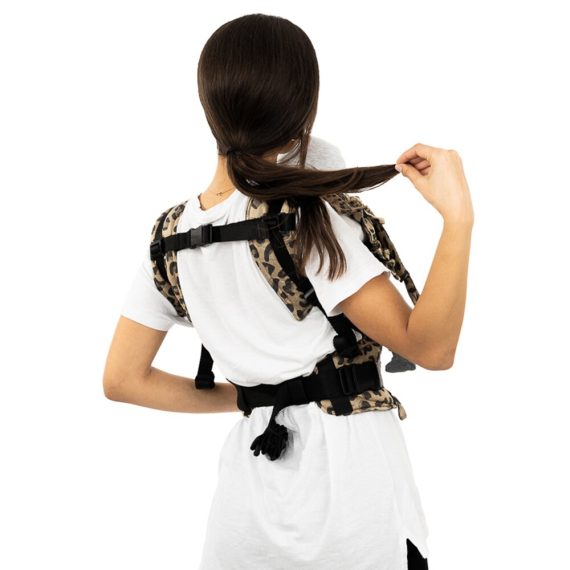 Du kan välja två olika inställningar, när ditt barn är mycket liten och inte kan sitta utan stöd så ska axelremmarna fästas i de nedre spännena på panelen, detta för att lättare uppnå en lätt rundning för barnets rygg och därmed ergonomisk position. När ditt barn kan sitta fäster man axelremmarna mitt på panelen istället. Manual medföljer.