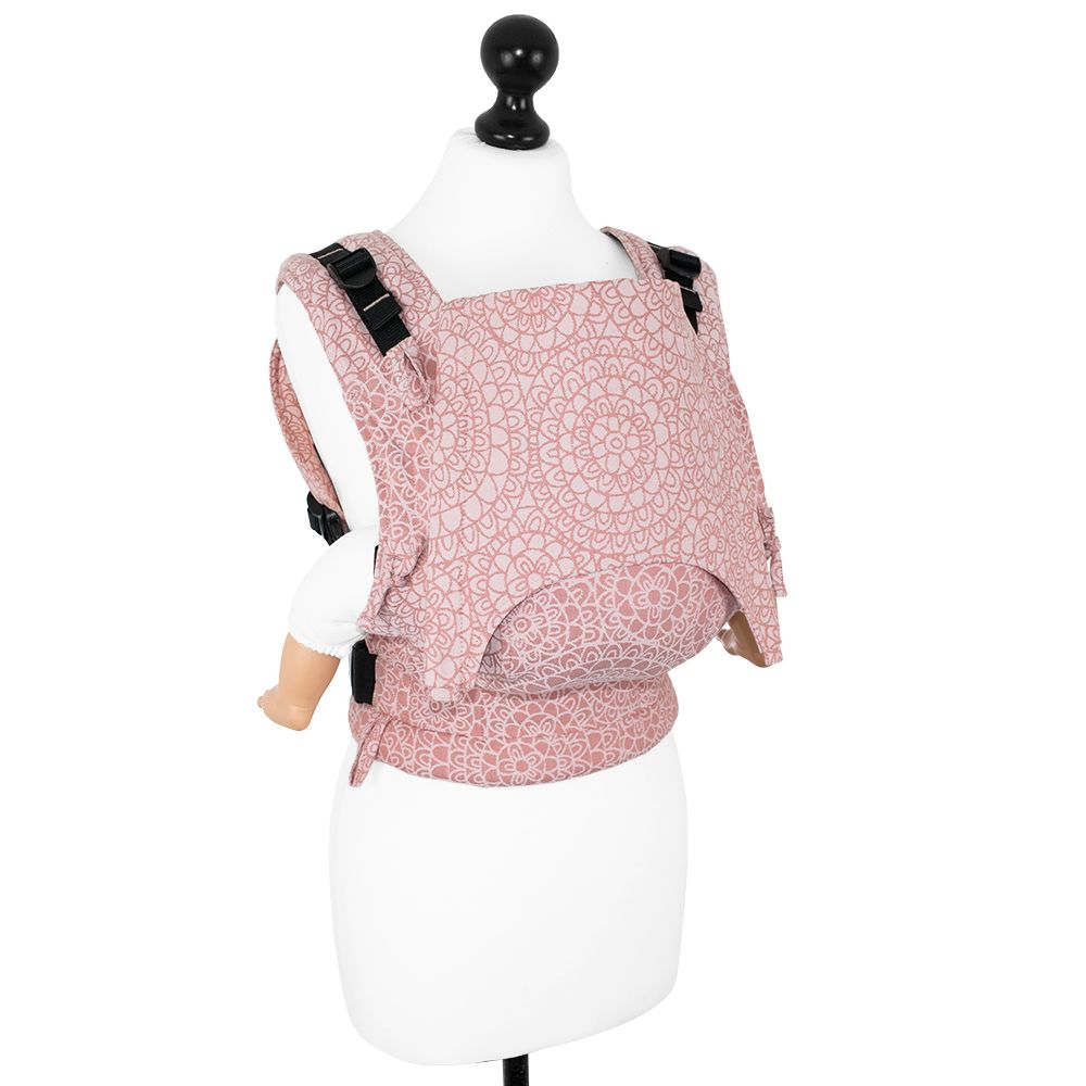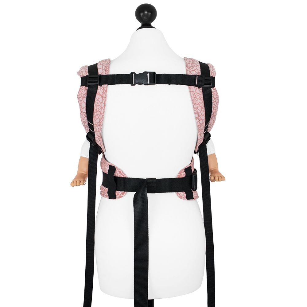 Denna är i storleken Baby Size, passar vanligtvis barn med storlek 56-74. Du kan välja två olika inställningar, när ditt barn är mycket liten och inte kan sitta utan stöd så ska axelremmarna fästas i de nedre spännena på panelen, detta för att lättare uppnå en lätt rundning för barnets rygg och därmed ergonomisk position. När ditt barn kan sitta fäster man axelremmarna mitt på panelen istället. Manual medföljer.