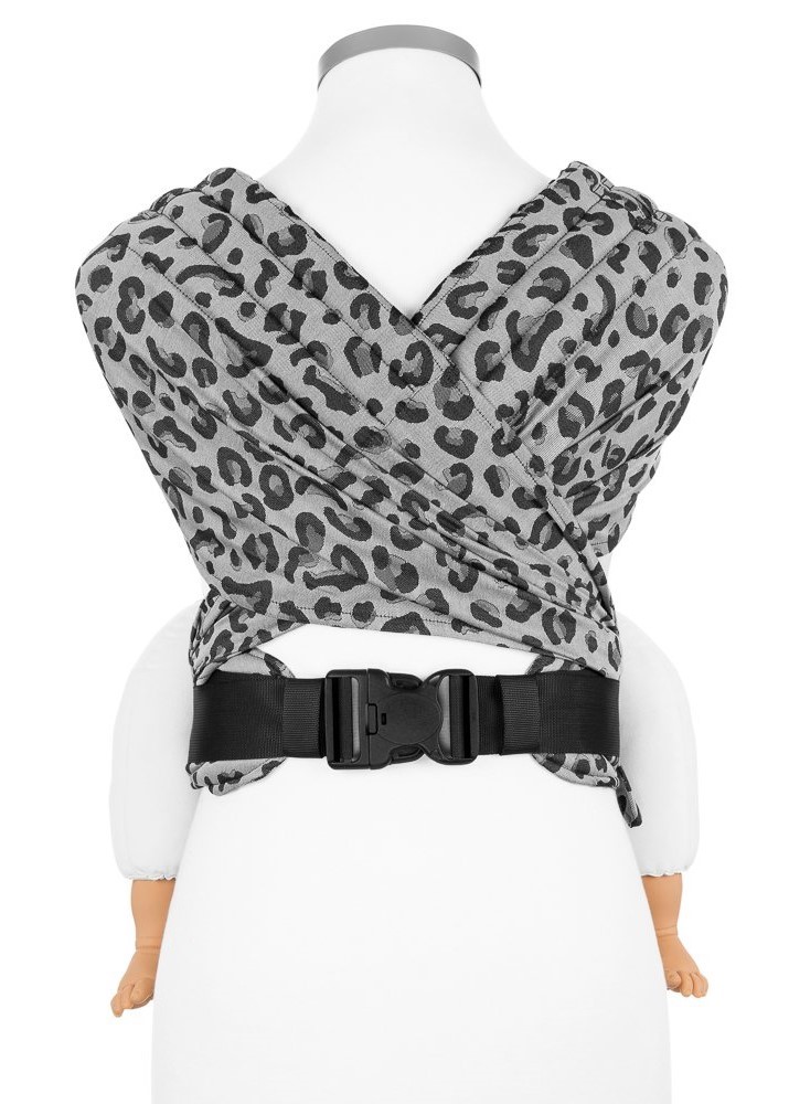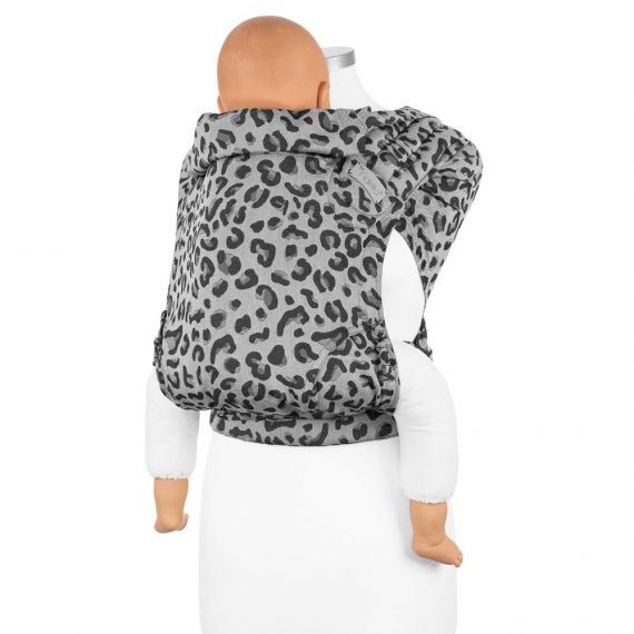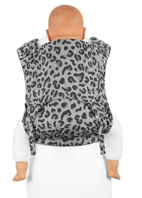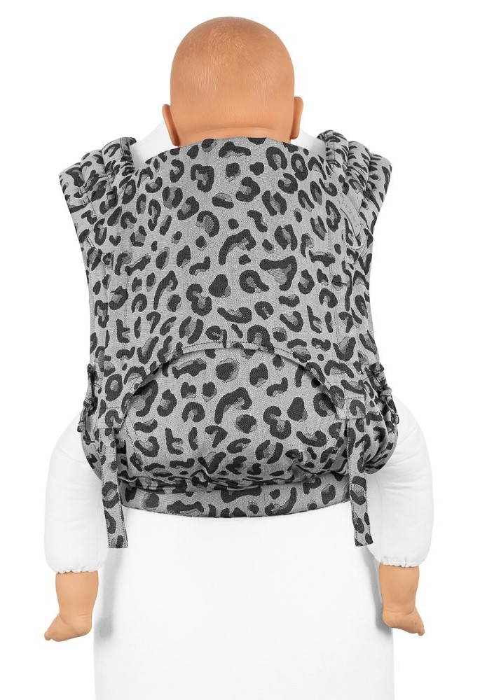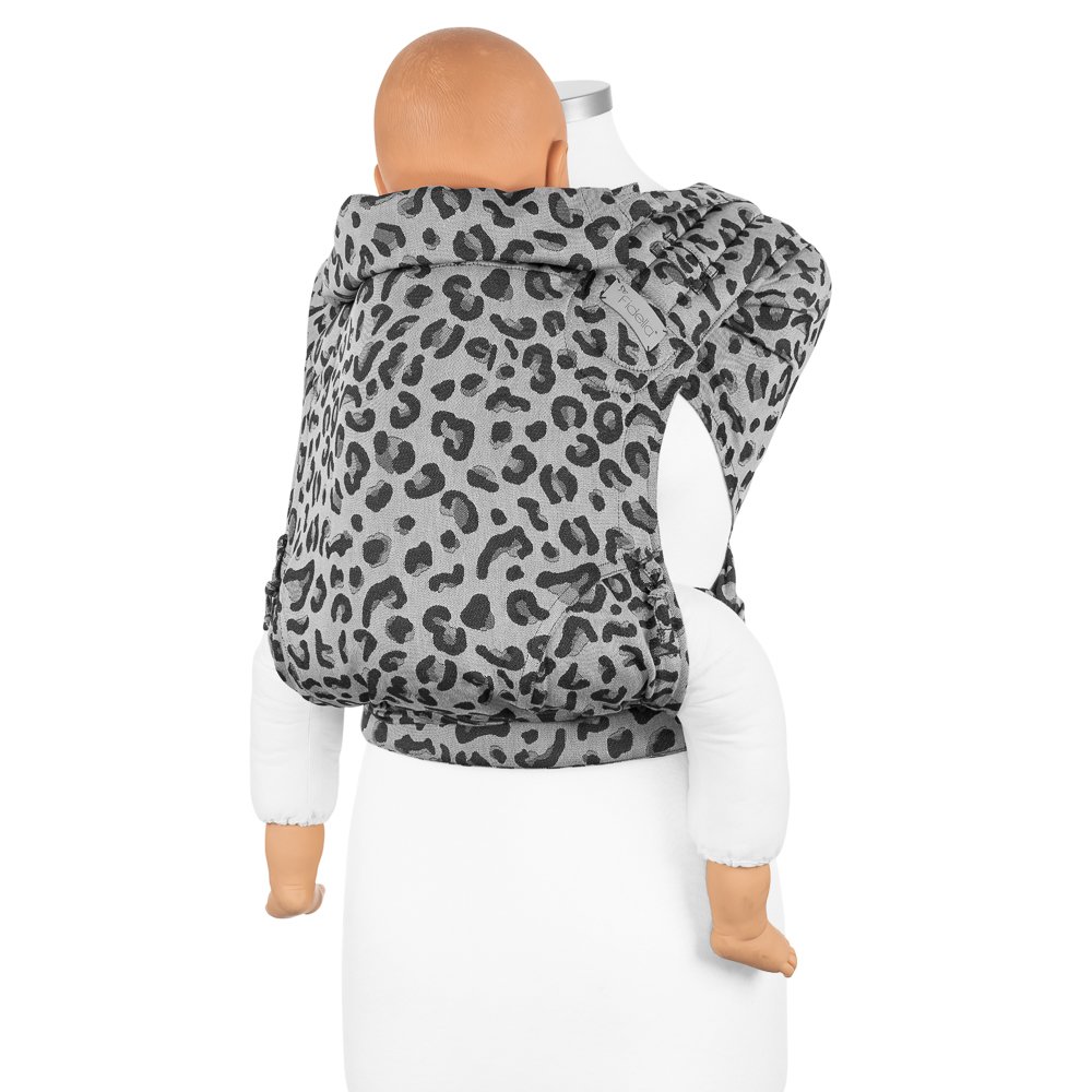 Fidella FlyClick är en half-buckle sele, du knäpper den med spänne i midjan och knyter sedan axelremmarna. Panelen är justerbar i höjd och bredd så att du kan anpassa den efter just din bebis. Vadderad vid barnets ben, integrerad huva. Du kan välja att bära ditt barn på mage, höft eller rygg.