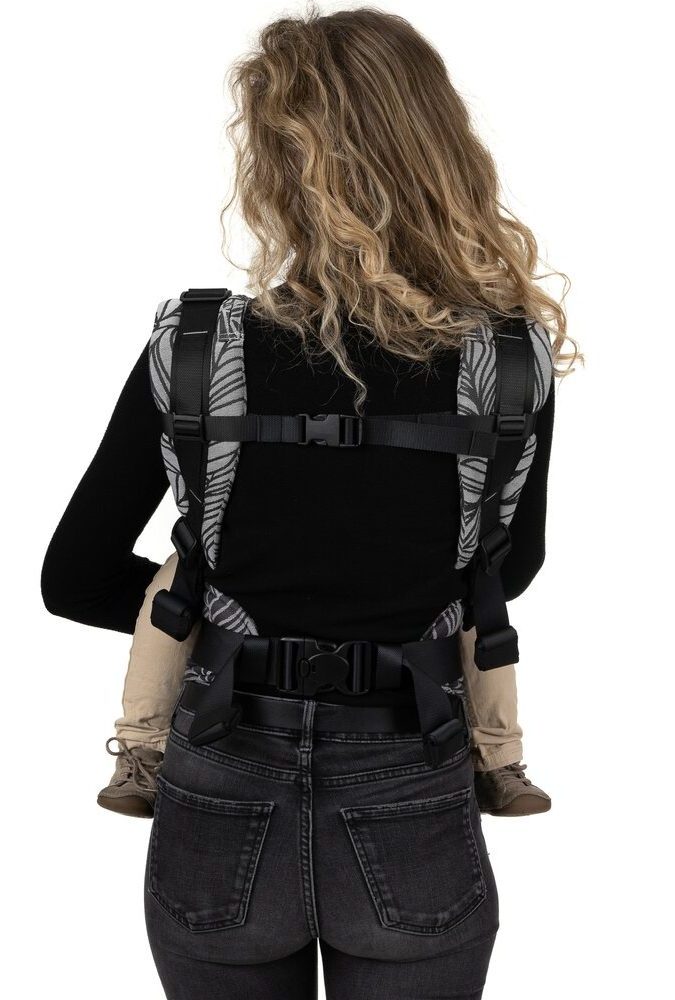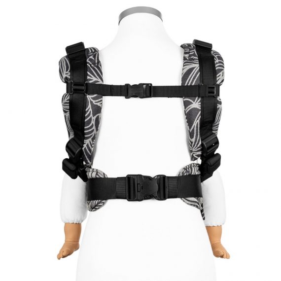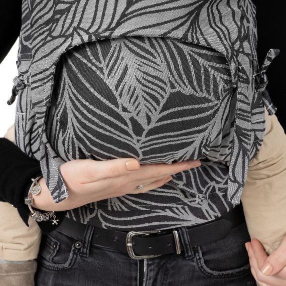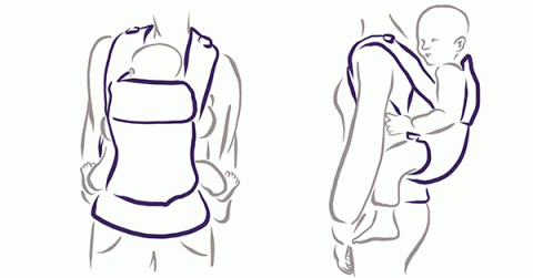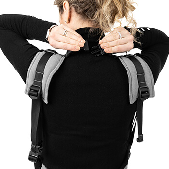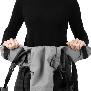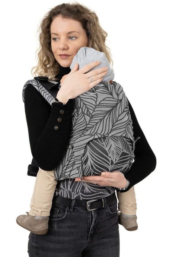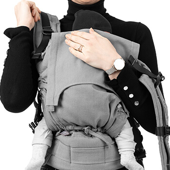 Du kan välja två olika inställningar, när ditt barn är mycket liten och inte kan sitta utan stöd så ska axelremmarna fästas i höftbältet, detta för att lättare uppnå en lätt rundning för barnets rygg och därmed ergonomisk position. När ditt barn kan sitta utan stöd kan axelremmarna fästas i panelen istället. Fast huva som är bra som stöd när barnet sover eller ammar, också bra som skydd mot solen.