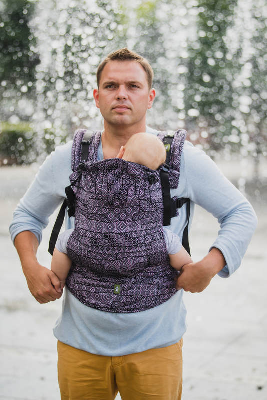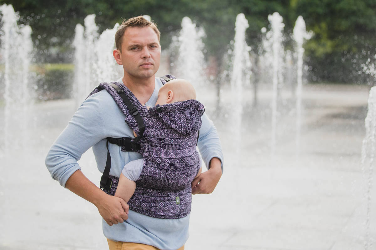 Flera olika möjligheter vad gäller inställningar av band och spännen, allt för en optimal passform för din bebis och dig som bärare. Du kan bära ditt barn på mage eller rygg. Ett trepunktsspänne i höftbältet förhindrar oavsiktlig öppning. Fyrvägs-justerbara axelremmar, som kan korsas i ryggen. Panelen är profilerad, axelbanden är mjuka och vadderad. Skön stoppning vid barnets ben för optimal komfort. Höftbältet är mjukt och bekvämt. Justerbar huva i härlig “hood-modell”.