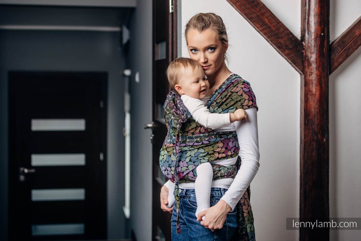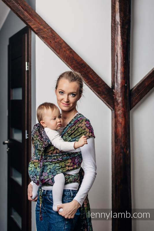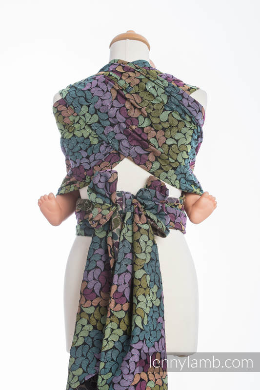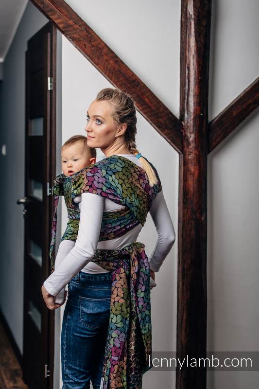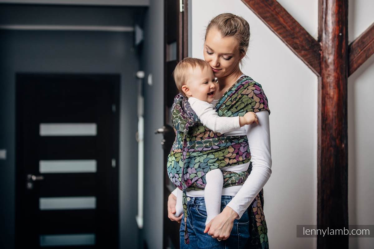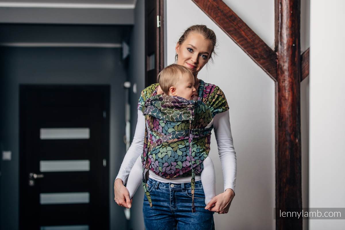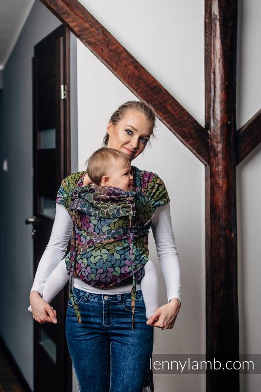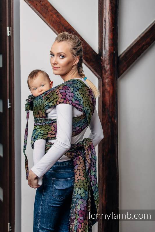 Lenny Lambs WrapTai är en kombination av en MeiTai och vävd sjal. Den har en mjuk och bekväm panel som håller ditt barn i en skön position. Med 4 band att knyta så får du en skön avlastning som distribuerar vikten jämnt över axlar och överkropp. Du kan bära både fram på mage och bak på ryggen. Den är vändbar, så det spelar ingen roll vilken sida som är utåt/mot barnet.