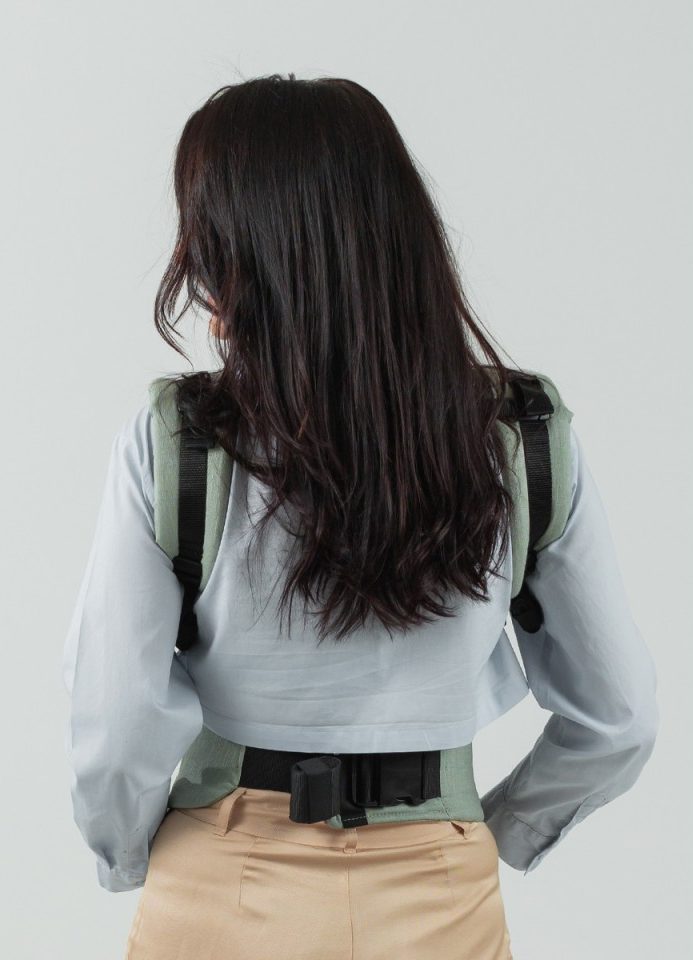 - Spännet som sitter bak i ryggen, mellan dina skulderblad, förhindrar att axelremmarna glider av dina axlar, den kan justeras i höjd för att sitta bekvämt oavsett om du bär på mage eller rygg. Den går också att ta av om du bär med korsade axelremmar eller på höften.