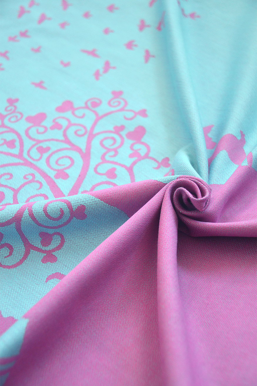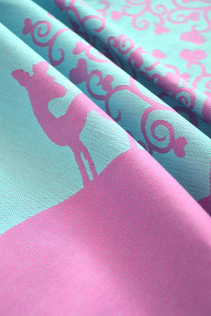 Erna in Wonderland är en sjal i härligt turkos och rosa färg. Motivet är sagolikt med sitt “wonderland-träd” och söta rådjur lekandes intill och flygande fåglar.
