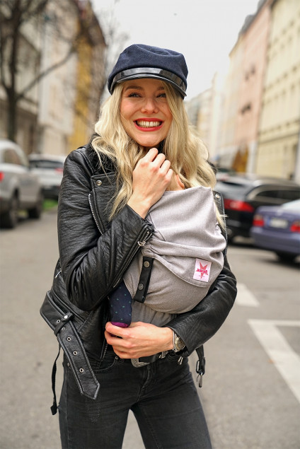 En stilrent snygg bärsele i grå färg, tillverkad av 100 % ekologisk bomull, mjuk och skönt för ditt barn.