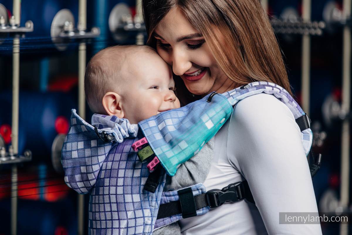 Flera olika möjligheter vad gäller inställningar av band och spännen, allt för en optimal passform för din bebis och dig som bärare. Du kan bära ditt barn på mage eller rygg. Ett trepunktsspänne i höftbältet förhindrar oavsiktlig öppning. Fyrvägs-justerbara axelremmar, som kan korsas i ryggen. Panelen är profilerad, axelbanden är mjuka och vadderad. Skön stoppning vid barnets ben för optimal komfort. Höftbältet är mjukt och bekvämt. Justerbar huva i härlig “hood-modell”.