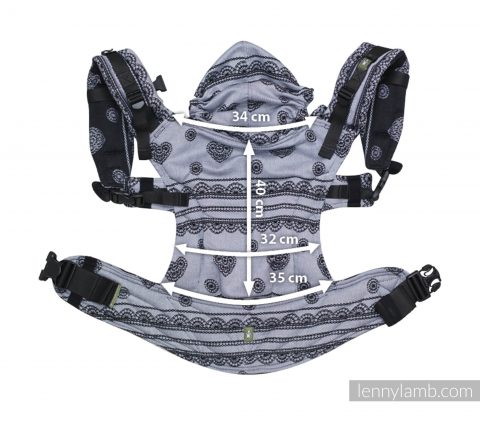 Flera olika möjligheter vad gäller inställningar av band och spännen, allt för en optimal passform för din bebis och dig som bärare. Du kan bära ditt barn på mage eller rygg. Ett trepunktsspänne i höftbältet förhindrar oavsiktlig öppning. Fyrvägs-justerbara axelremmar, som kan korsas i ryggen. Panelen är profilerad, axelbanden är mjuka och vadderad. Skön stoppning vid barnets ben för optimal komfort. Höftbältet är mjukt och bekvämt. Justerbar huva i härlig “hood-modell”.