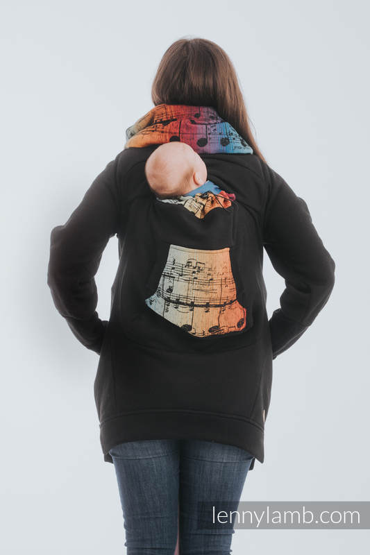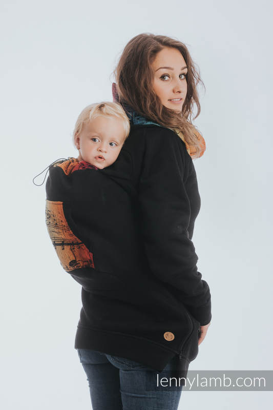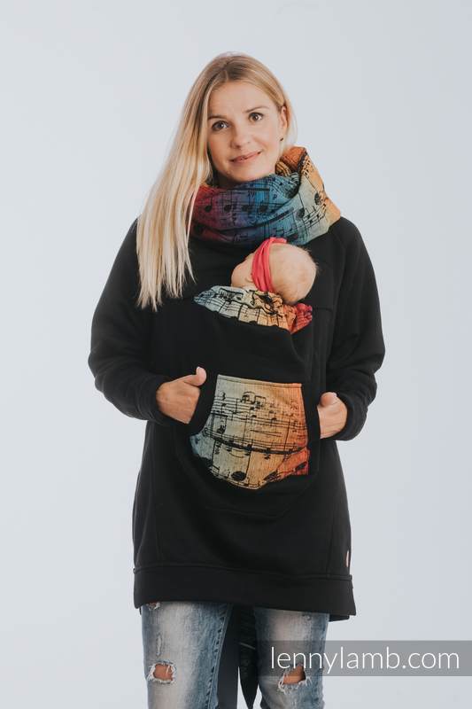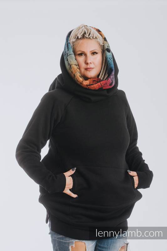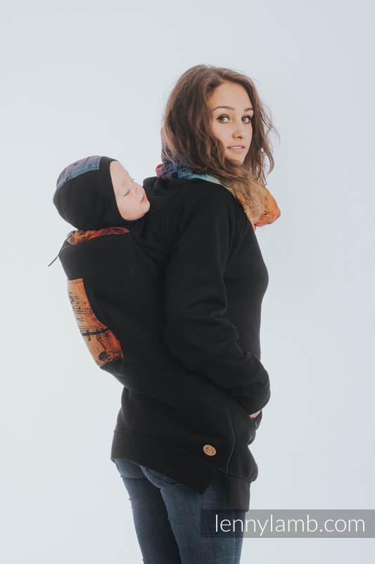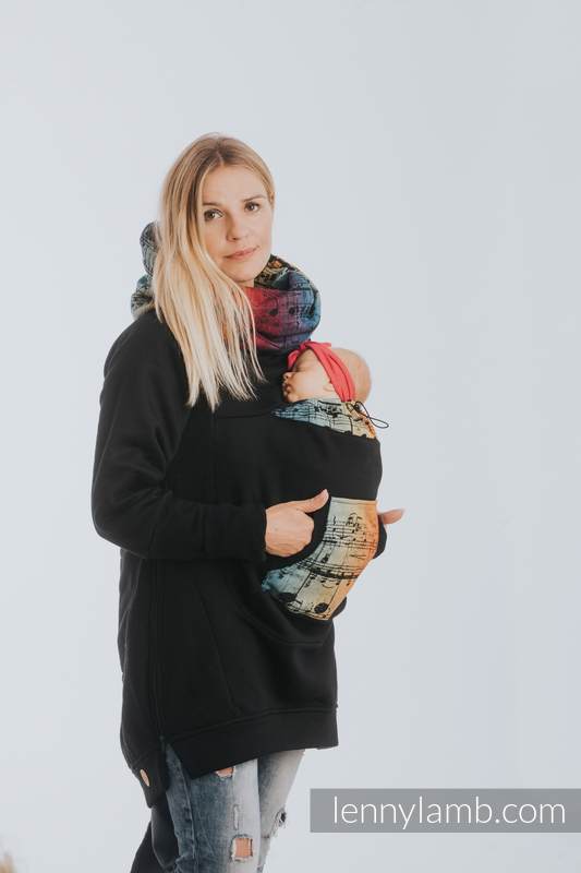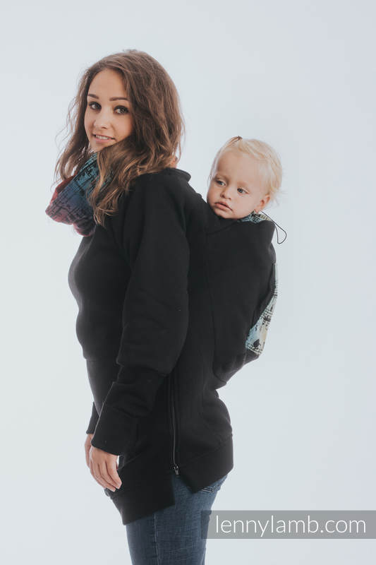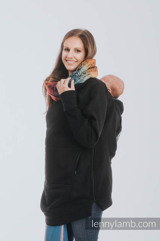 En bärtröja i bomullstyg med snygga detaljer, en skön krage som går att använda som huva, skönt till blåsiga eller lite kyligare dagar. En dragkedja i vardera sida gör den enkel att få på. Denna modell är unisex, passar lika bra på kvinnor som män. Du kan använda den både när du bär på mage och rygg, bara ta på den ”bak och fram” när du bär ditt barn på rygg. Krage och tyget vid fickan är av sjaltyget Symphony Rainbow Dark som är i bomull.