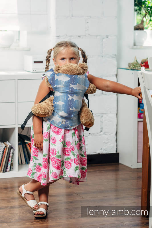 En härligt mjuk sele som passar barn som vill bära sina mjukdjur eller dockor. Samma kvalitetstyg som Lenny Lambs sjalar och bärselar.