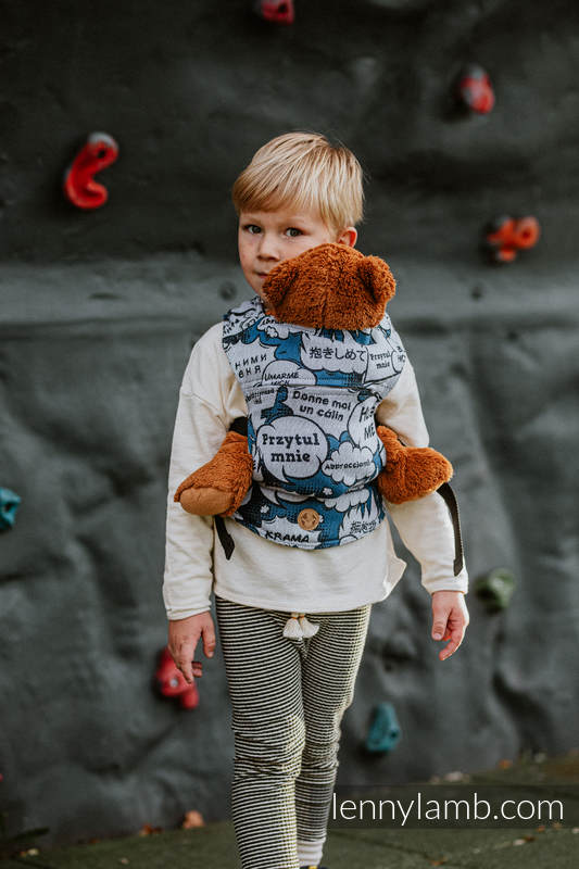 En härligt mjuk sele som passar barn som vill bära sina mjukdjur eller dockor. Samma kvalitetstyg som Lenny Lambs sjalar och bärselar.