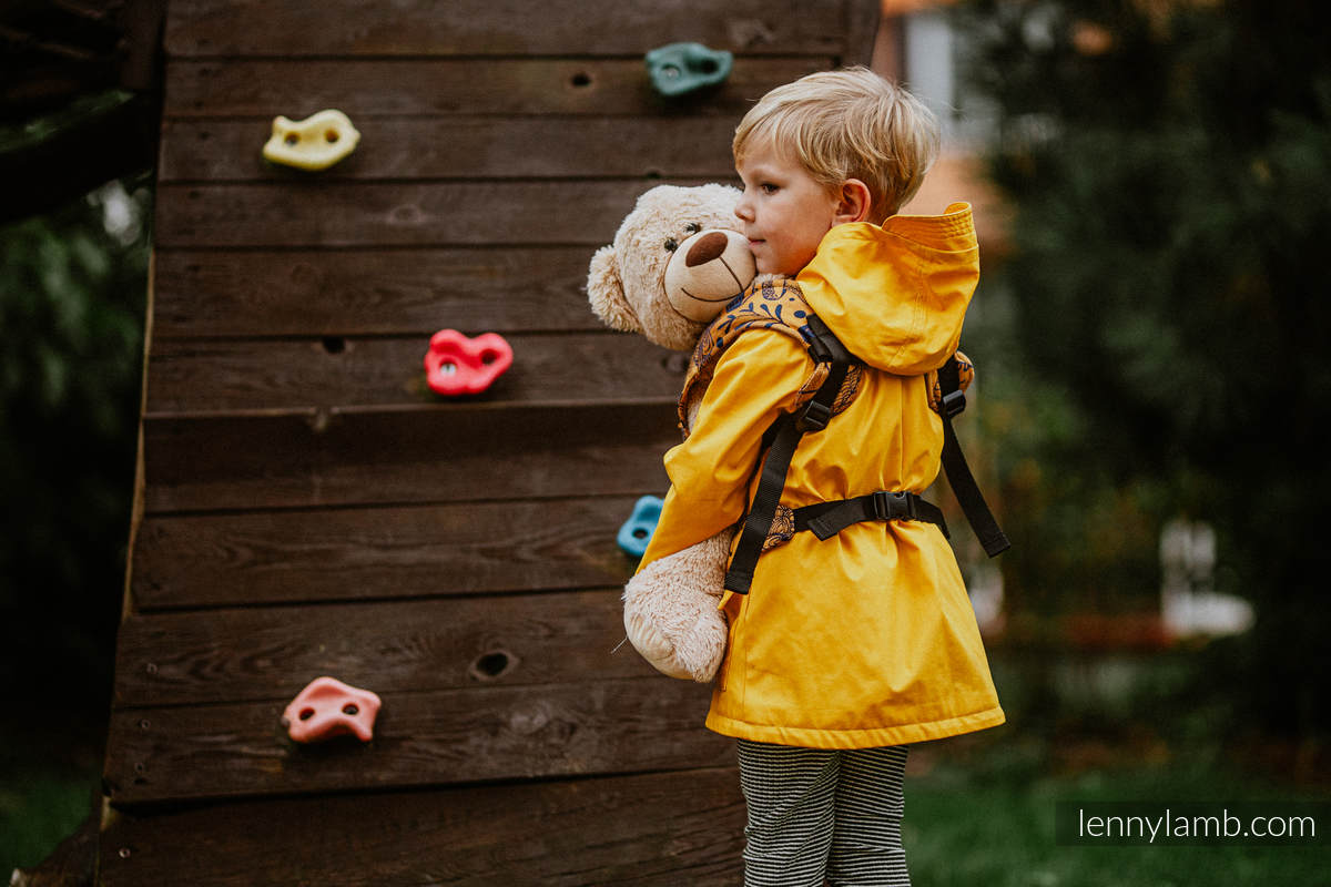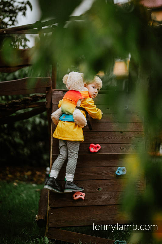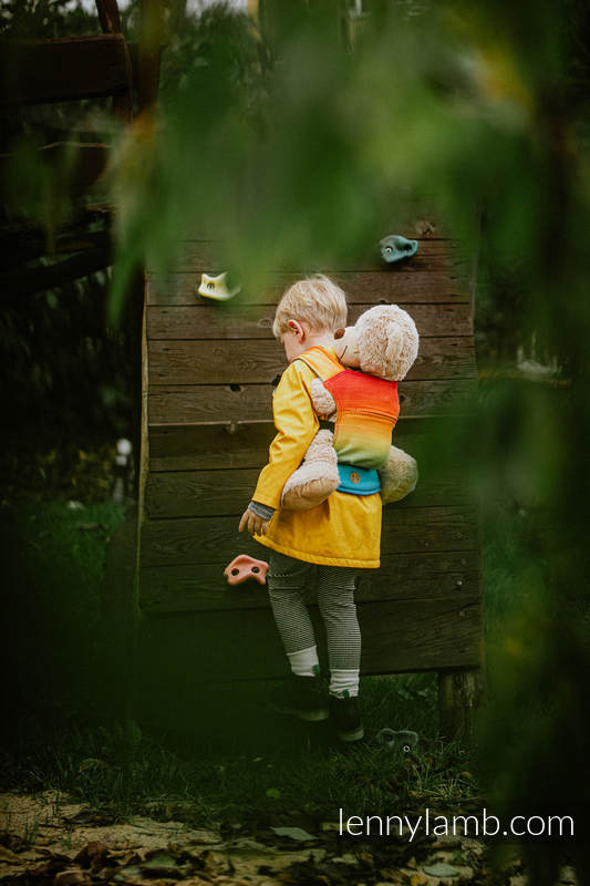 En härligt mjuk sele som passar barn som vill bära sina mjukdjur eller dockor. Samma kvalitetstyg som Lenny Lambs sjalar och bärselar.