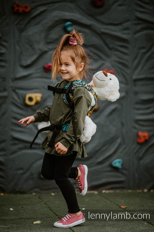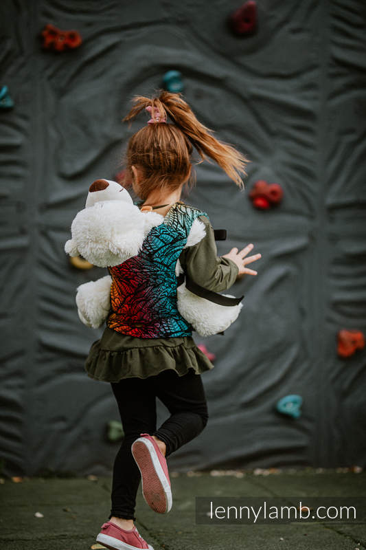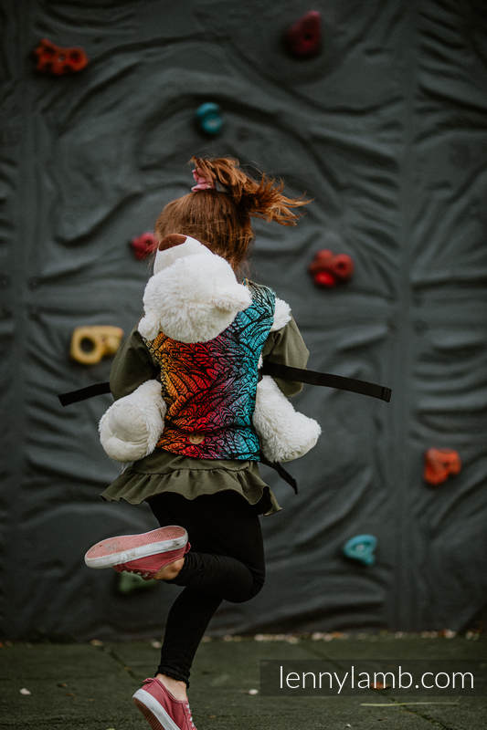 En härligt mjuk sele som passar barn som vill bära sina mjukdjur eller dockor. Samma kvalitetstyg som Lenny Lambs sjalar och bärselar.