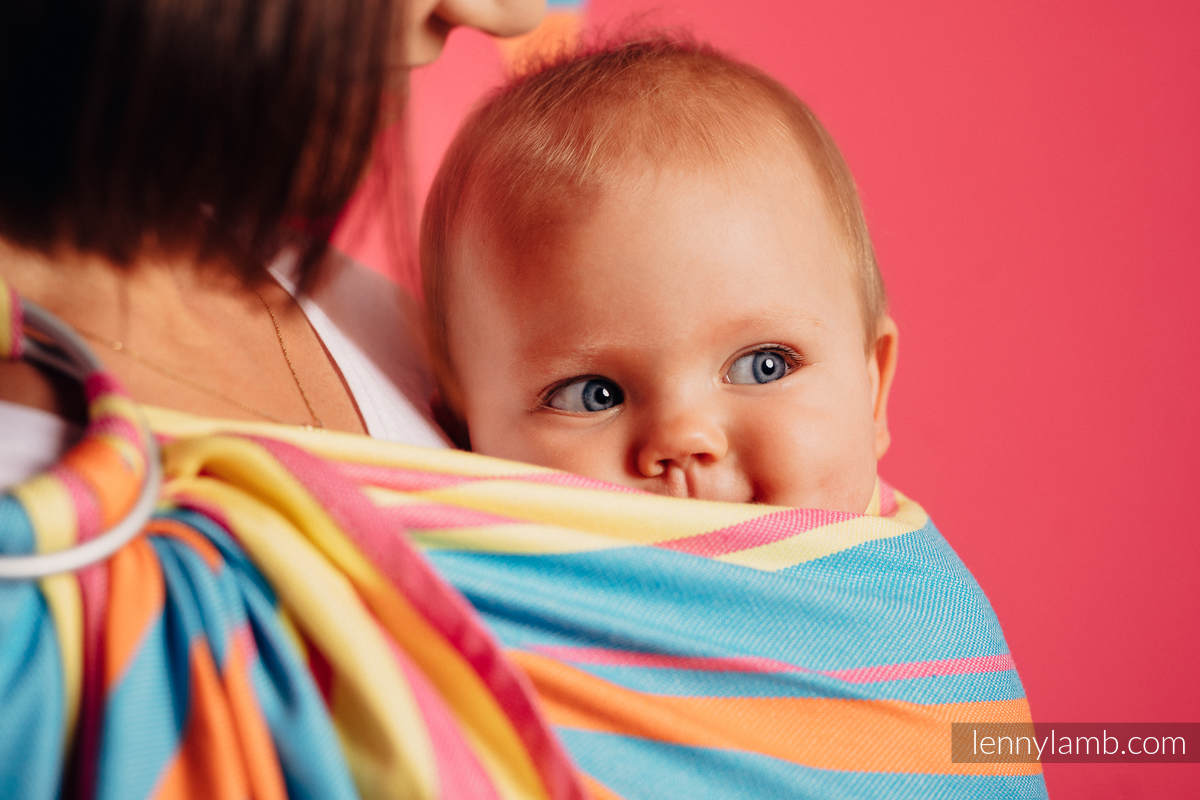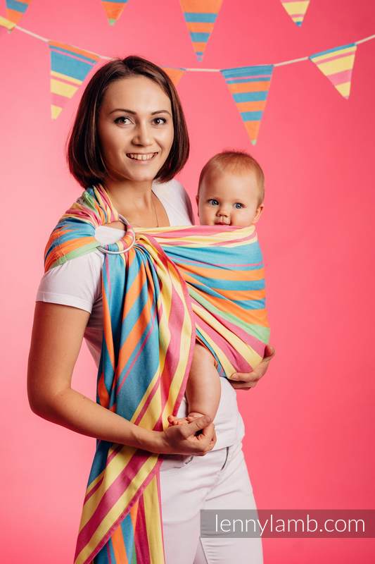 Med en ringsjal kan du snabbt och lätt bära ditt barn, du trär tyget genom ringarna, sätter i barnet och spänner enligt instruktionerna. Observera att det inte är rekommenderat att bära barnet i position “vagga” då det kan leda till att barnet inte får fria luftvägar. Lenny Lamb har som standard att tillverka ringsjalar för vänster axel.