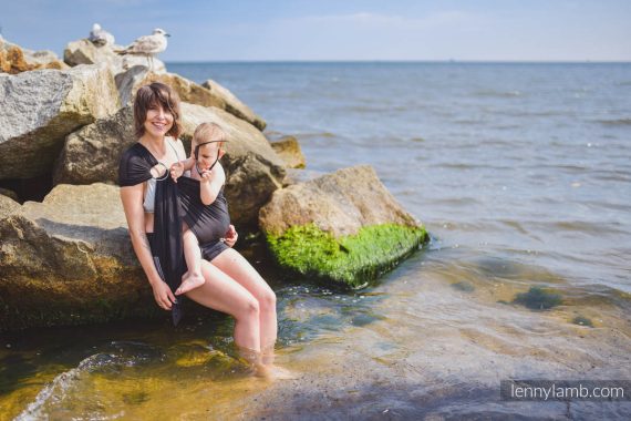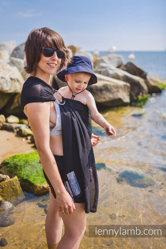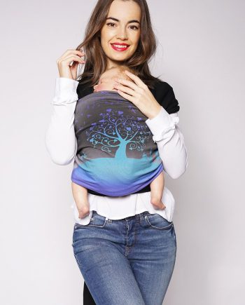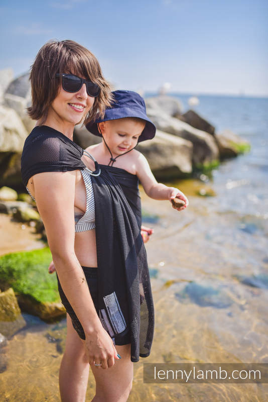 Här behöver du inte knyta, ta sjalen genom ringarna, sätt i barnet och spänn åt. Den väger nästan ingenting och tar mycket lite plats i packningen.