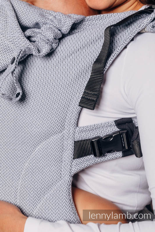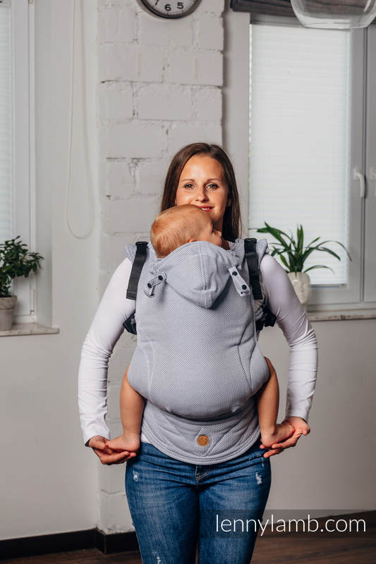 Flera olika möjligheter vad gäller inställningar av band och spännen, allt för en optimal passform för din bebis och dig som bärare. Du kan bära ditt barn på mage eller rygg. Ett trepunktsspänne i höftbältet förhindrar oavsiktlig öppning. Fyrvägs-justerbara axelremmar, som kan korsas i ryggen. Panelen är profilerad, axelbanden är mjuka och vadderad. Skön stoppning vid barnets ben för optimal komfort. Höftbältet är mjukt och bekvämt. Justerbar huva i härlig ”hood-modell”.