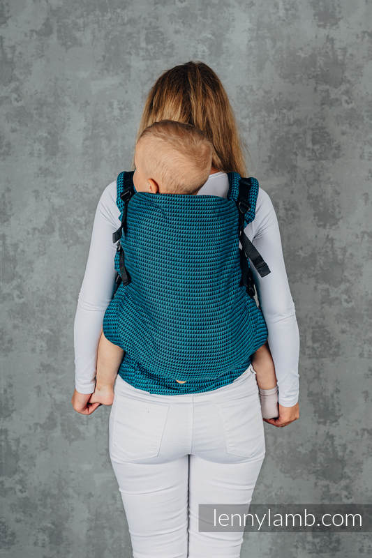 Panelen som håller upp ditt barn är justerbar höjd och bredd, den är profilerad och har benstoppning för barnets bästa komfort. Du kan bära både på mage och på rygg. För ryggbärande ska ditt barn vara stadig i nacke, rygg och bål.