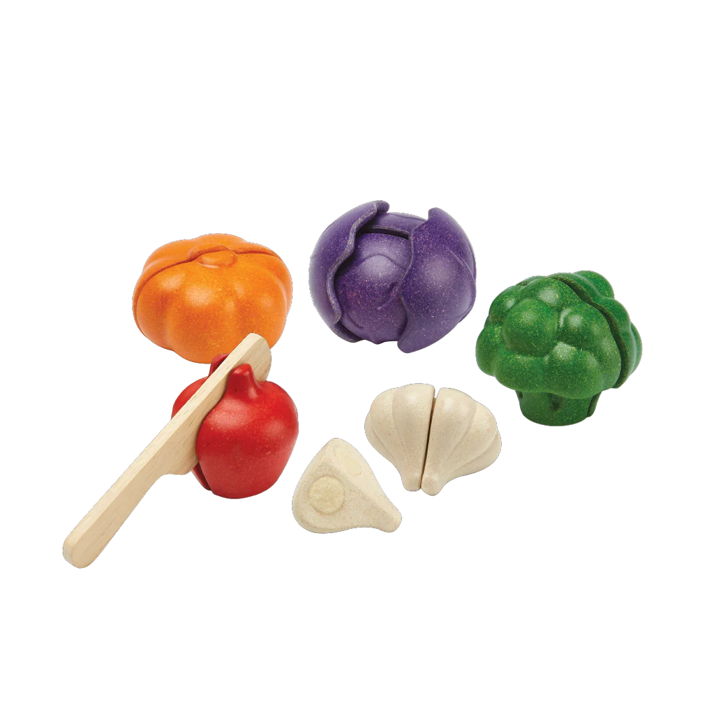 Setet innehåller 5 färgglada, skivbara grönsaker: broccoli, paprika, pumpa, vitlök och rödkål