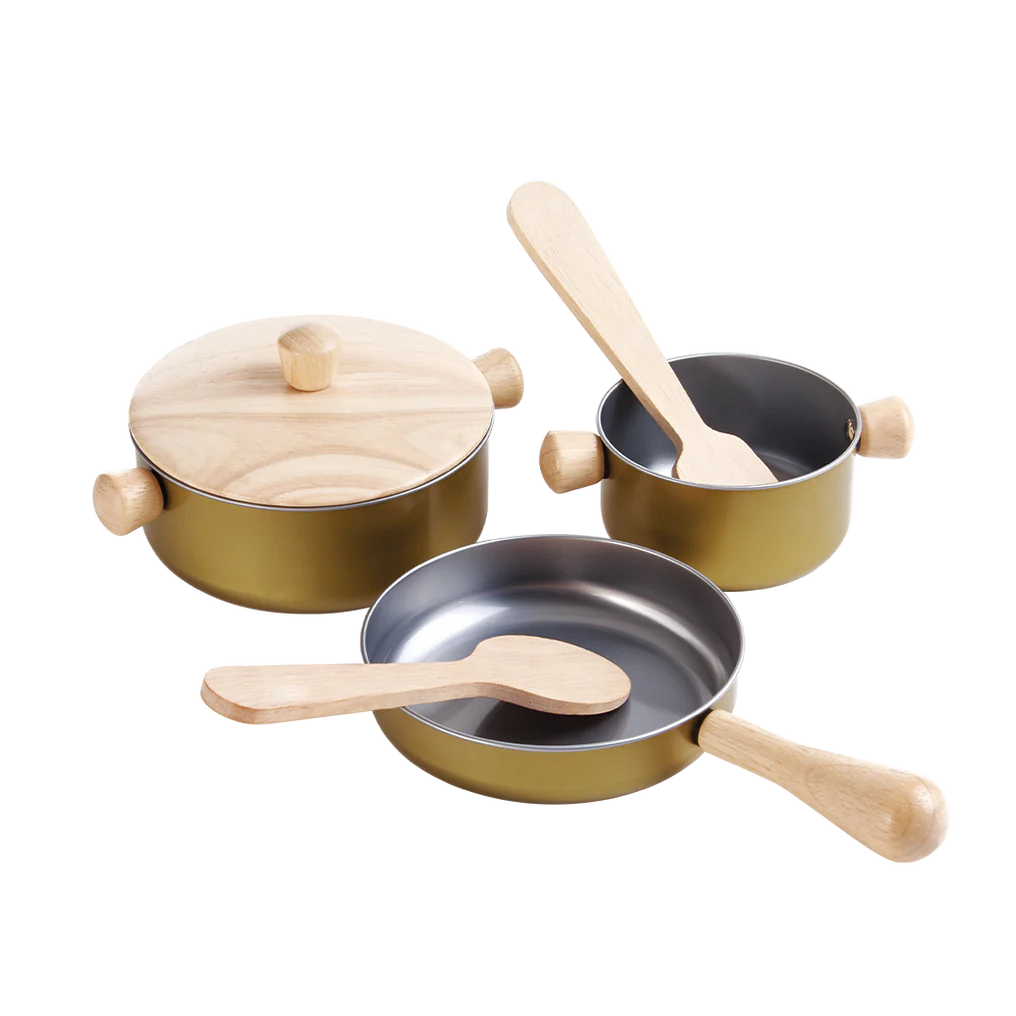 Setet innehåller en stekpanna, kastrull med lock, såskastrull, spatel och sked
