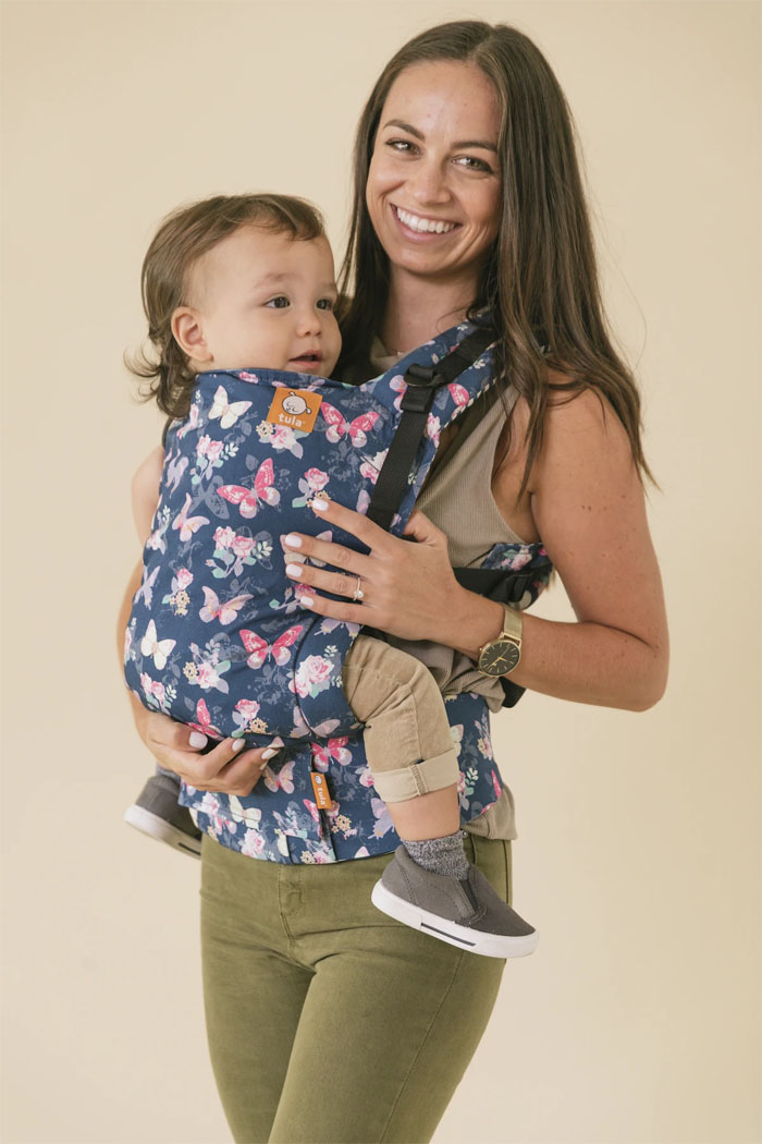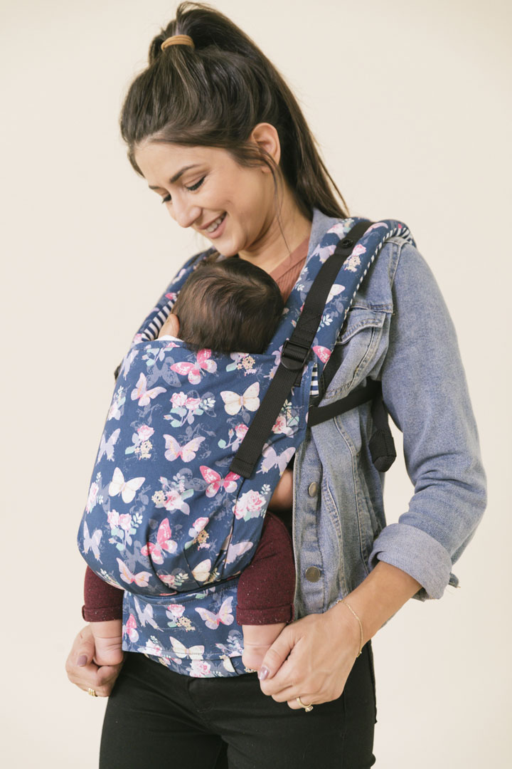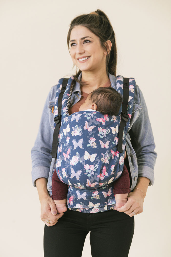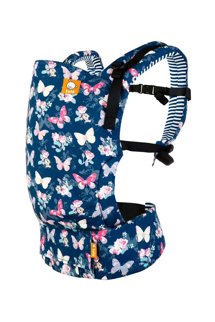 Flies with Butterflies med färgglada fjärilar som täcker bärselen gör varje dag lite extra härlig. Mönstret fortsätter över bärselens axelremmar, midjebälte och den avtagbara huvan