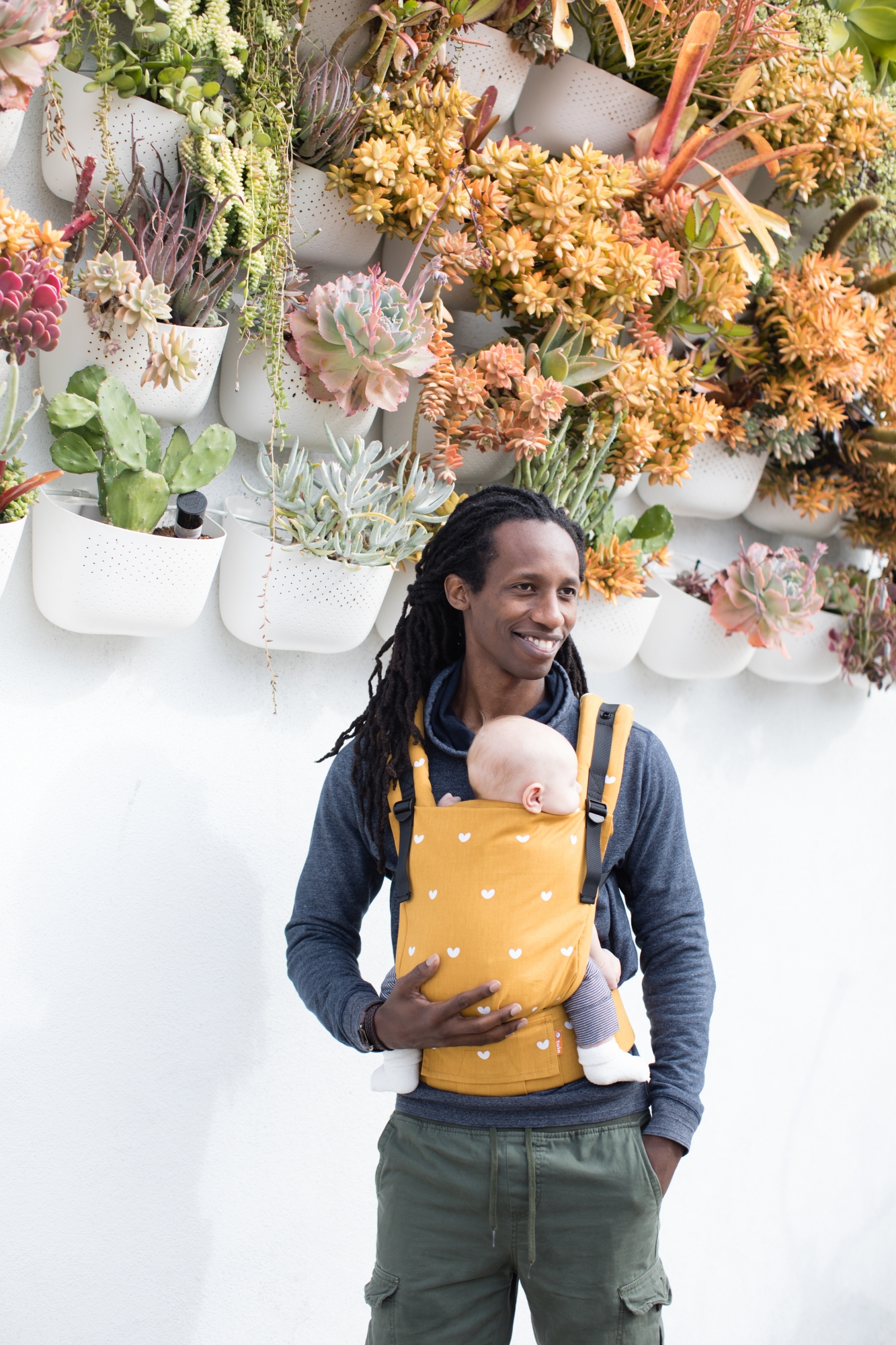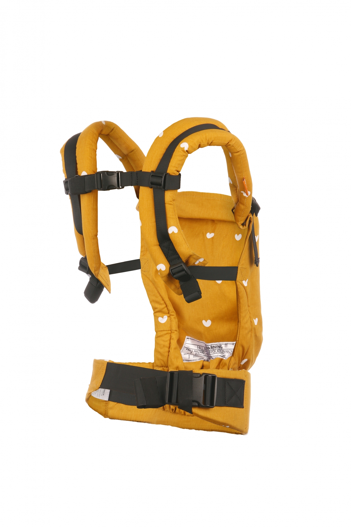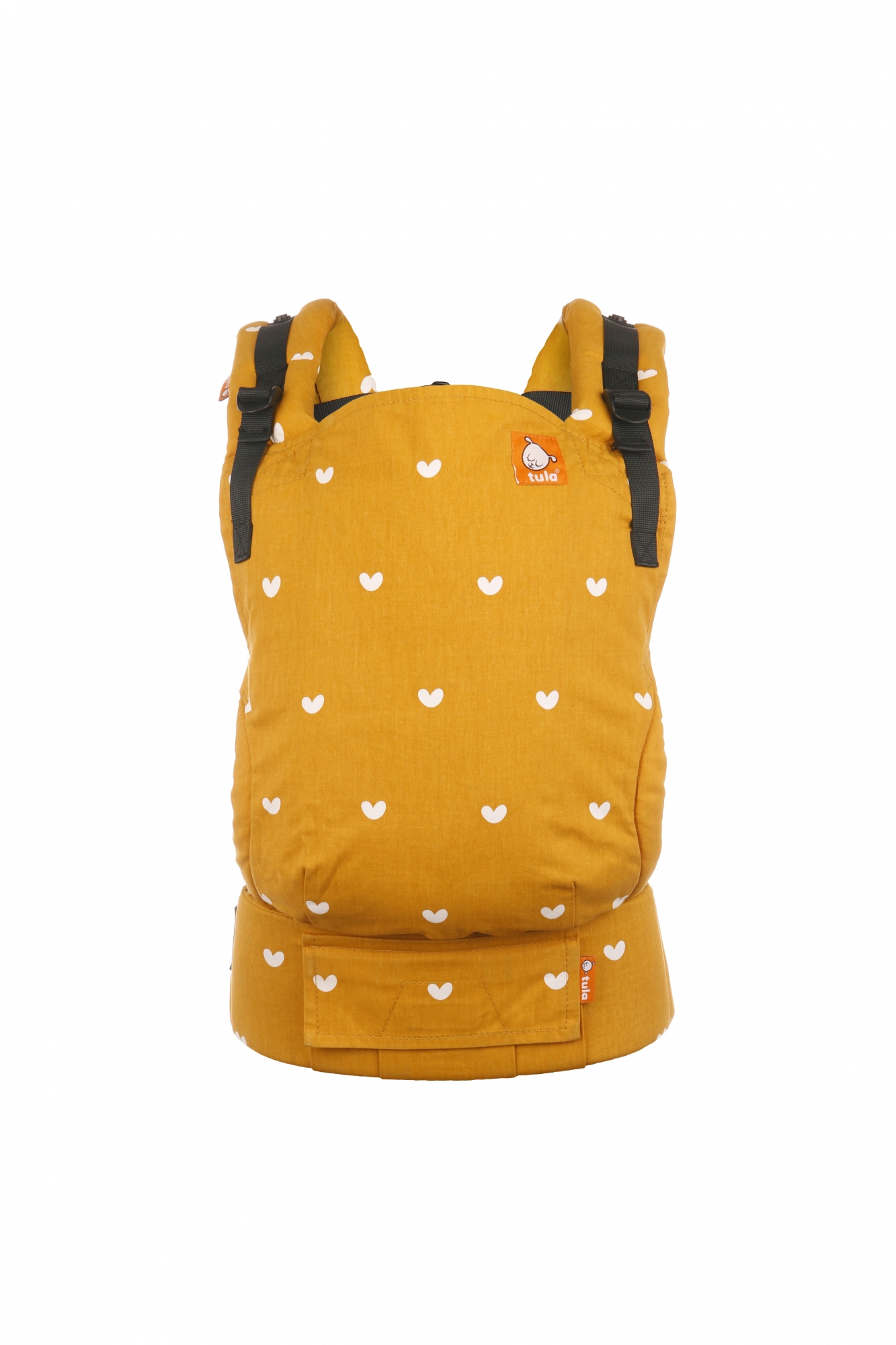 Play är gul och har ett rofullt mönster av vita hjärtan som dekorerar hela bärselen.