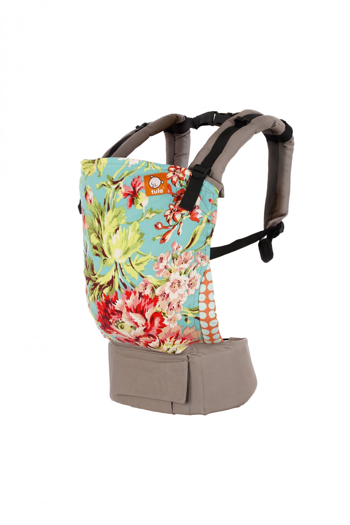 Höftbältet och axelremmarna på Tula Bliss Bouquet är ljusgrå. Observera att mönstrets placering kan skilja sig från denna produktbild. Med selen ingår en instruktionsbroschyr på engelska samt en avtagbar huva.