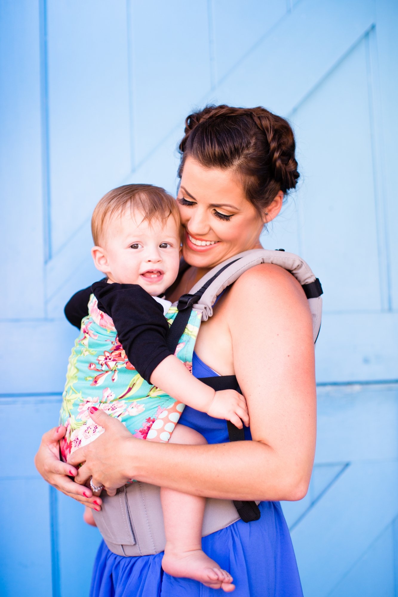Selen har extra vaddering vid barnets knäveck och bärarens axlar, för bättre komfort.