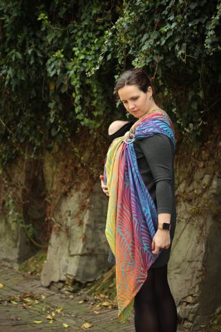 Yaro Dandy Fire Grad Aqua Tencel – Materialblandningen bomull/tencel erbjuder inte bara ett vackert skimmer utan också goda egenskaper för knyt. Den är mjuk redan från början, lätt att knyta med och känns sval och lätt mot kroppen. Passar bra för varma dagar. Passar från nyfödd upp till dina egna preferenser. Maskintvättbar på mild cykel.