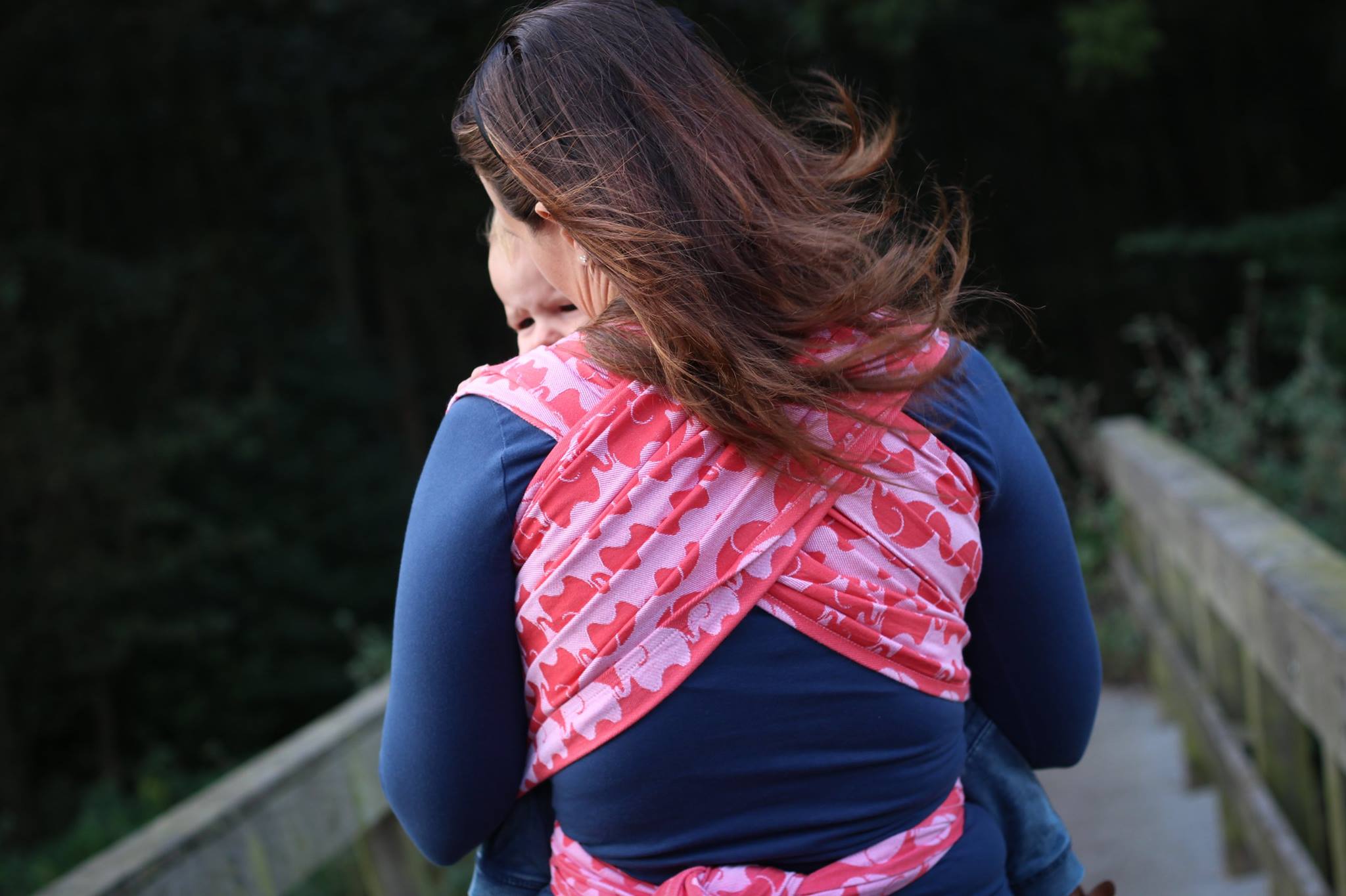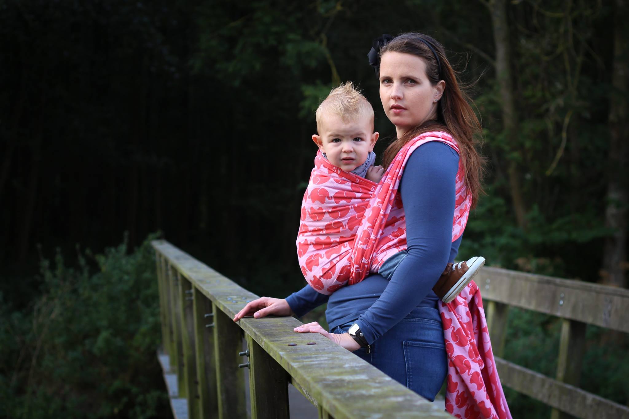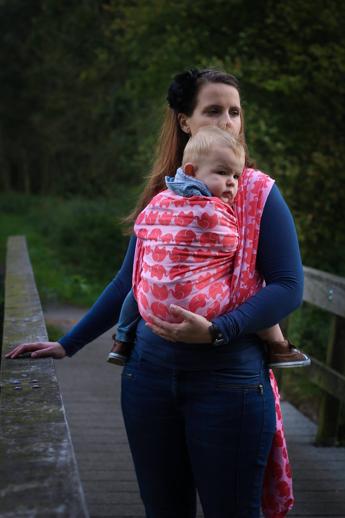 Yaro Elephants Hot-Coral White Organic – Lekfull och vacker GOTS-märks sjal. Medium-tjock, bryts in bra utan att förlora sitt fina grepp. Passar för nyfödd upp till toddlers. Enkel att knyta med.