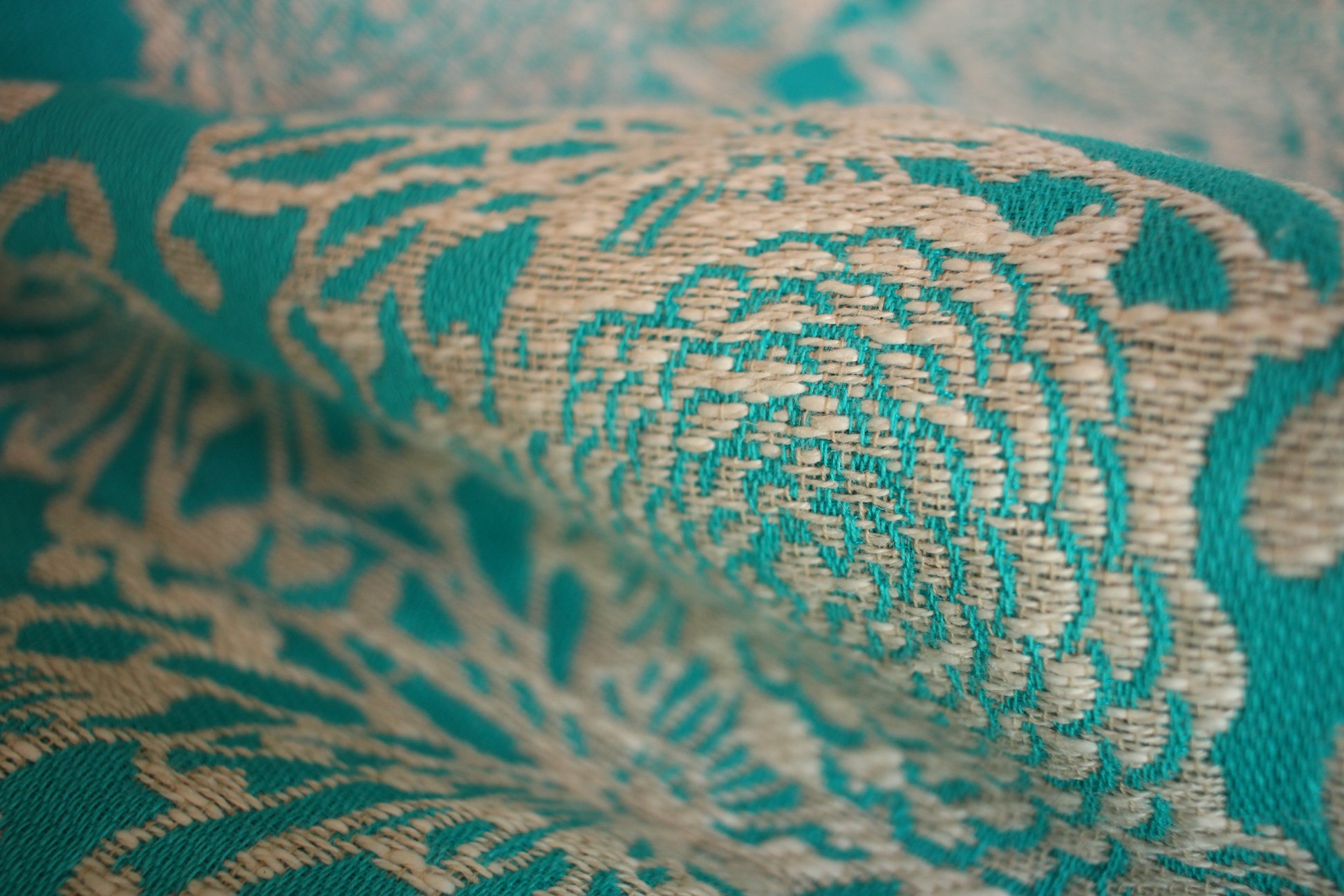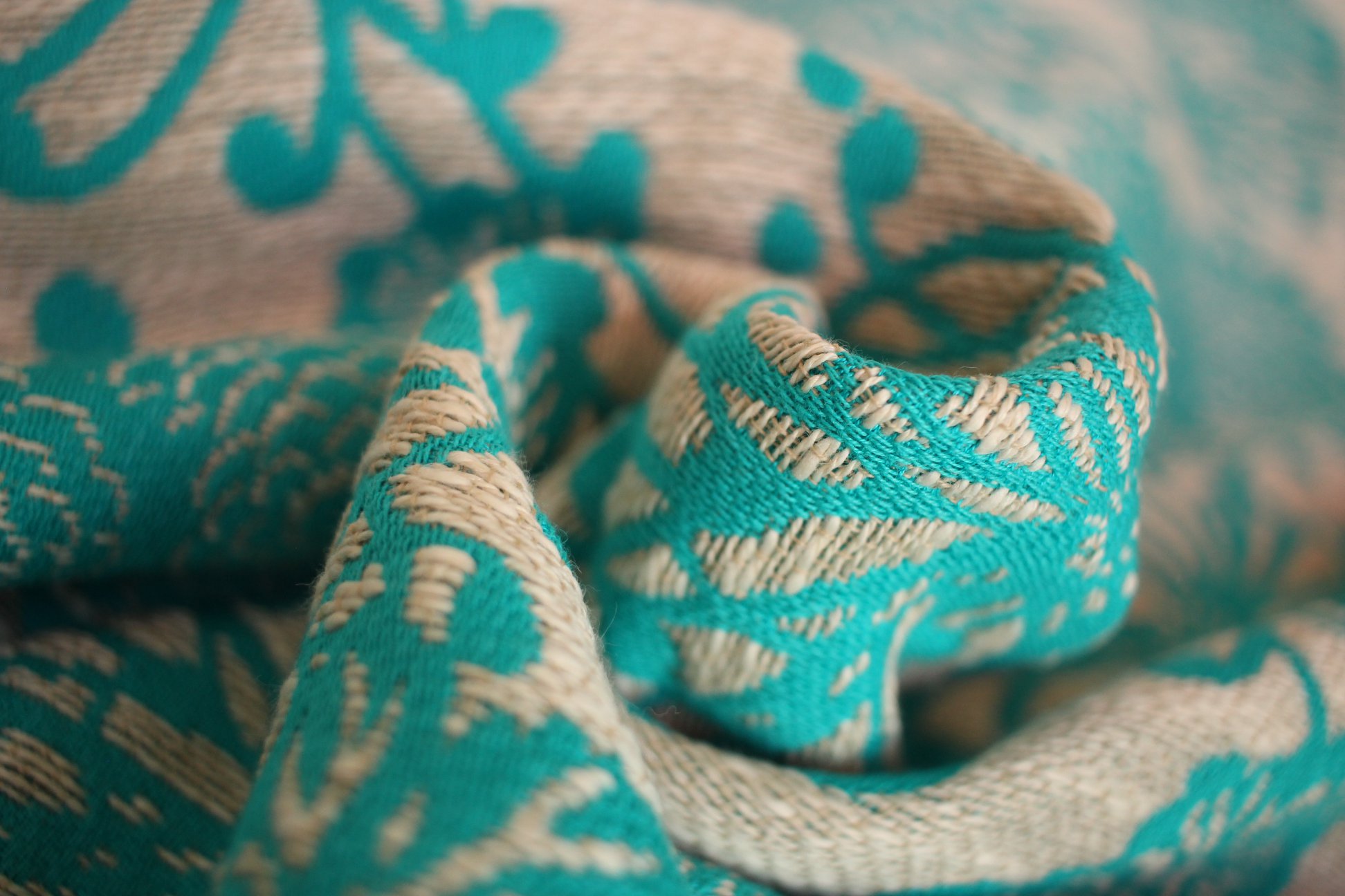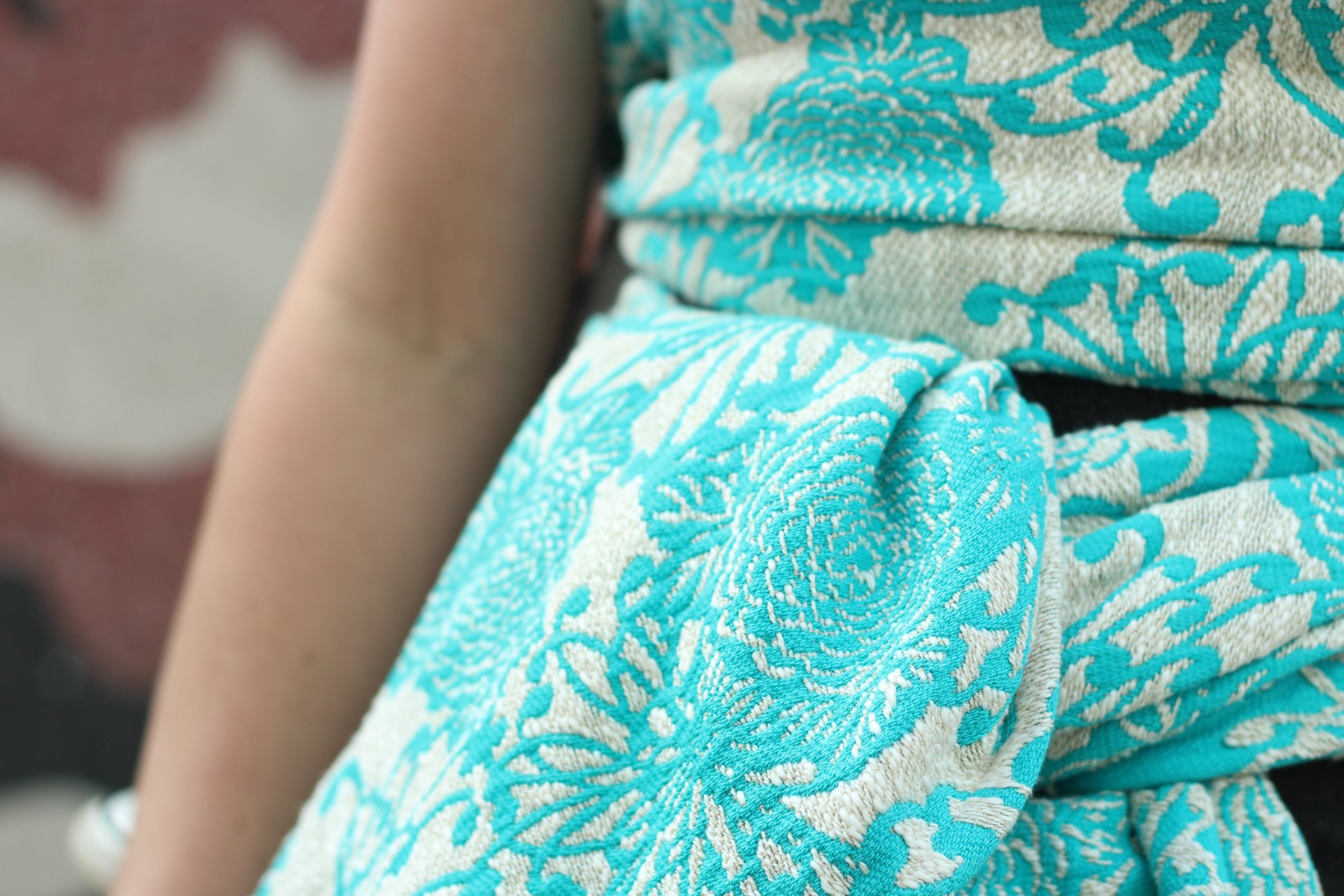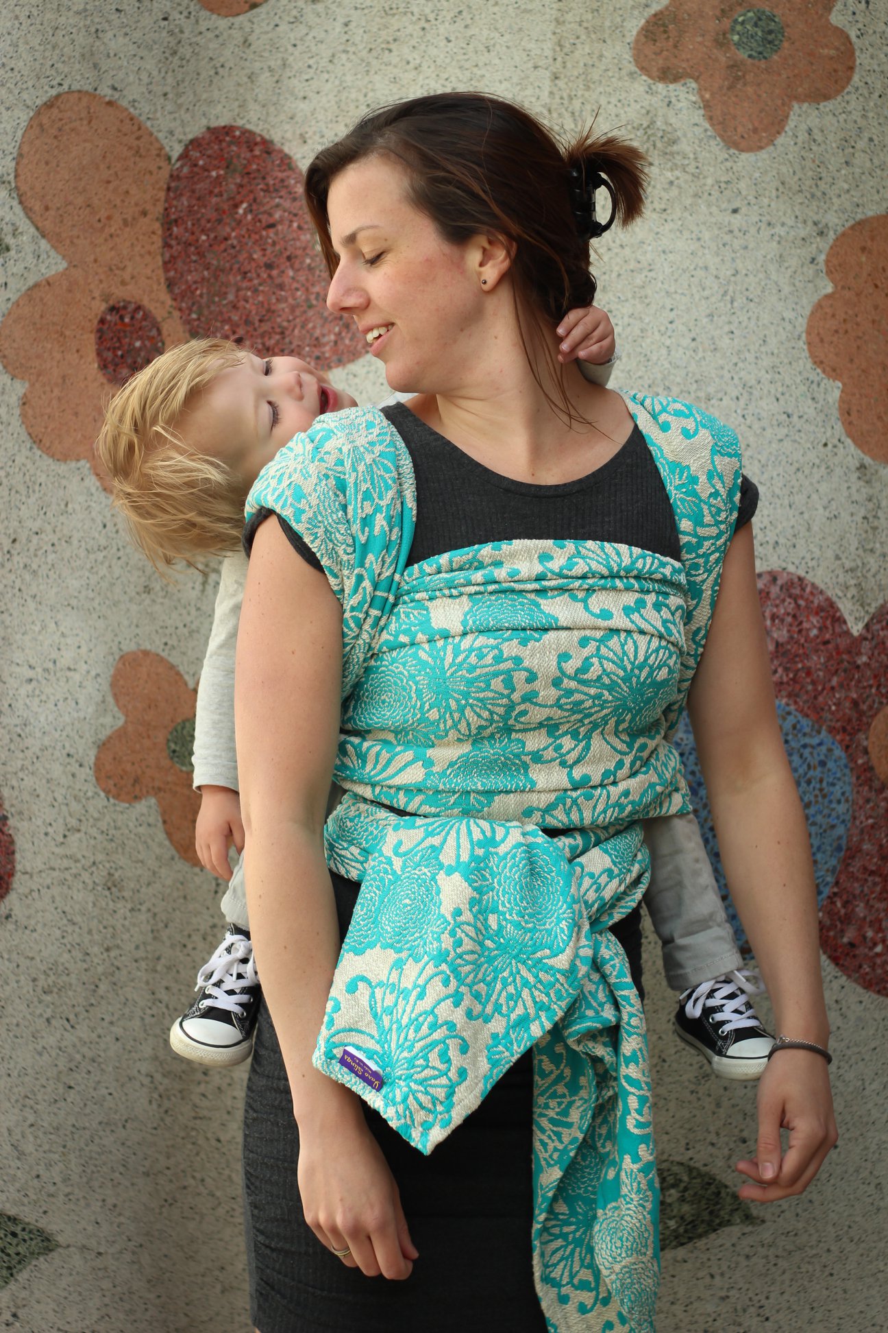 Yaro Chrys Puffy Aqua Natural Hemp – Vacker sjal i härliga nyanser. Det puffiga garnet i sjalen ger en hel del karaktär och ett unikt utseende. Måttlig inbrytningstid krävs, men redan efter första strykningen märks skillnad. Med varje användningstillfälle blir den mjukare och fluffigare. Den känns tung och tjock i handen och har ett fantastiskt grepp. Passar för alla åldrar, men bäst från 3 månader och uppåt. Med en ringsjal kan du snabbt och lätt bära ditt barn, du trär tyget genom ringarna, sätter i barnet och spänner enligt instruktionerna.