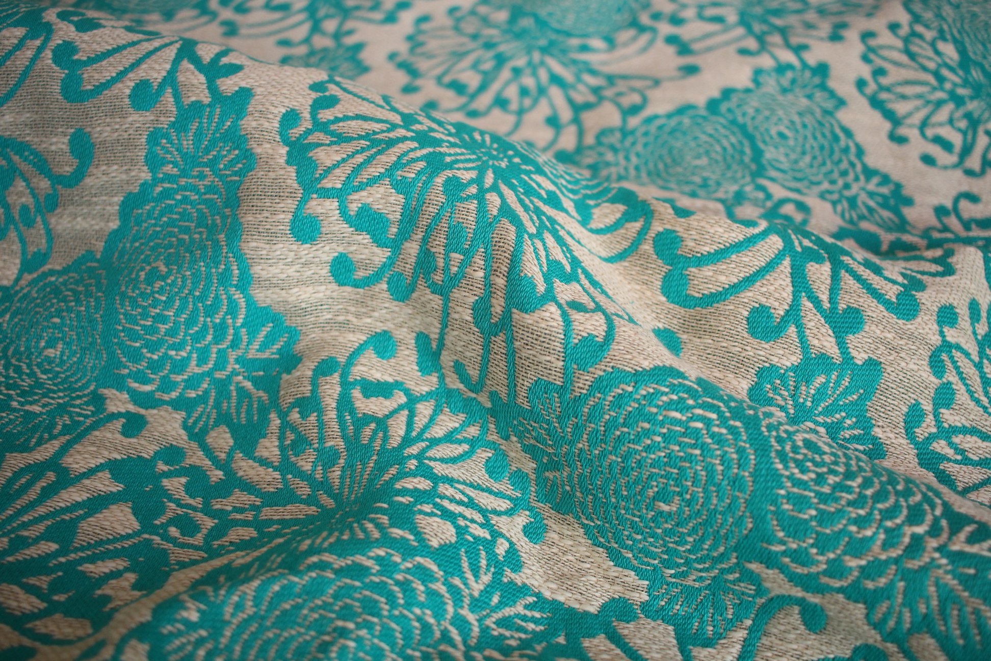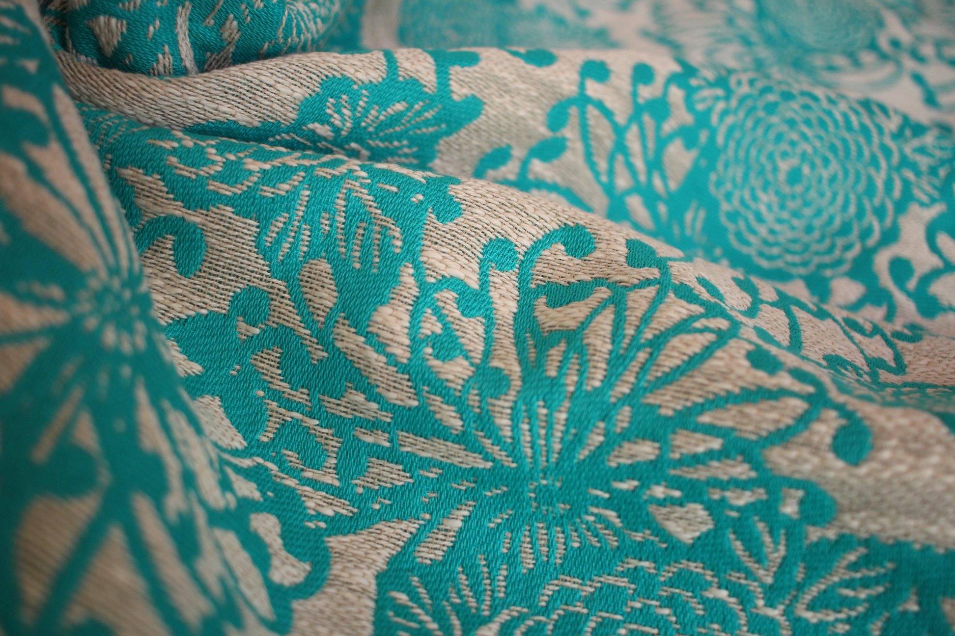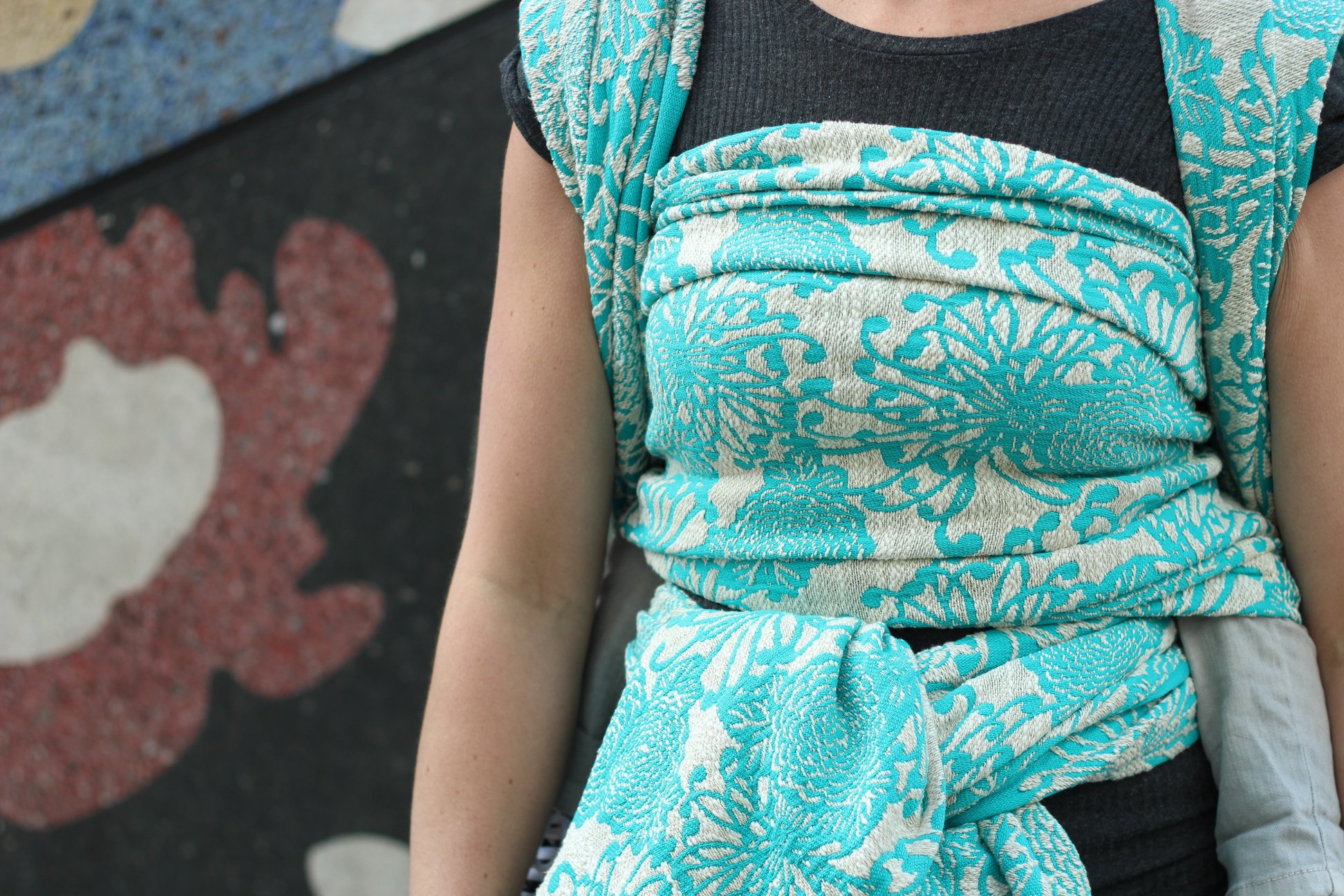 Yaro Chrys Puffy Aqua Natural Hemp – Vacker sjal i härliga nyanser. Det puffiga garnet i sjalen ger en hel del karaktär och ett unikt utseende. Måttlig inbrytningstid krävs, men redan efter första strykningen märks skillnad. Med varje användningstillfälle blir den mjukare och fluffigare. Den känns tung och tjock i handen och har ett fantastiskt grepp. Passar för alla åldrar, men bäst från 3 månader och uppåt. Med en ringsjal kan du snabbt och lätt bära ditt barn, du trär tyget genom ringarna, sätter i barnet och spänner enligt instruktionerna.