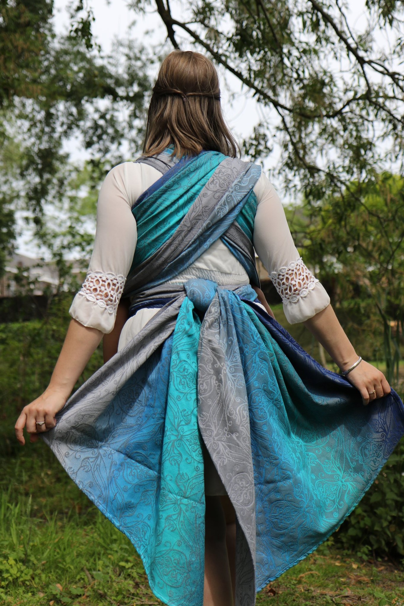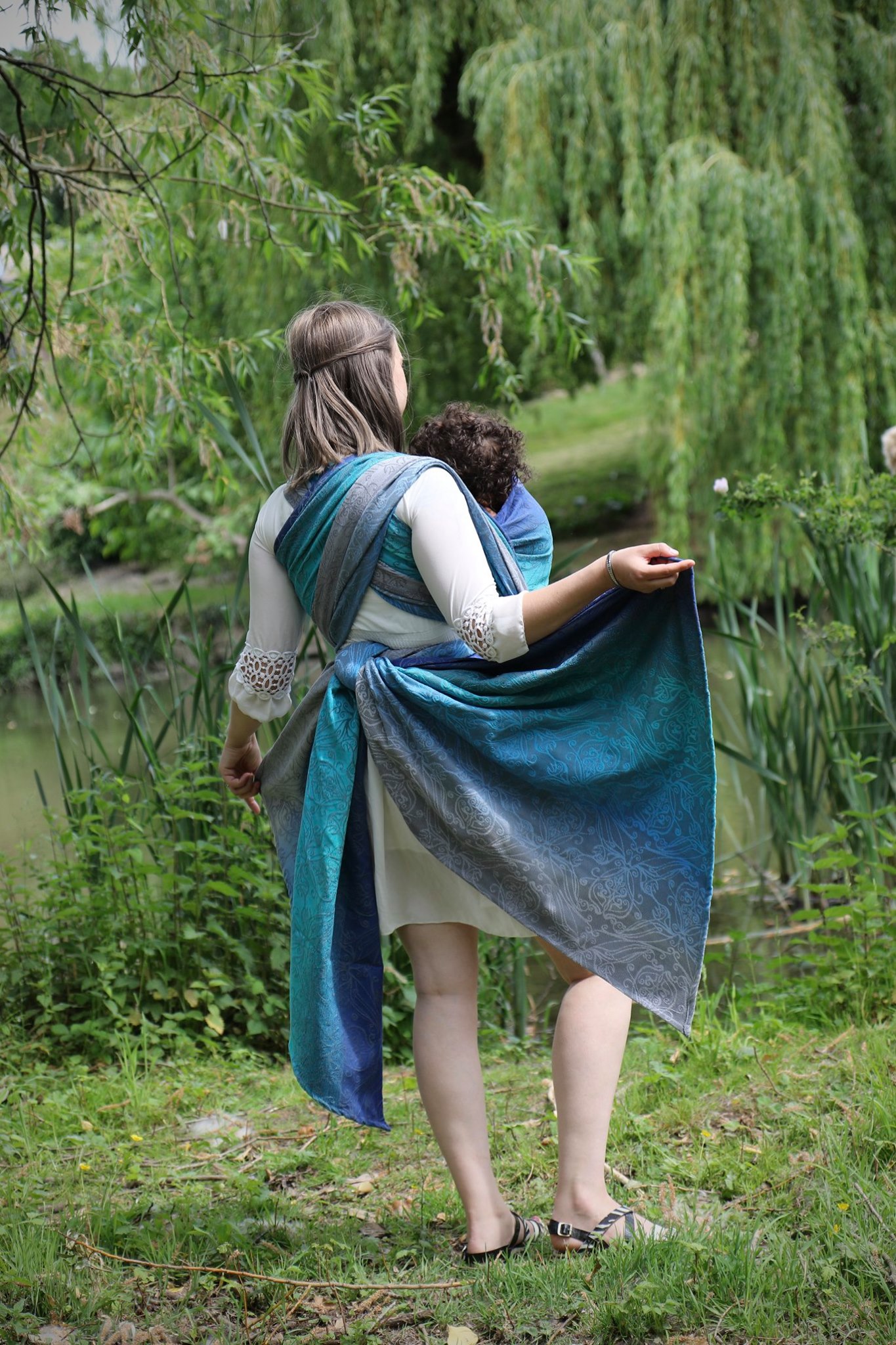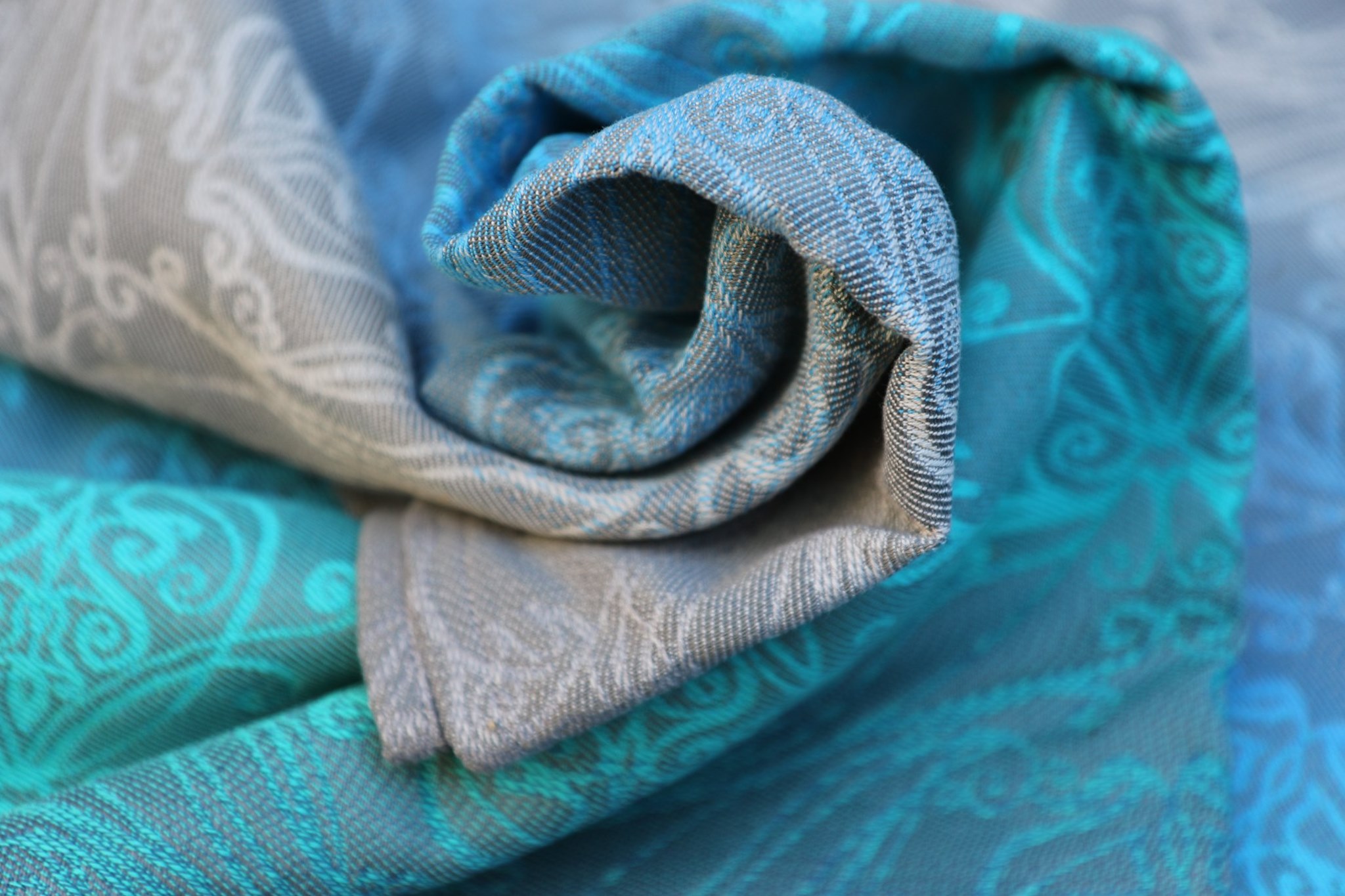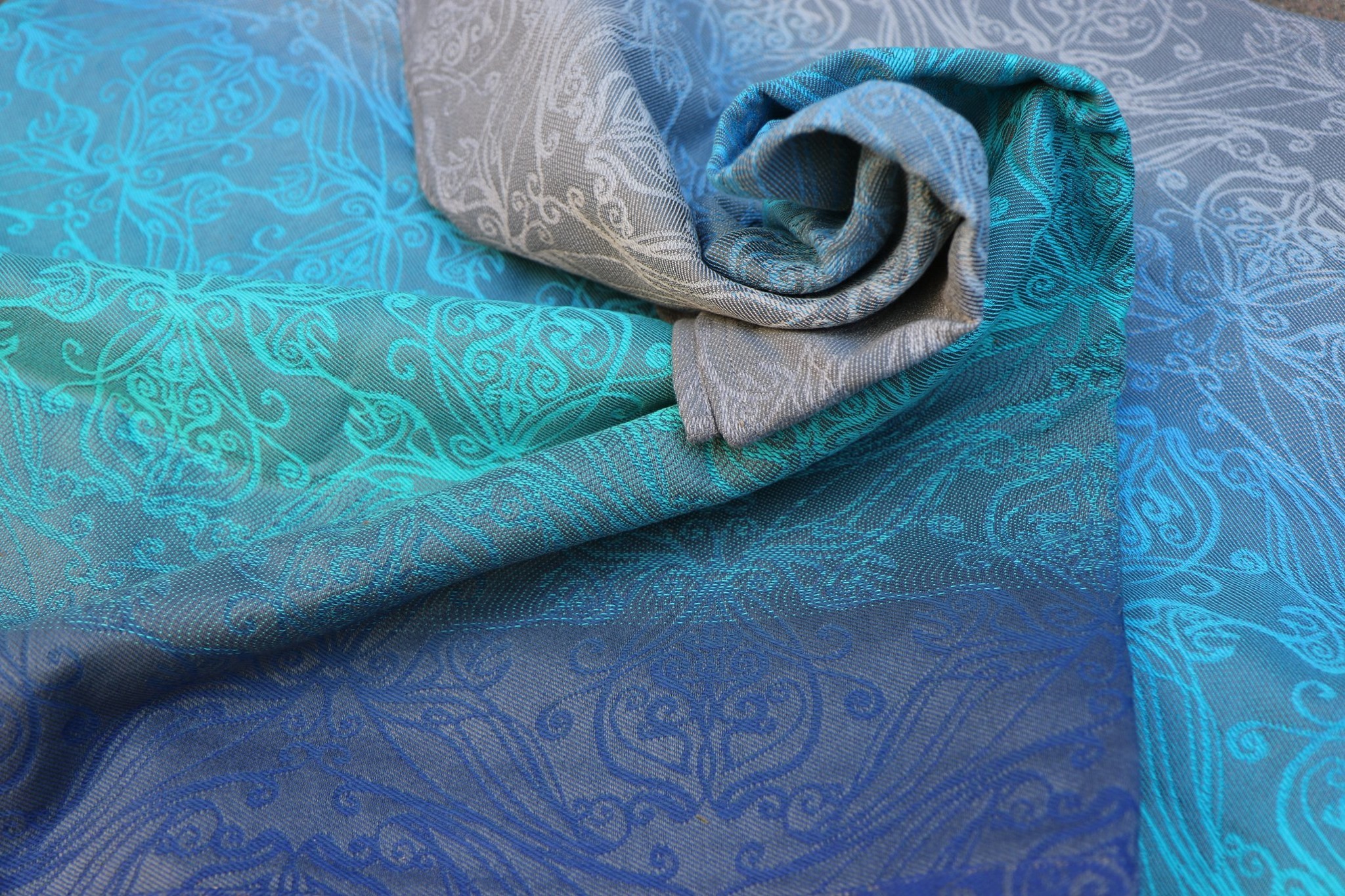 Elvish heter mönstret och det är ett av Yaros mest älskade. Denna variant har en vacker färggradering i mättad blå och gröna toner mot en grå botten. Repreve gör sjalen stark och att den får en vacker silkig glans som verkligen kommer till sin rätt ute en solig dag. Det är en mediumtjock sjal som gör att den passar för nyfödda såväl större barn. Den kräver lite tid för att bli inbruten och mjuk, men när den väl är inbruten blir den riktigt mjuk. Materialblandningen av bomull och repreve är värmereglerande, vilket gör att den värmer under kallare förhållanden och känns sval när det är varmt ute. Den är också naturligt vattenavstötande, den har starka fibrer som ger god avlastning. Repreve är ett återbrukat material med riktigt bra hållbarhet. Perfekt för sommaren, men passar året runt.