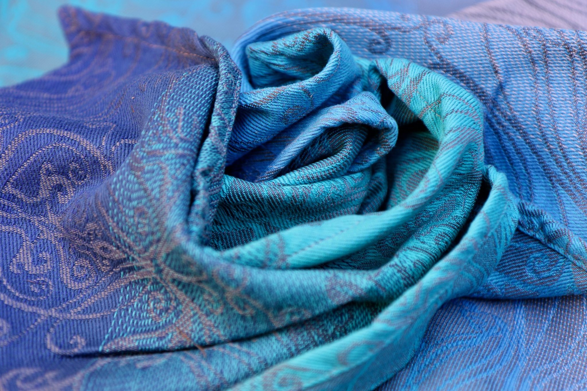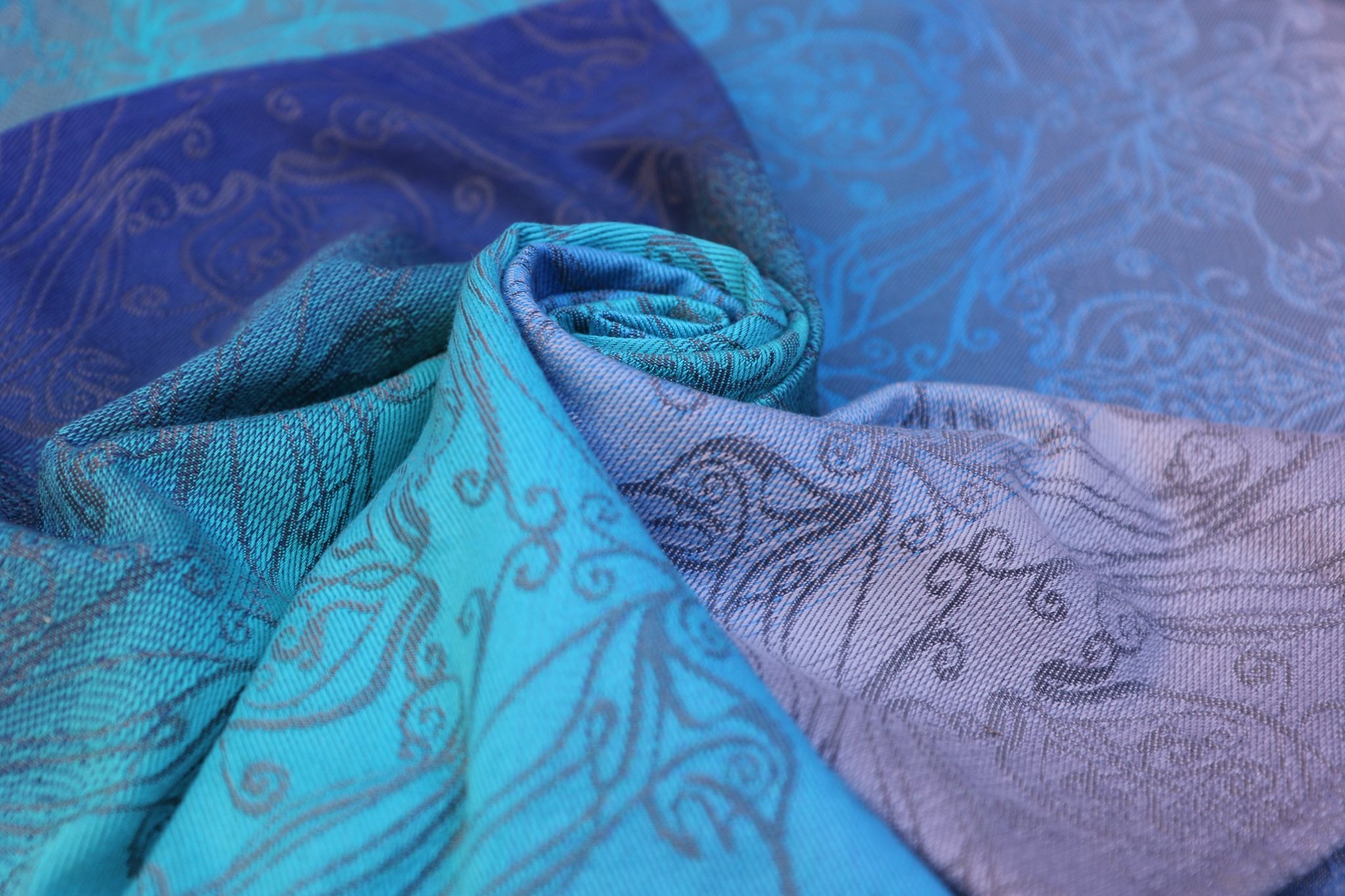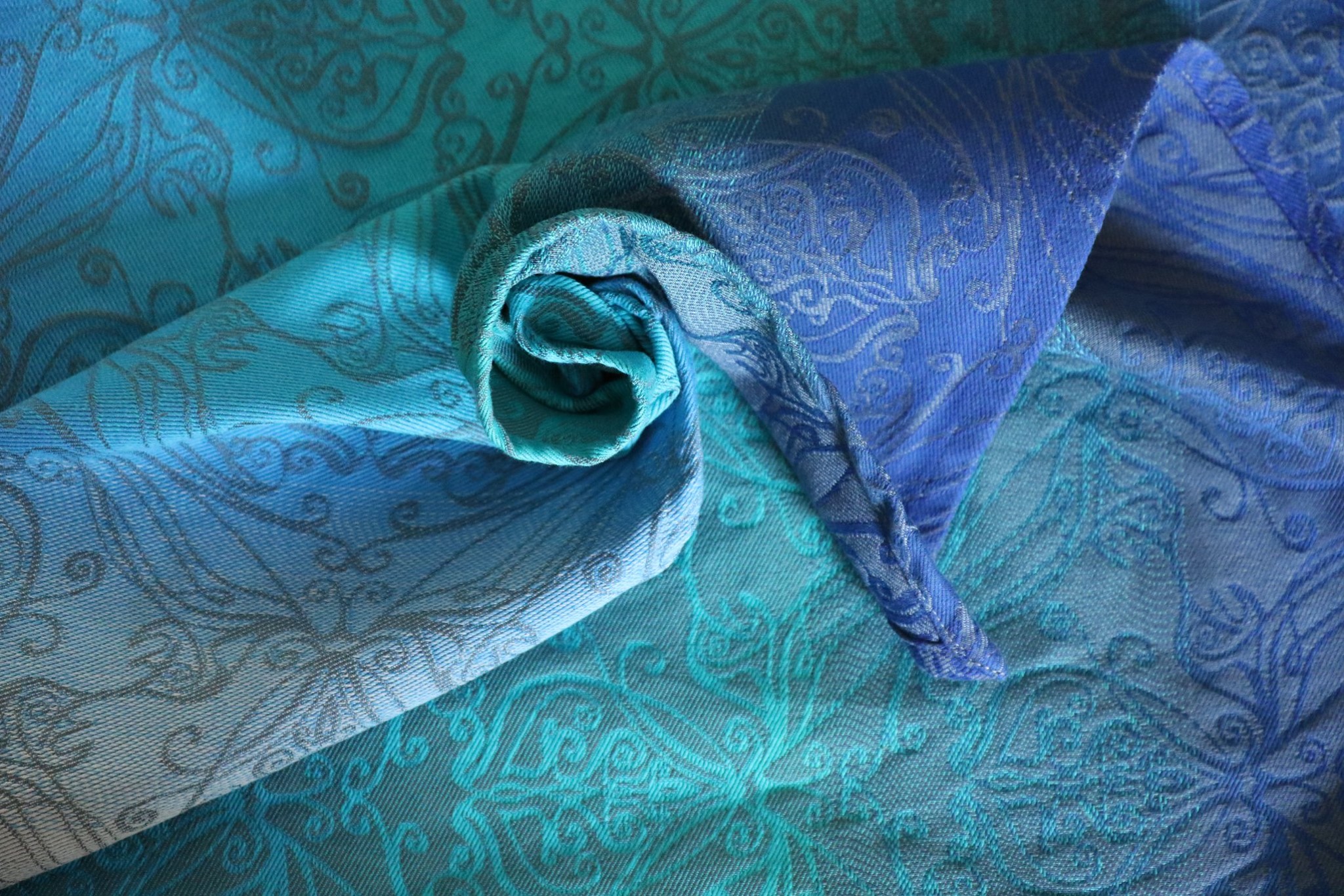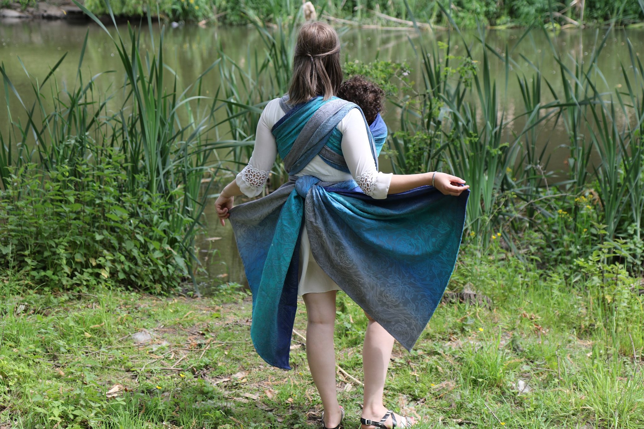 Elvish heter mönstret och det är ett av Yaros mest älskade. Denna variant har en vacker färggradering i mättad blå och gröna toner mot en grå botten. Repreve gör sjalen stark och att den får en vacker silkig glans som verkligen kommer till sin rätt ute en solig dag. Det är en mediumtjock sjal som gör att den passar för nyfödda såväl större barn. Den kräver lite tid för att bli inbruten och mjuk, men när den väl är inbruten blir den riktigt mjuk. Materialblandningen av bomull och repreve är värmereglerande, vilket gör att den värmer under kallare förhållanden och känns sval när det är varmt ute. Den är också naturligt vattenavstötande, den har starka fibrer som ger god avlastning. Repreve är ett återbrukat material med riktigt bra hållbarhet. Perfekt för sommaren, men passar året runt.