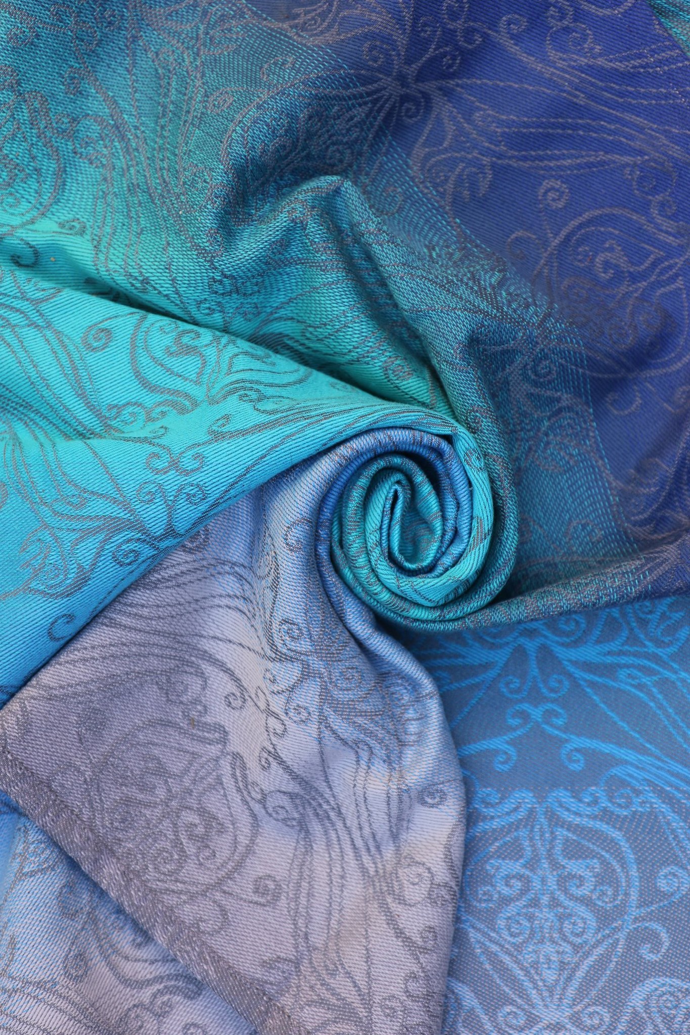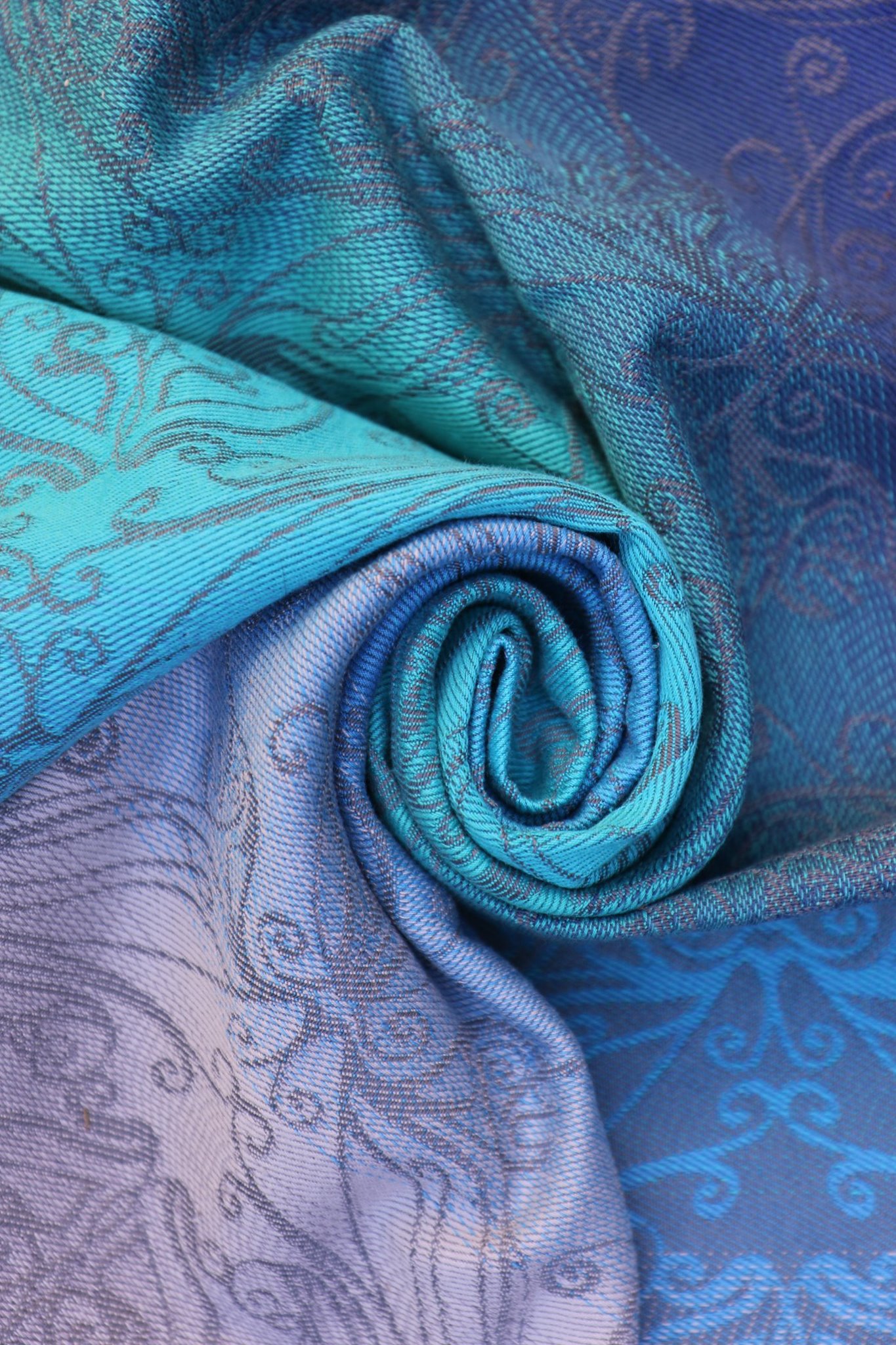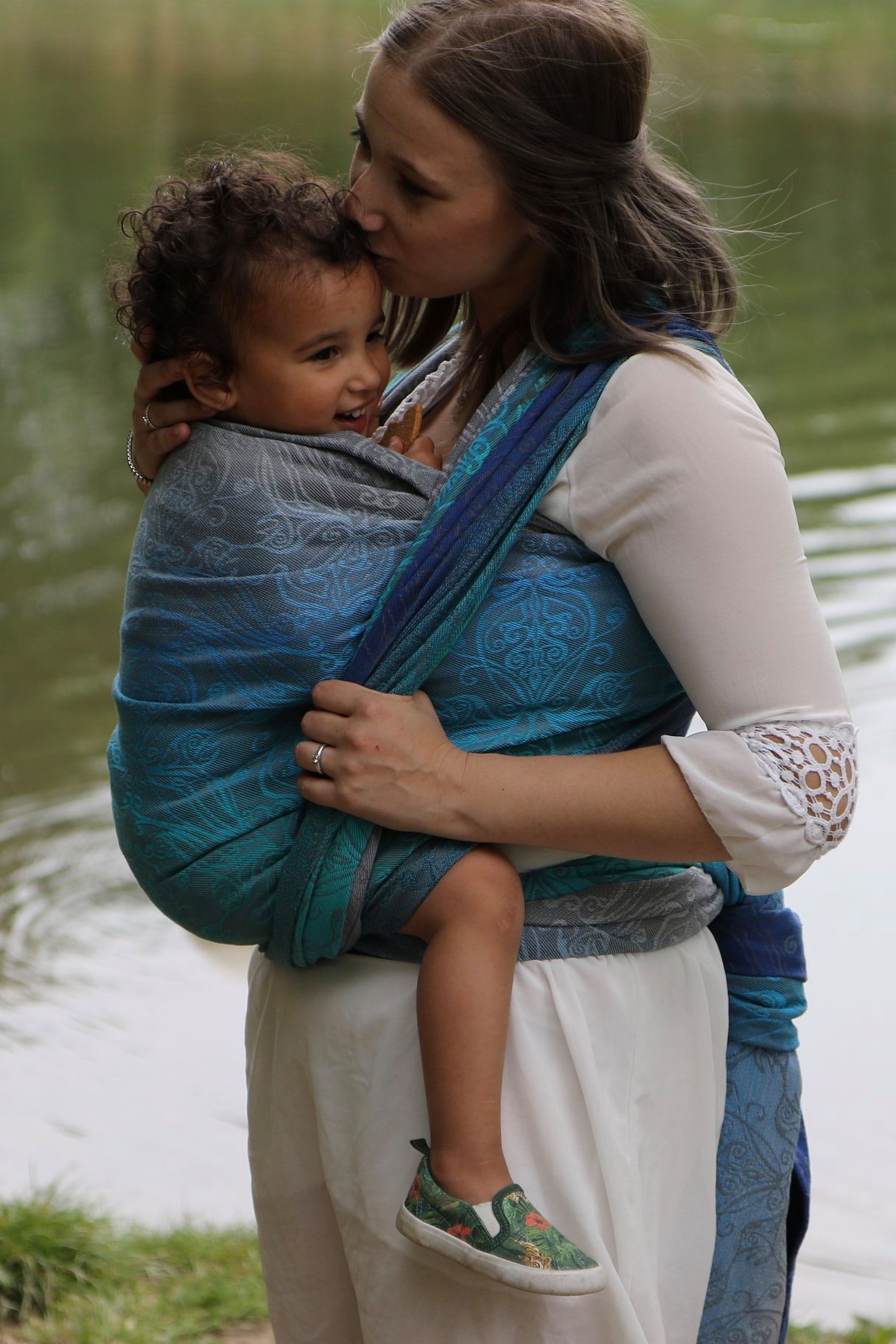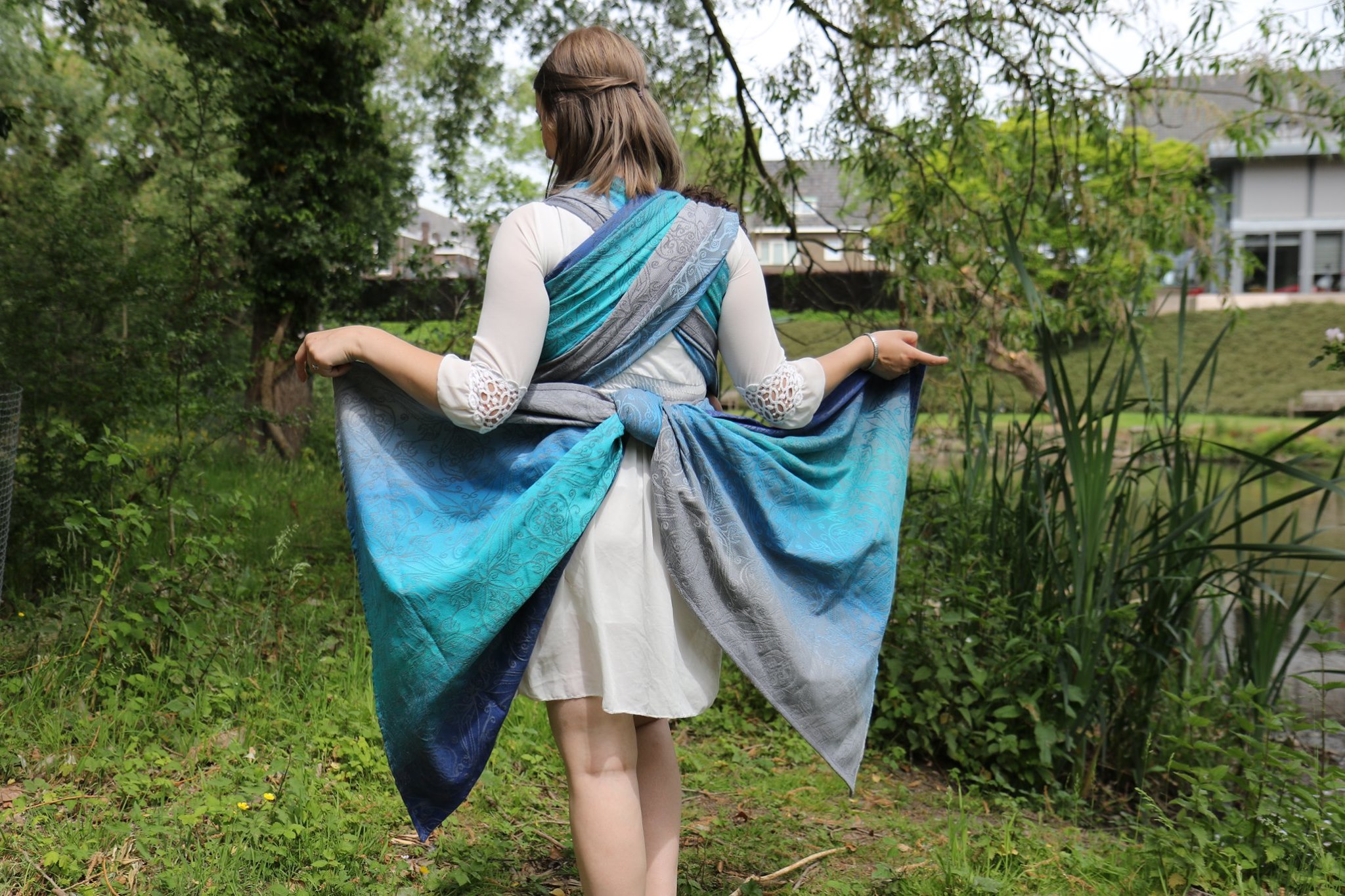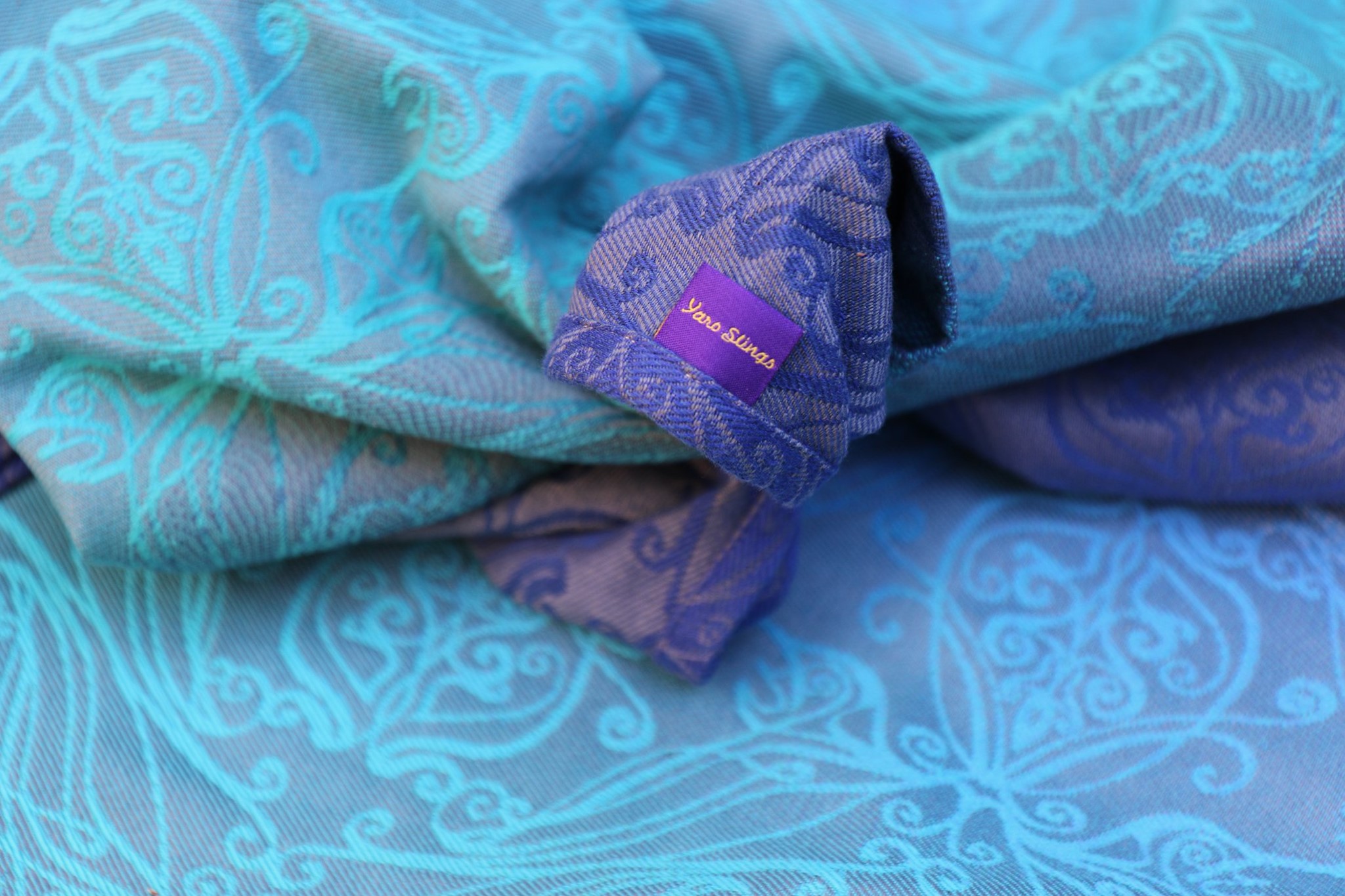 Elvish heter mönstret och det är ett av Yaros mest älskade. Denna variant har en vacker färggradering i mättad blå och gröna toner mot en grå botten. Repreve gör sjalen stark och att den får en vacker silkig glans som verkligen kommer till sin rätt ute en solig dag. Det är en mediumtjock sjal som gör att den passar för nyfödda såväl större barn. Den kräver lite tid för att bli inbruten och mjuk, men när den väl är inbruten blir den riktigt mjuk. Materialblandningen av bomull och repreve är värmereglerande, vilket gör att den värmer under kallare förhållanden och känns sval när det är varmt ute. Den är också naturligt vattenavstötande, den har starka fibrer som ger god avlastning. Repreve är ett återbrukat material med riktigt bra hållbarhet. Perfekt för sommaren, men passar året runt.