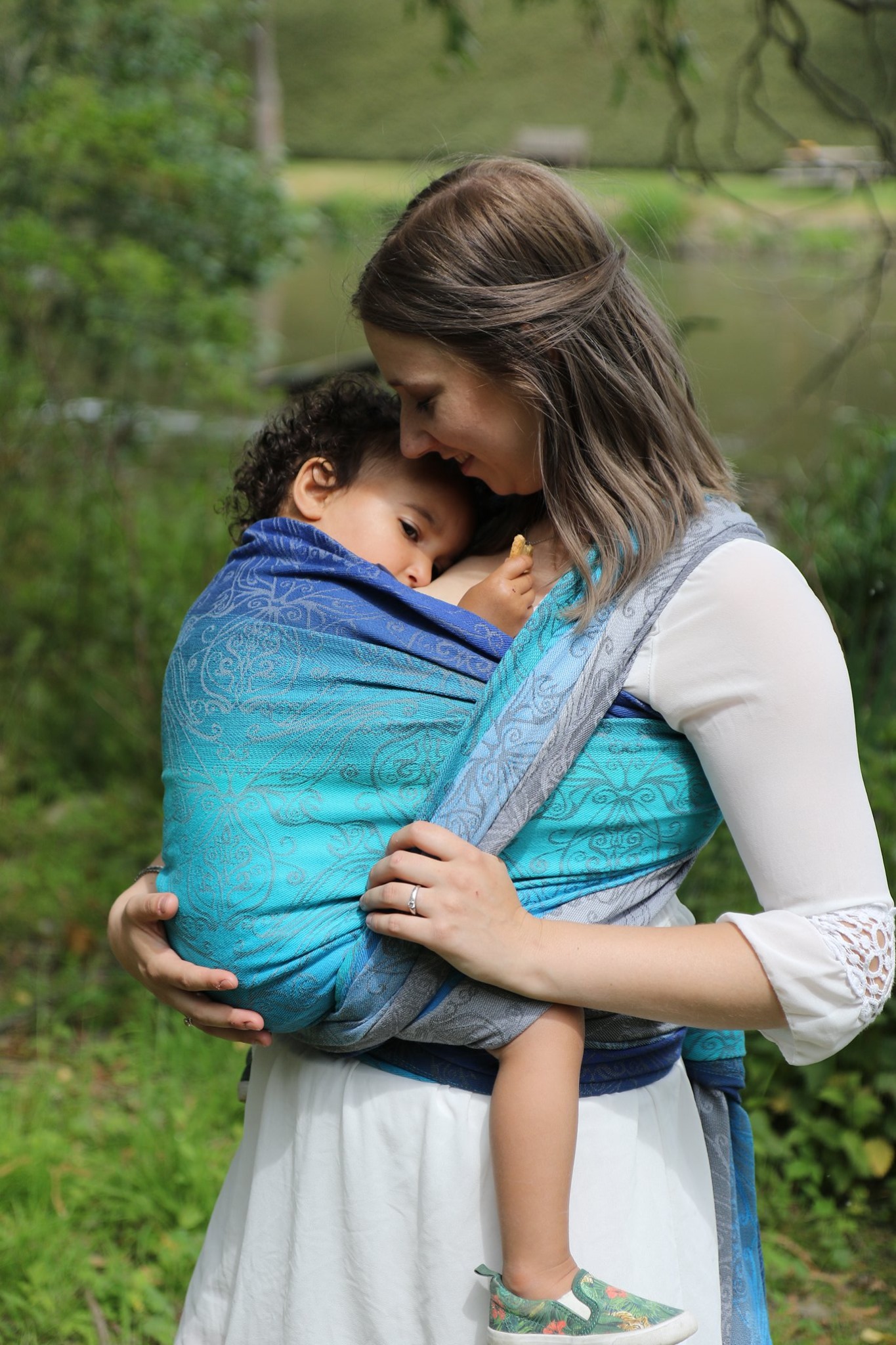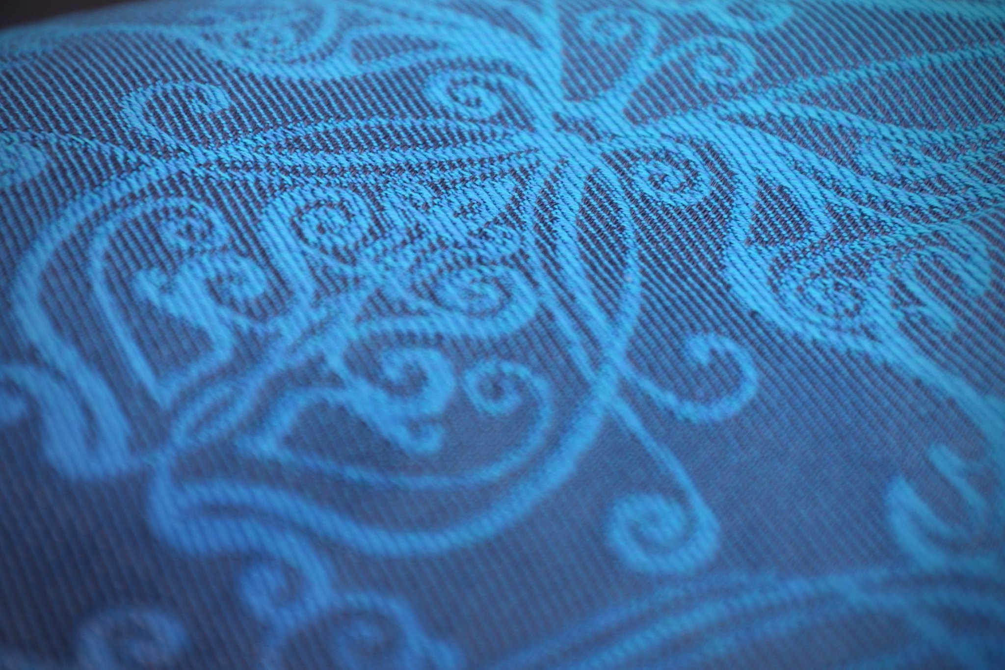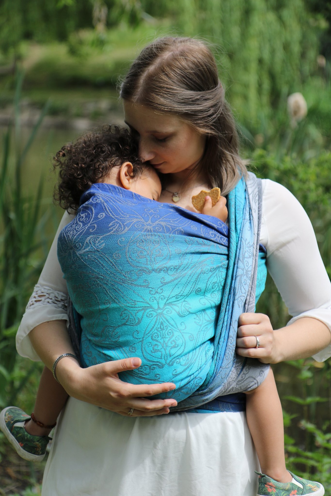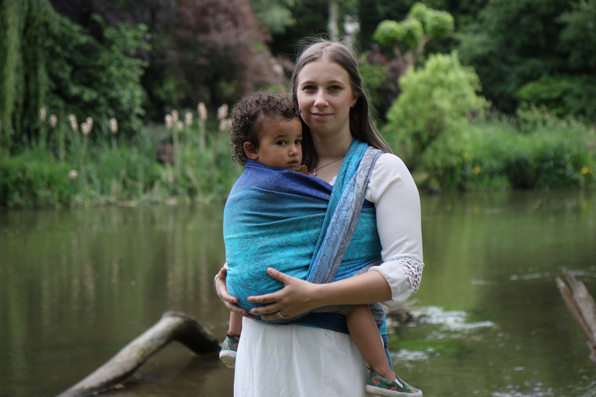Elvish heter mönstret och det är ett av Yaros mest älskade. Denna variant har en vacker färggradering i mättad blå och gröna toner mot en grå botten. Repreve gör sjalen stark och att den får en vacker silkig glans som verkligen kommer till sin rätt ute en solig dag. Det är en mediumtjock sjal som gör att den passar för nyfödda såväl större barn. Den kräver lite tid för att bli inbruten och mjuk, men när den väl är inbruten blir den riktigt mjuk. Materialblandningen av bomull och repreve är värmereglerande, vilket gör att den värmer under kallare förhållanden och känns sval när det är varmt ute. Den är också naturligt vattenavstötande, den har starka fibrer som ger god avlastning. Repreve är ett återbrukat material med riktigt bra hållbarhet. Perfekt för sommaren, men passar året runt.