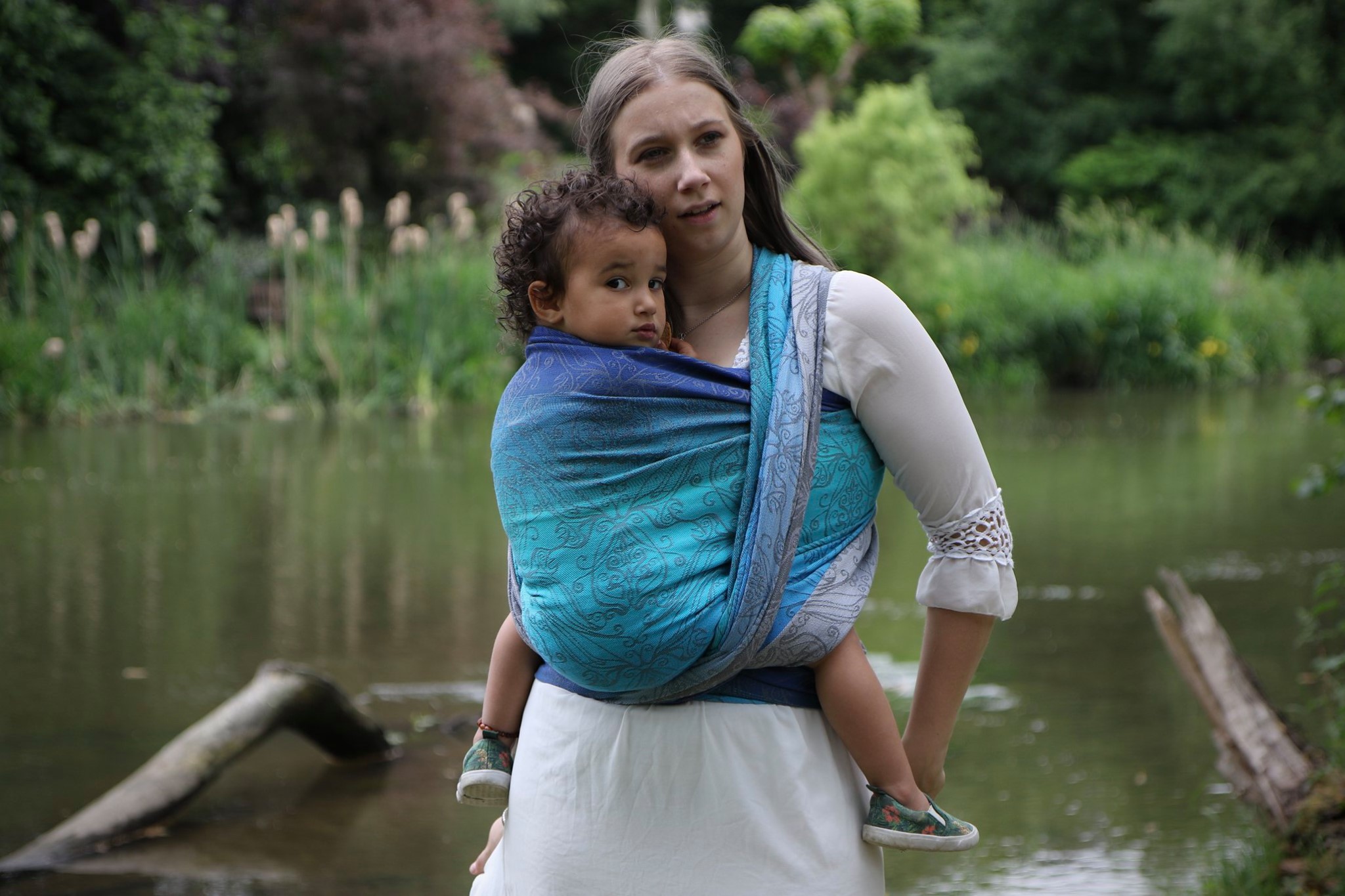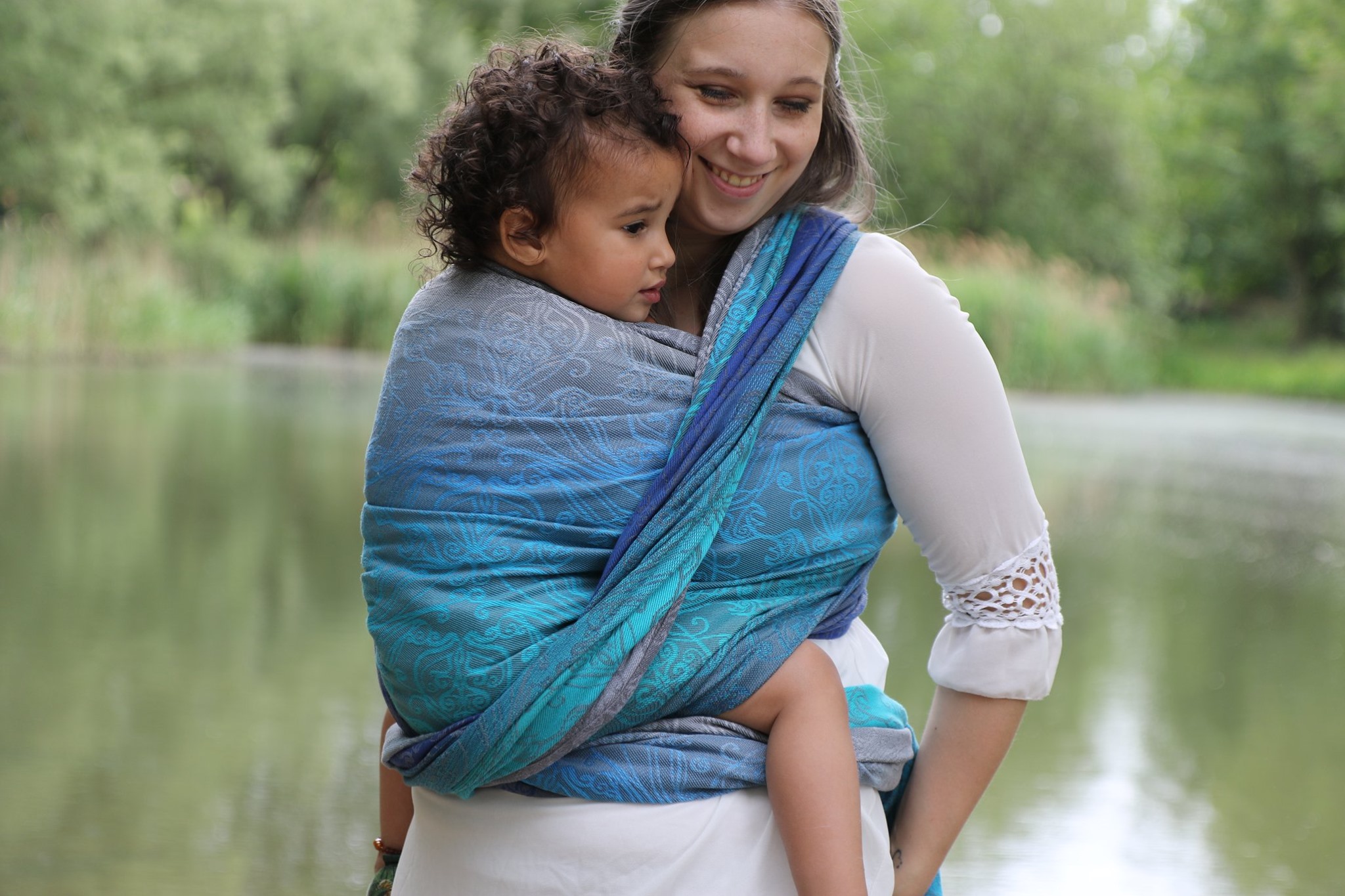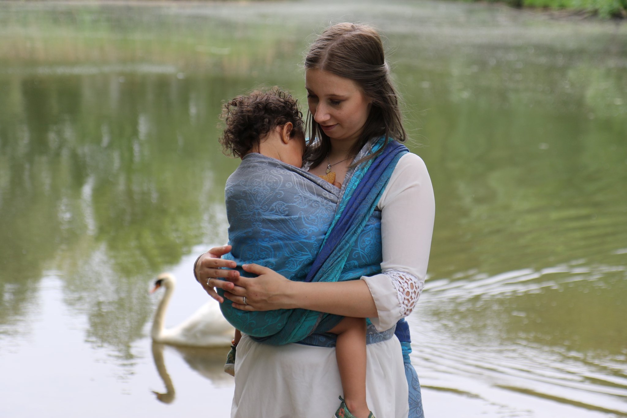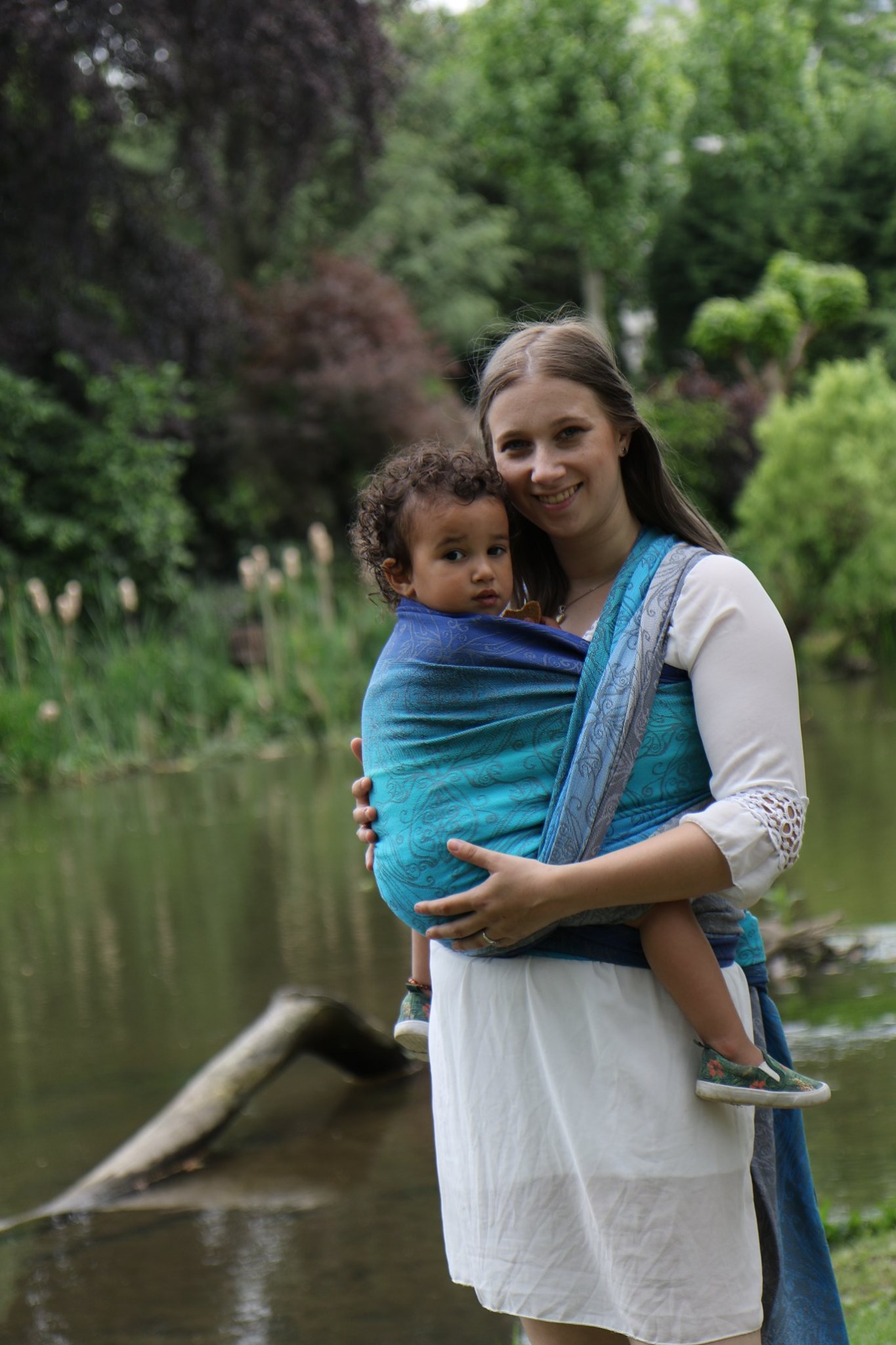 Med en ringsjal kan du snabbt och lätt bära ditt barn, du trär tyget genom ringarna, sätter i barnet och spänner enligt instruktionerna. Observera att det inte är rekommenderat att bära barnet i position “vagga” då det kan leda till att barnet inte får fria luftvägar.
