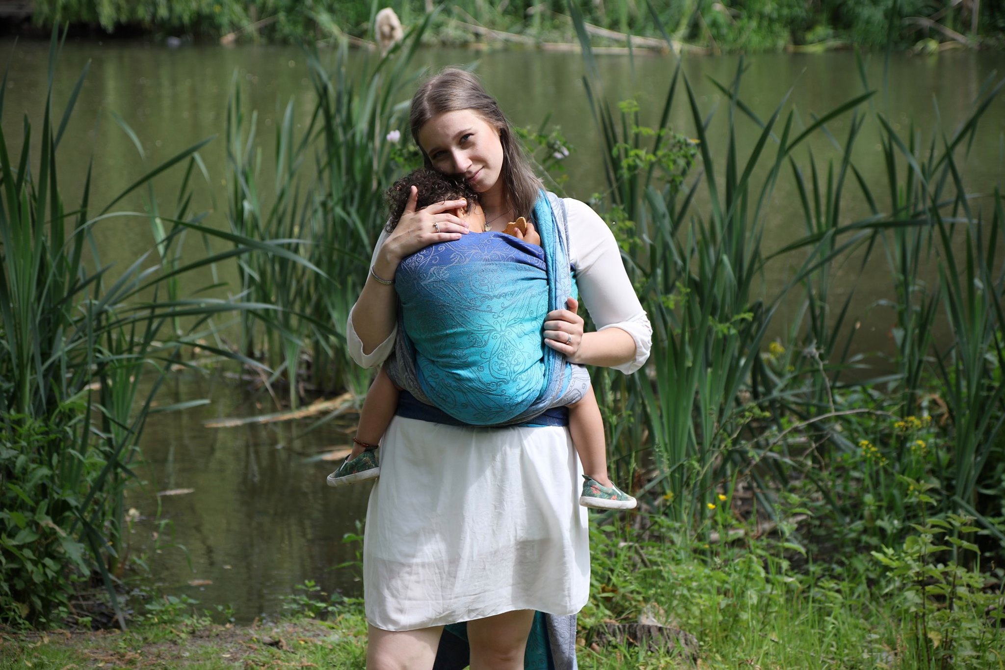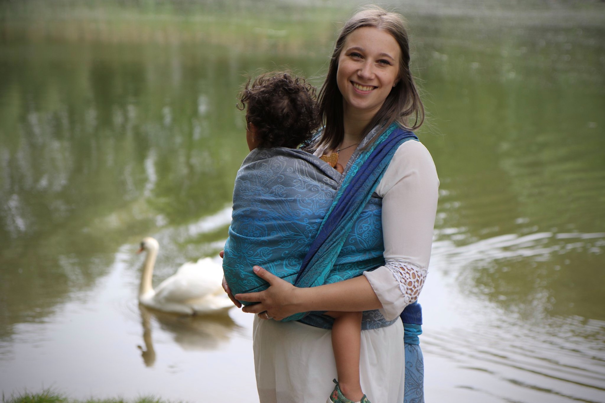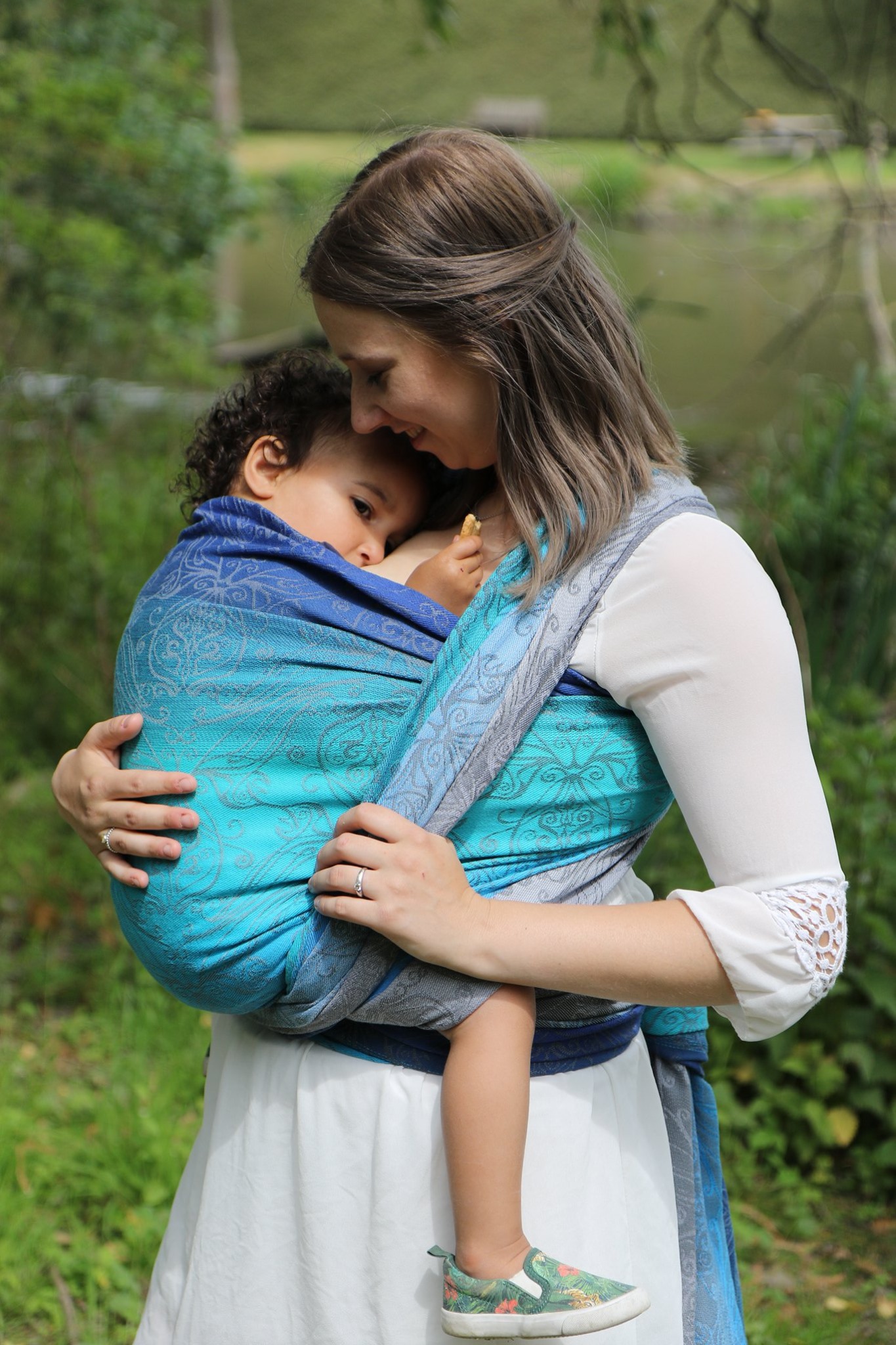 Med en ringsjal kan du snabbt och lätt bära ditt barn, du trär tyget genom ringarna, sätter i barnet och spänner enligt instruktionerna. Observera att det inte är rekommenderat att bära barnet i position “vagga” då det kan leda till att barnet inte får fria luftvägar.