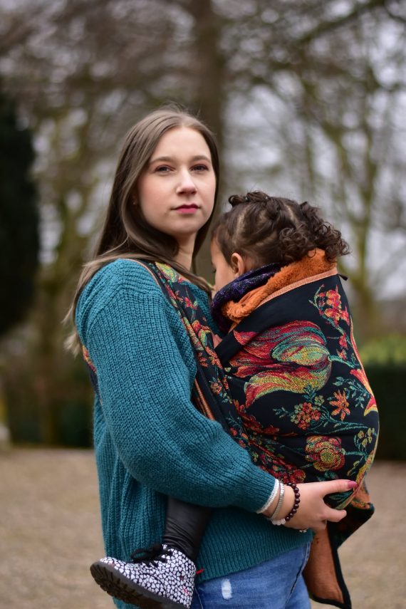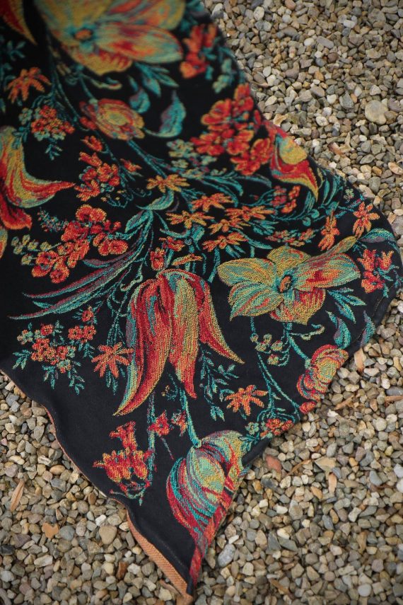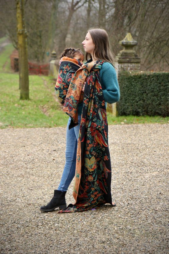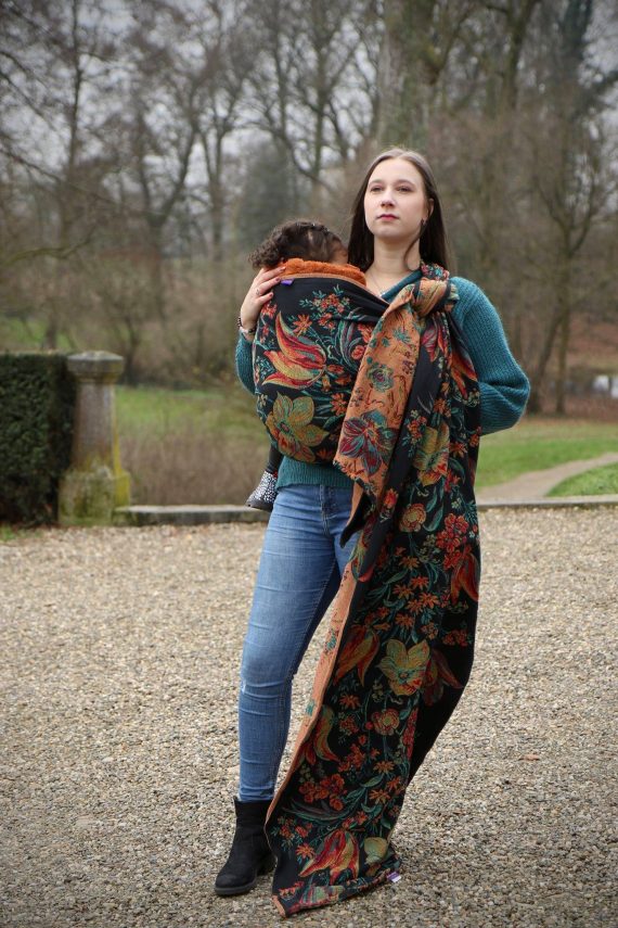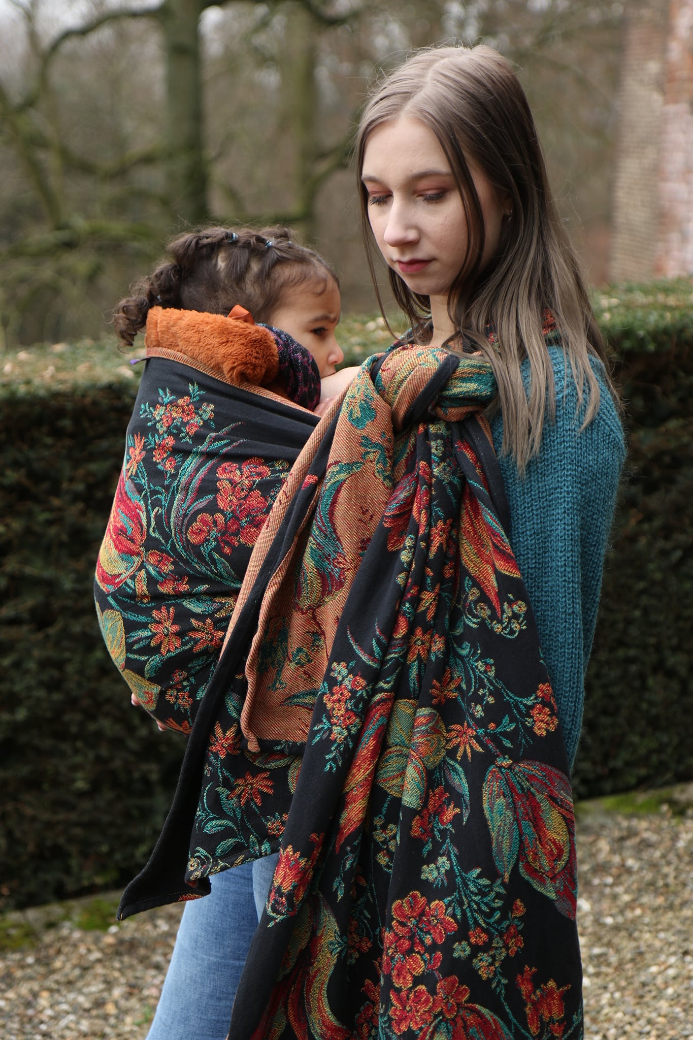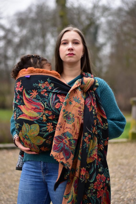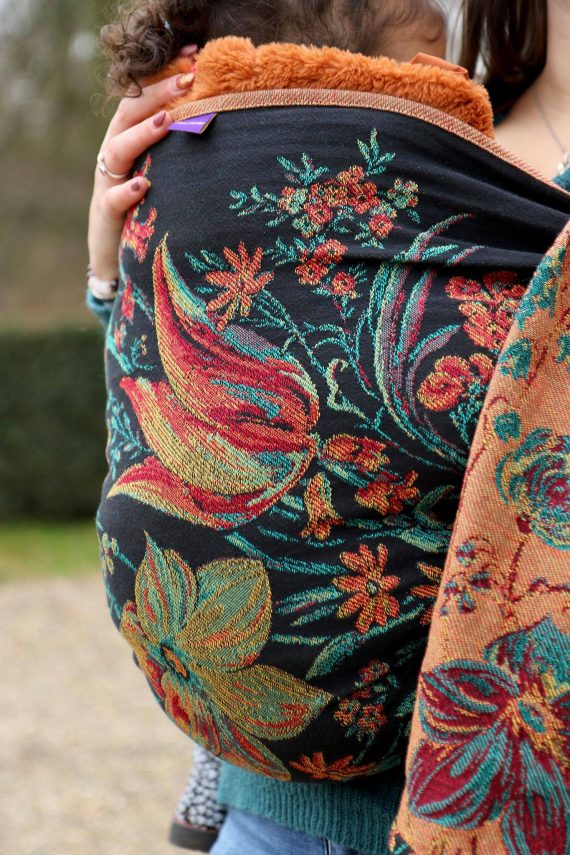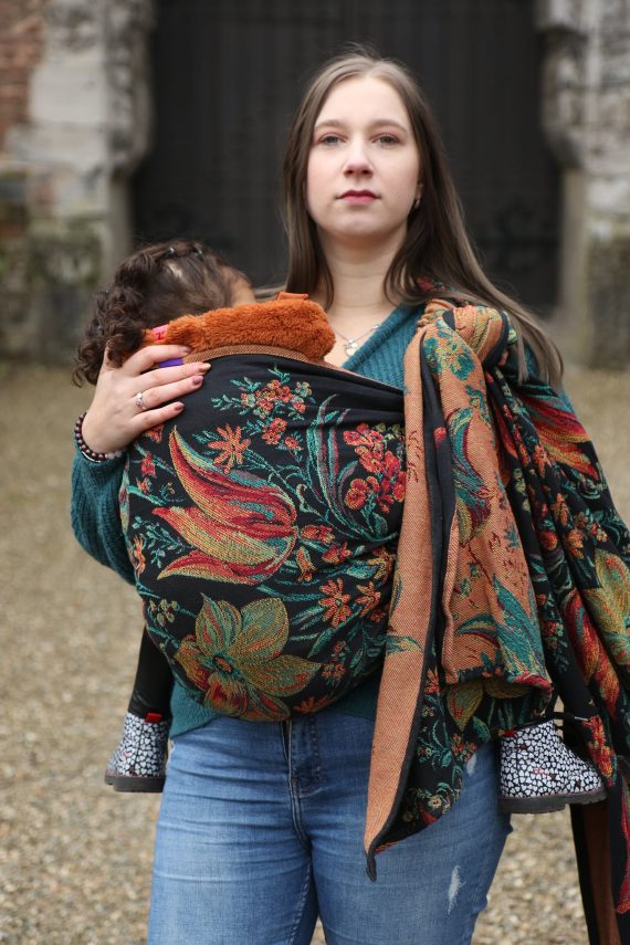 Underbart nytt mönster, en bukett blommor med djup och mättad färg. På ena sidan är sjalen svart med röda gröna och gula toner. På baksidan hittar vi en ljuv orange som kommer att förändras i olika ljus. Sjalen behöver brytas in men blir bra och mjukare efter tvätt ju mer den används. Tencel bidrar med extra mjukhet. Den är vävd i Yaros signaturtrioväv. Trioväv maximerar komforten hos den vävda sjalen och det visuella utseendet på mönstret. Samspelet mellan de tre olika vävningarna resulterar i en stark och stödjande sjal utan att bli för överväldigande. En mångsidig sjal, lämplig för bebisar och passar perfekt för lite större barn också.
