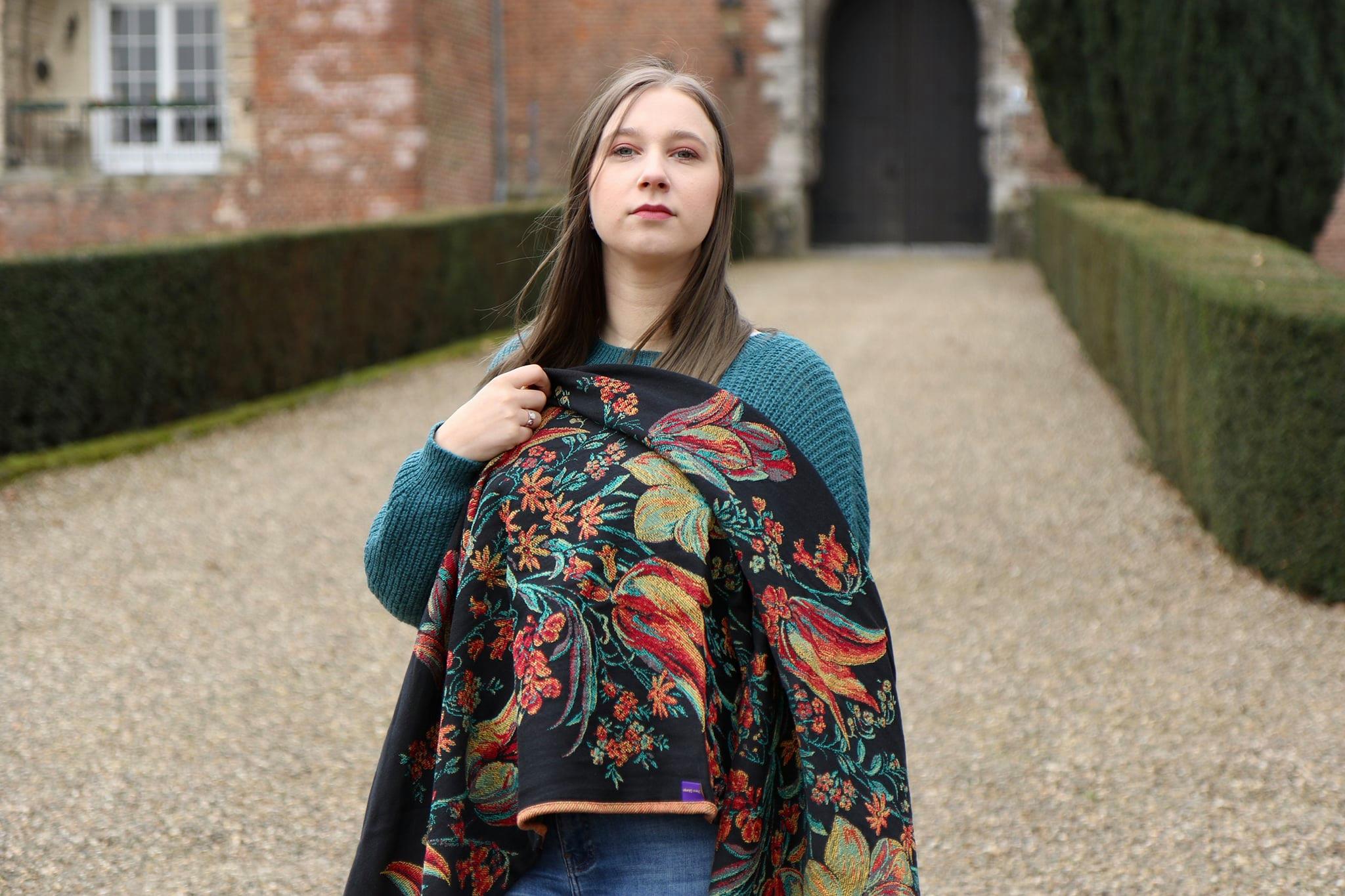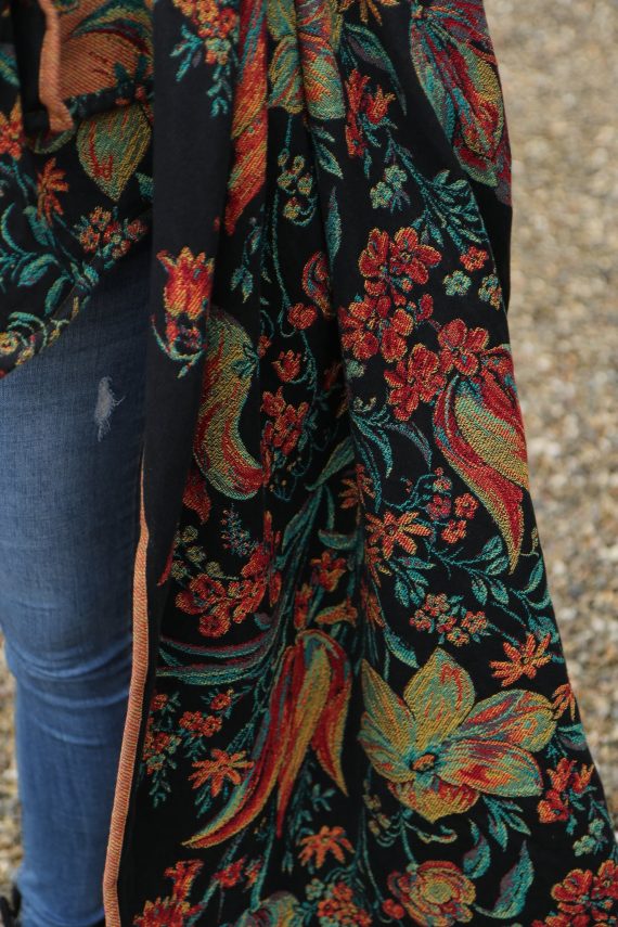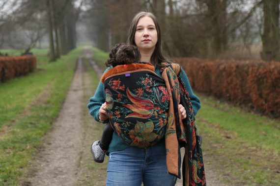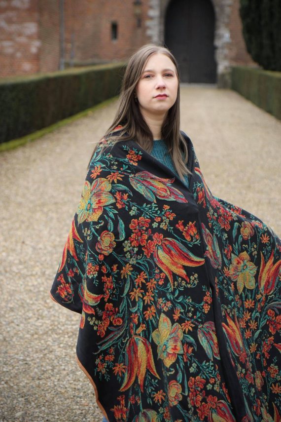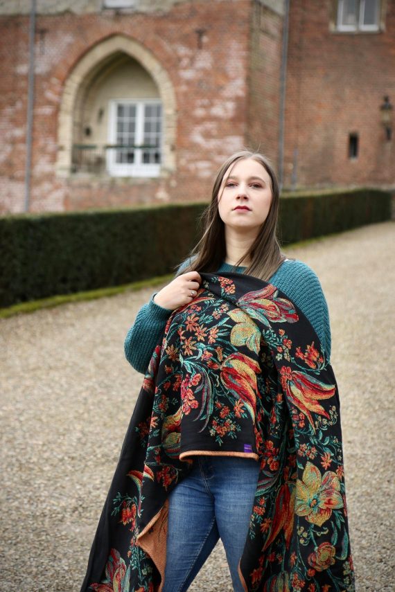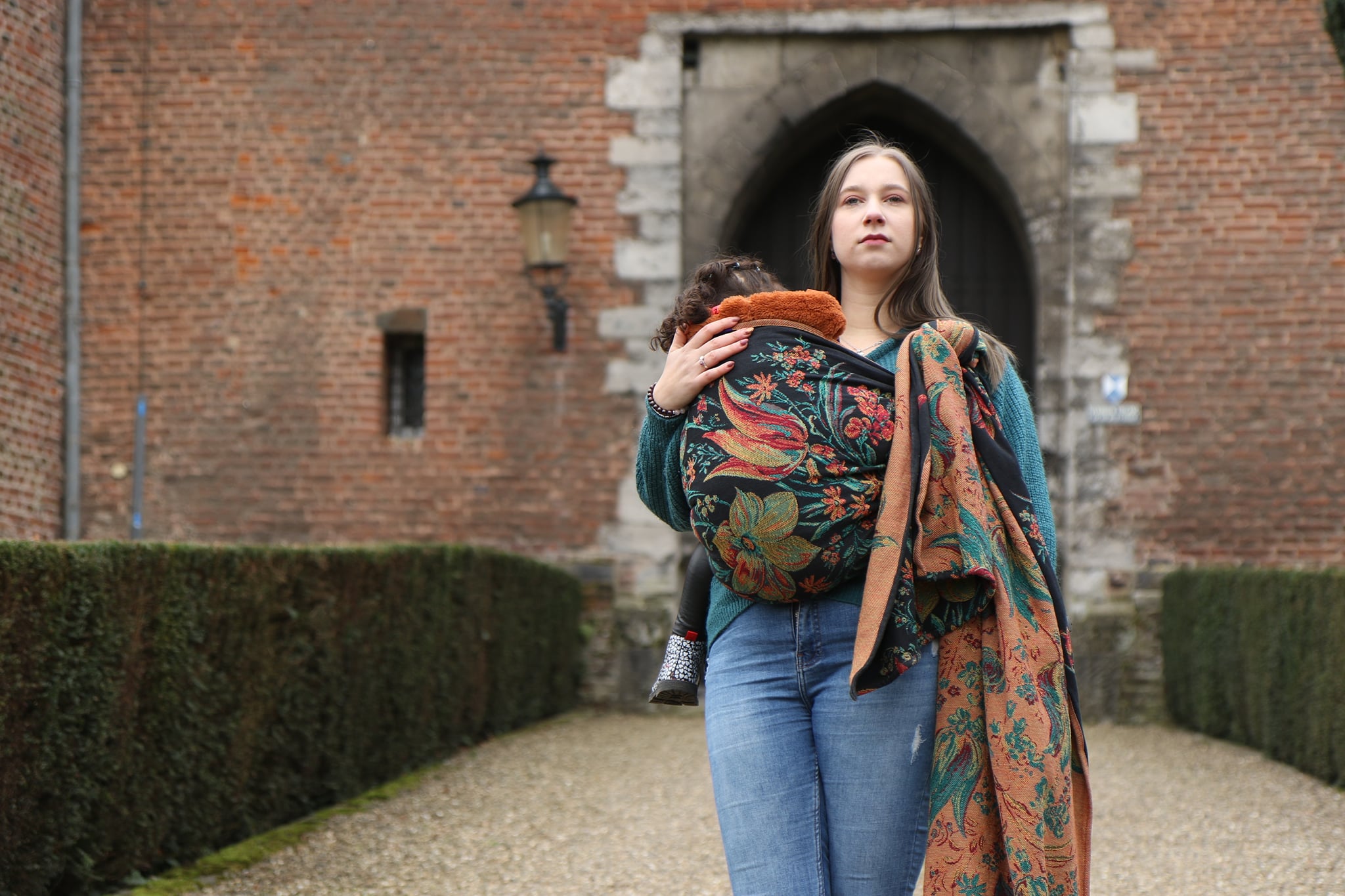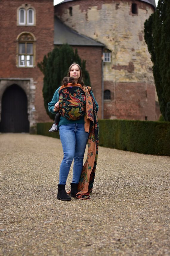 Underbart nytt mönster, en bukett blommor med djup och mättad färg. På ena sidan är sjalen svart med röda gröna och gula toner. På baksidan hittar vi en ljuv orange som kommer att förändras i olika ljus. Sjalen behöver brytas in men blir bra och mjukare efter tvätt ju mer den används. Tencel bidrar med extra mjukhet. Den är vävd i Yaros signaturtrioväv. Trioväv maximerar komforten hos den vävda sjalen och det visuella utseendet på mönstret. Samspelet mellan de tre olika vävningarna resulterar i en stark och stödjande sjal utan att bli för överväldigande. En mångsidig sjal, lämplig för bebisar och passar perfekt för lite större barn också.