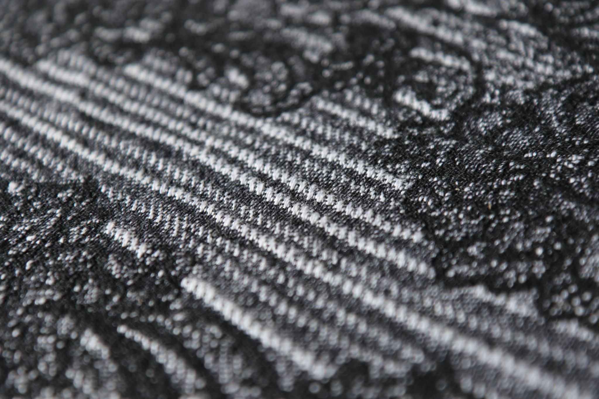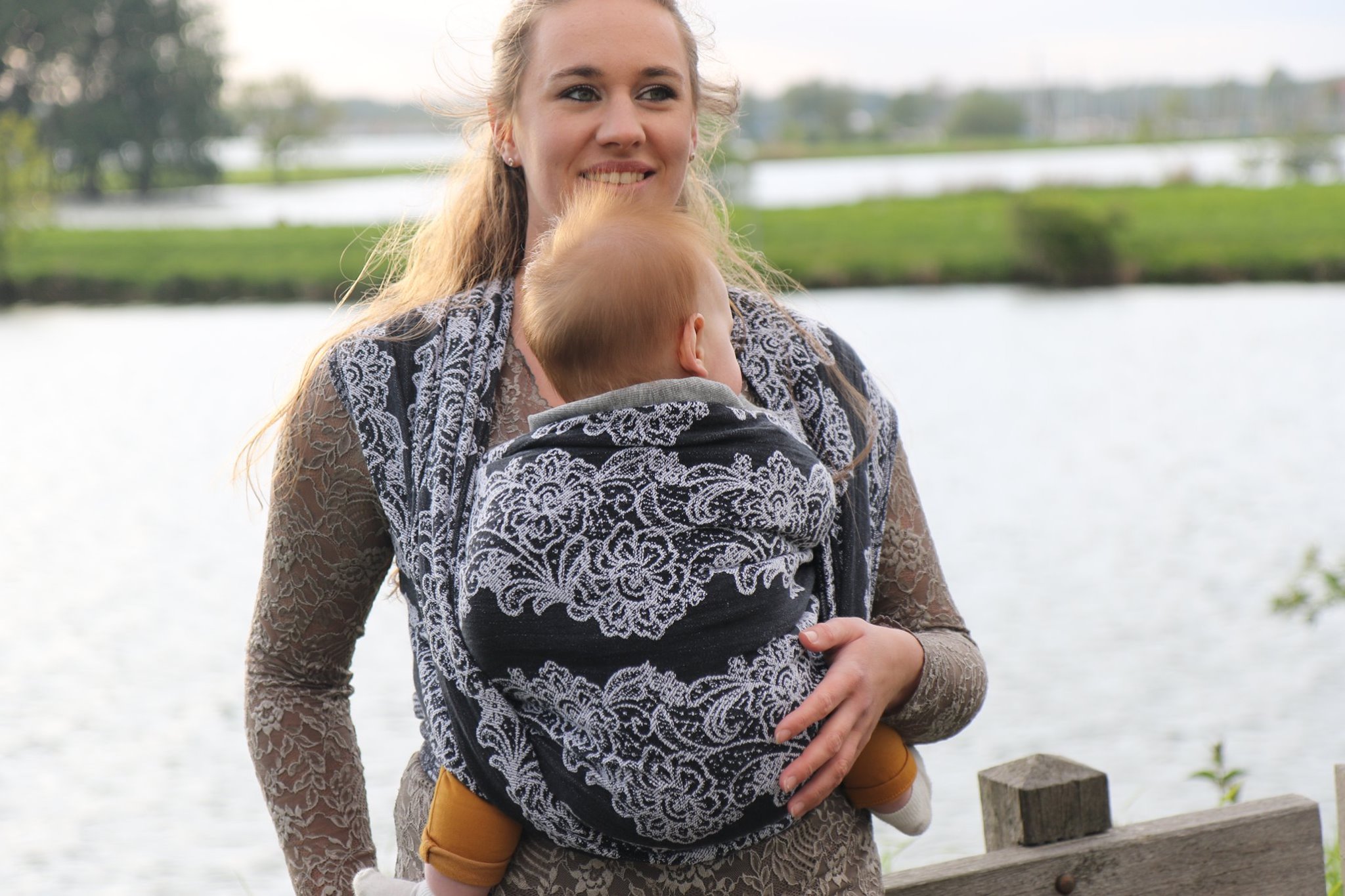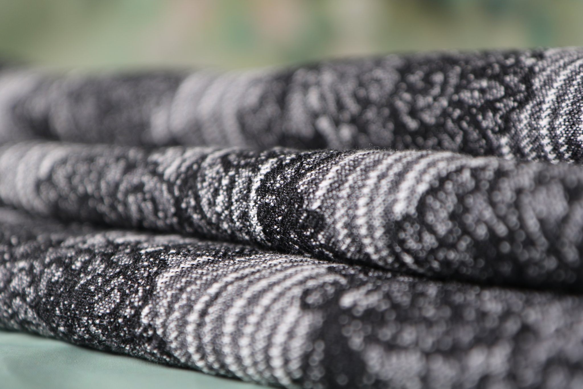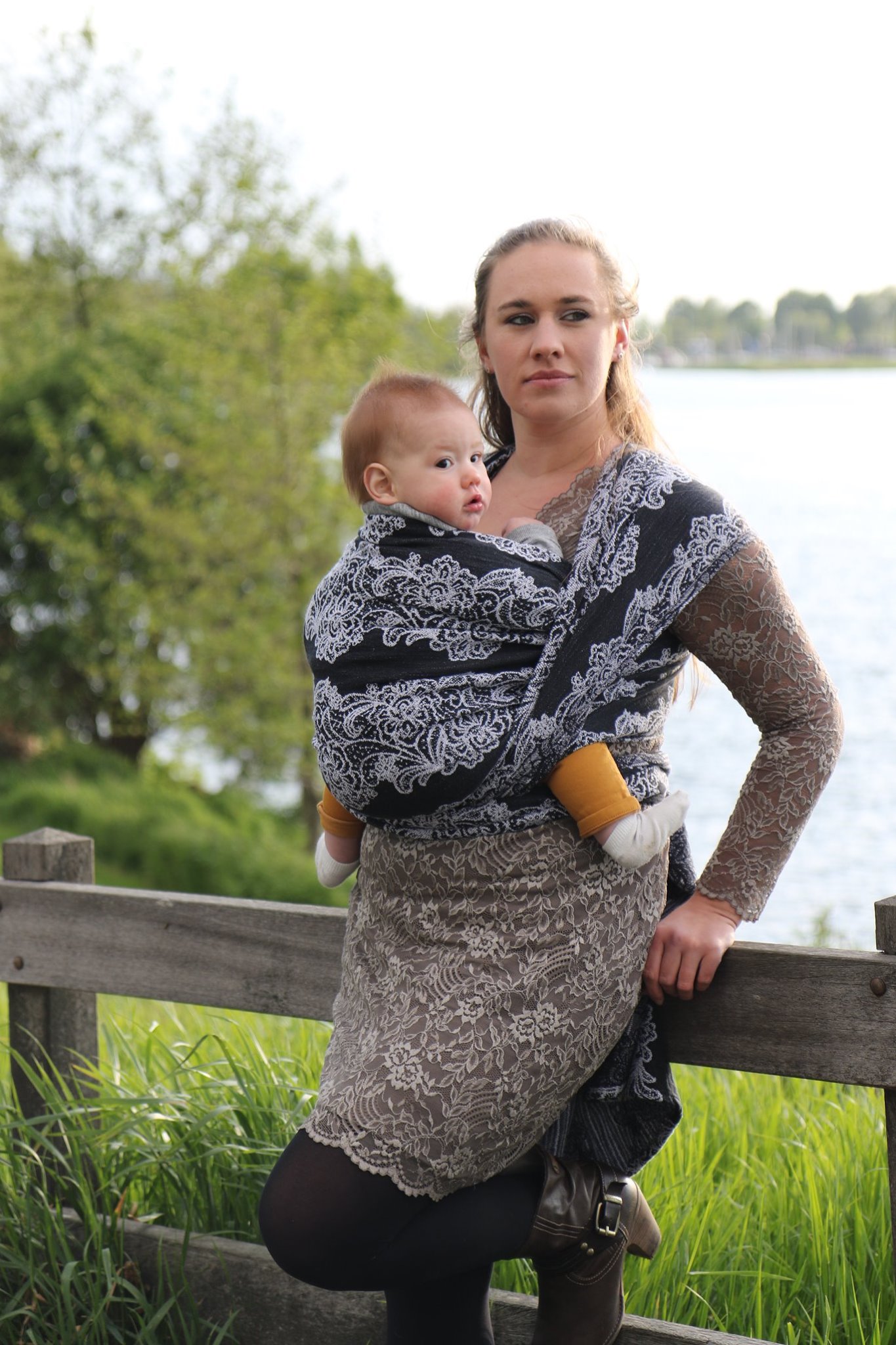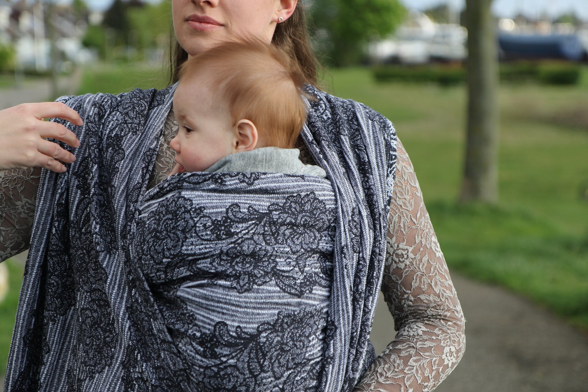 En sjal i svart, vitt och alla nyanser av grå. Det vita spetsmönstret på svart ger en elegant och lyxig look. Den grå sidan blir mer sofistikerad och lekful, då sidorna är så olika blir det lite som två sjalar i en. Den har mycket grepp och passar särskilt bra till lite större barn. Den kräver lite inbrytning, men blir genast mjukare efter en första tvätt och strykning.