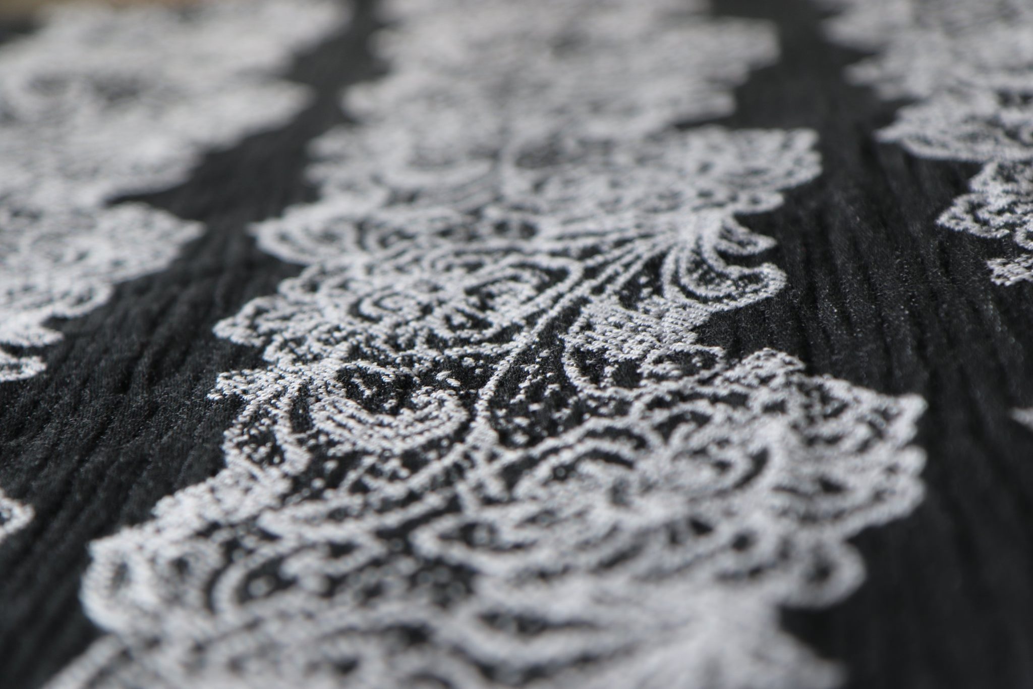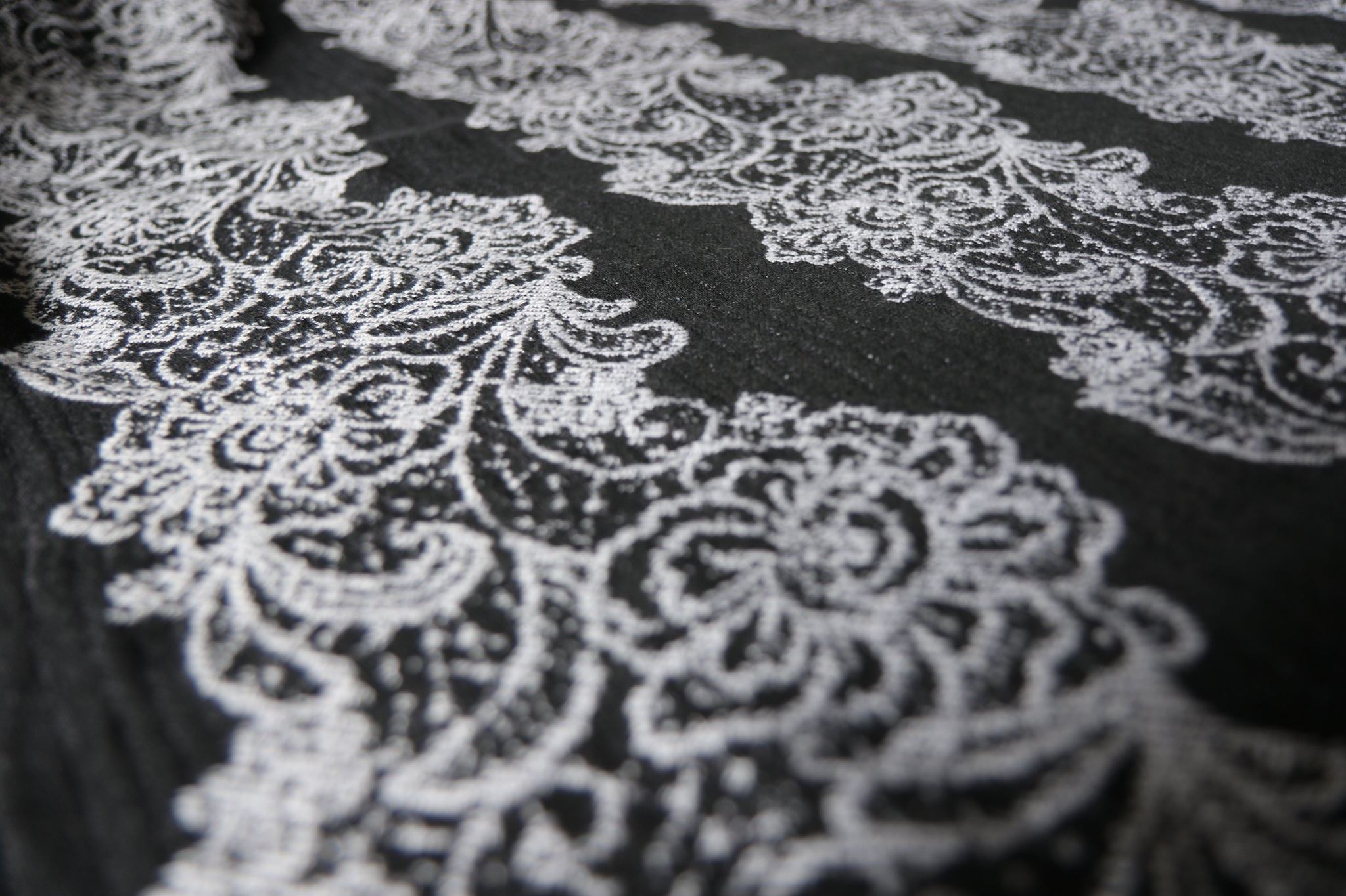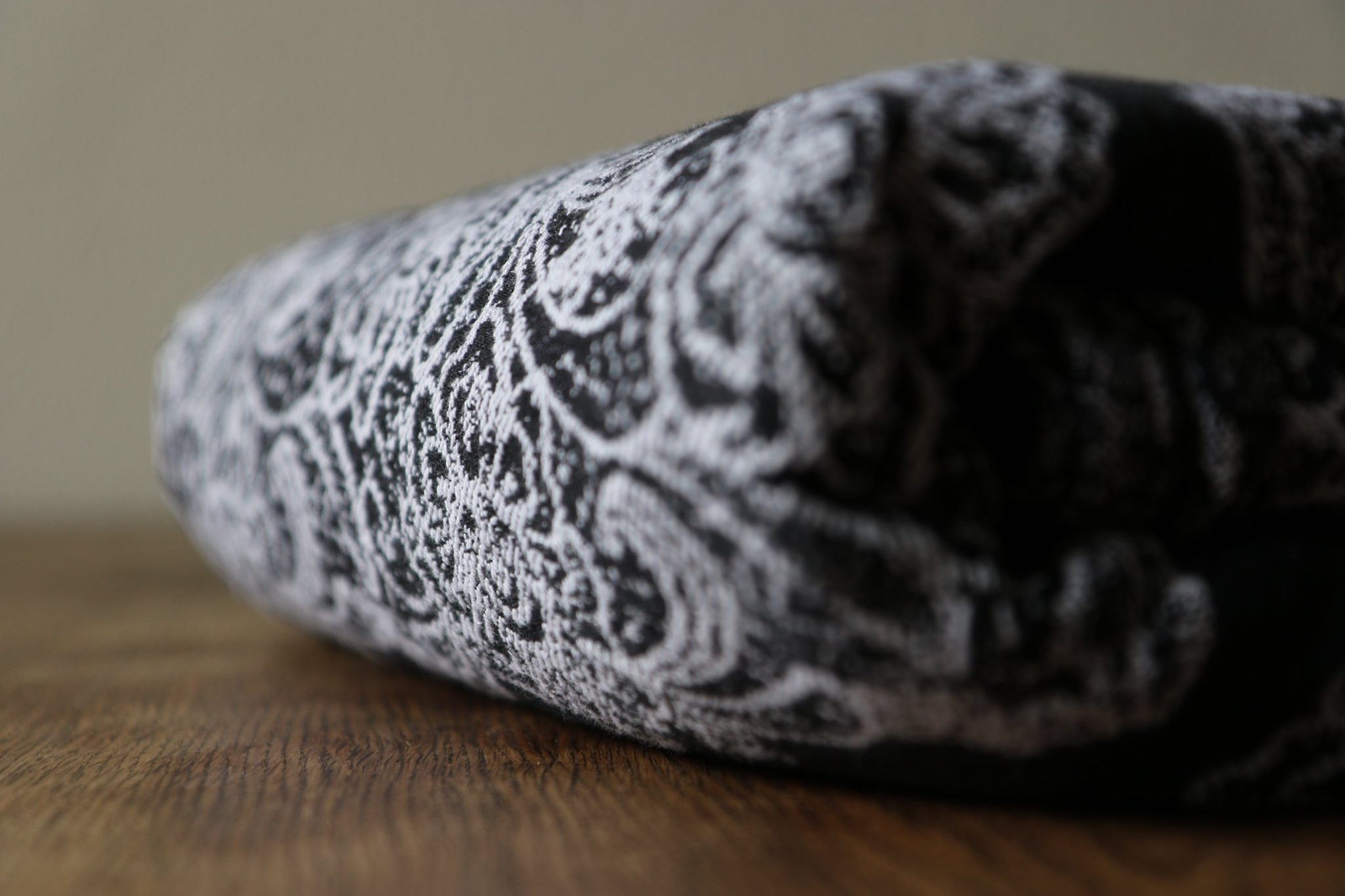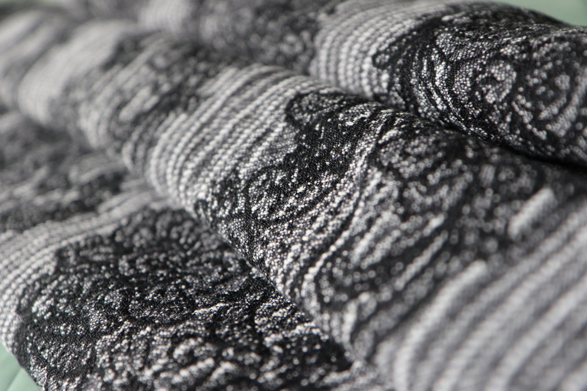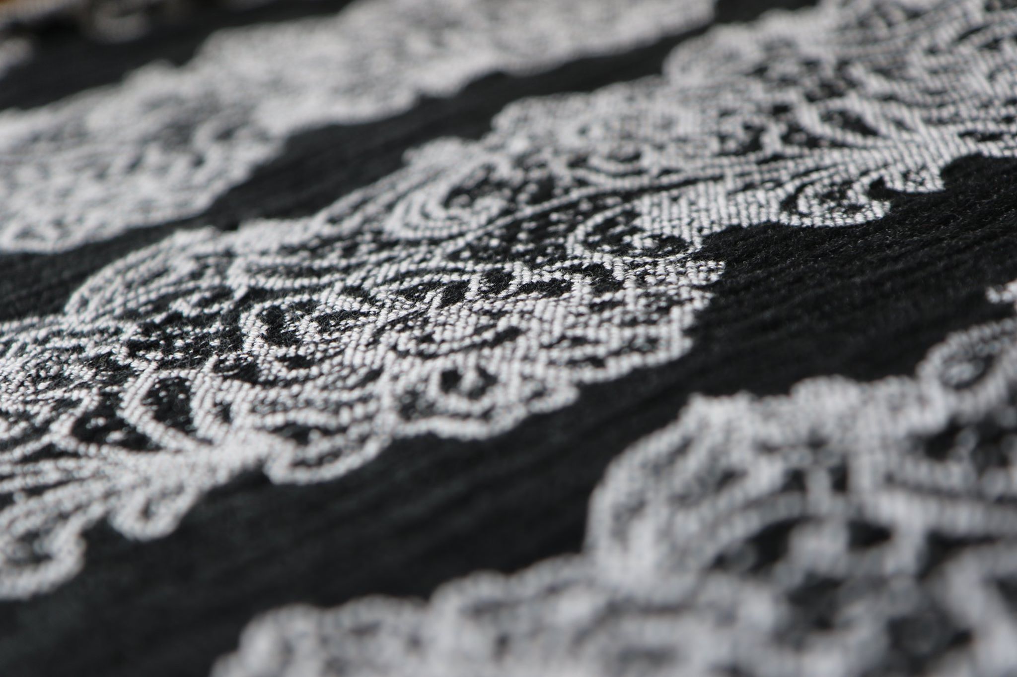 En sjal i svart, vitt och alla nyanser av grå. Det vita spetsmönstret på svart ger en elegant och lyxig look. Den grå sidan blir mer sofistikerad och lekful, då sidorna är så olika blir det lite som två sjalar i en. Den har mycket grepp och passar särskilt bra till lite större barn. Den kräver lite inbrytning, men blir genast mjukare efter en första tvätt och strykning.