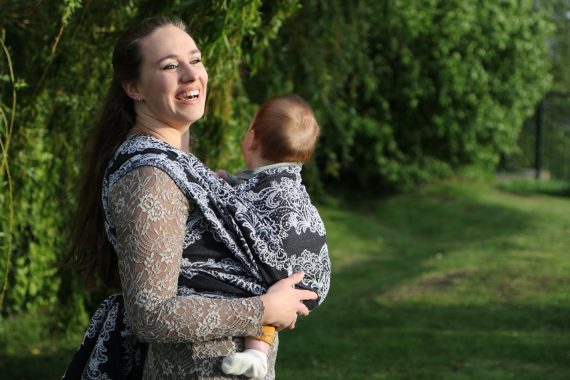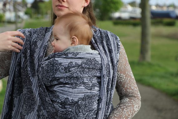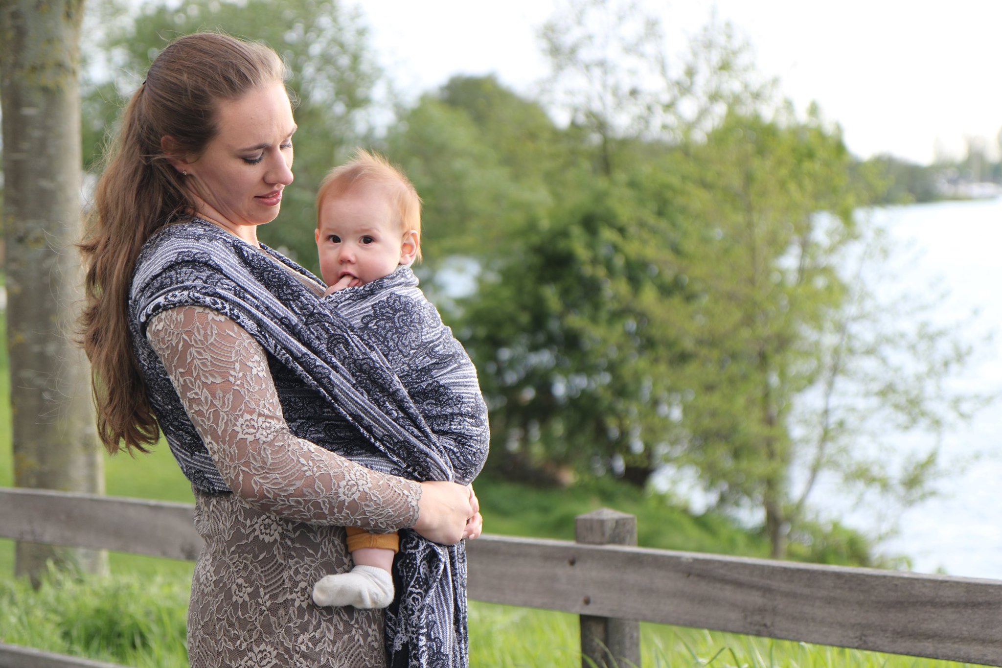 Med en ringsjal kan du snabbt och lätt bära ditt barn, du trär tyget genom ringarna, sätter i barnet och spänner enligt instruktionerna. Observera att det inte är rekommenderat att bära barnet i position “vagga” då det kan leda till att barnet inte får fria luftvägar.
