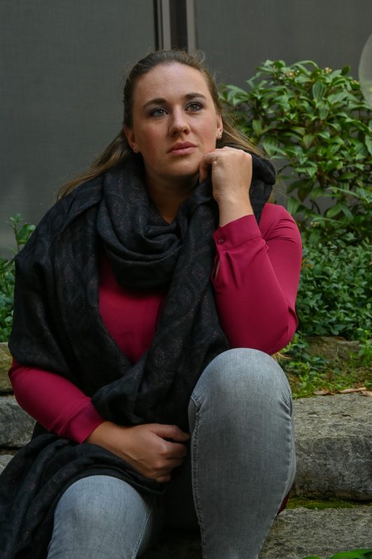 Denna vackra sjal kombinerar La Vita i svart med rött glitter som verkligen får den att poppa. Direkt ur påsen känns den något stadig, men efter en tvätt förvandlas den på ett underbart sätt, och med lite användning blir den en mjuk och varm sjal med styrka. Alpacaull är perfekt för dem som är känsliga mot ull, och denna sjal erbjuder både bra grepp och tillräcklig studs på axlarna för att hålla sjalen bekvämt på plats hela dagen. Passar alla åldrar och erfarenhetsnivåer.