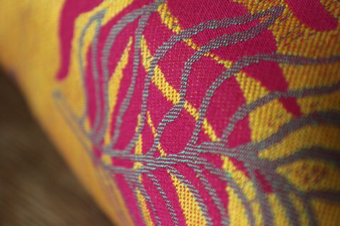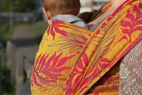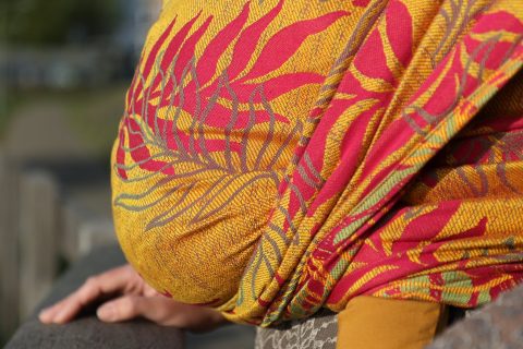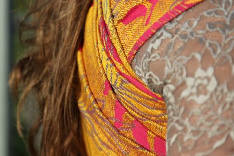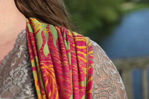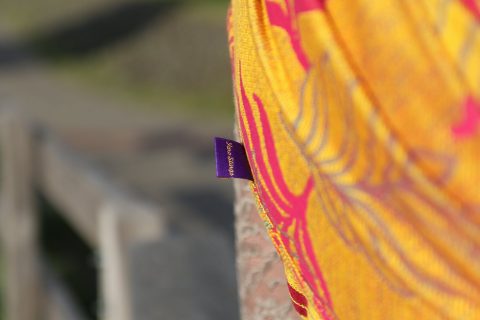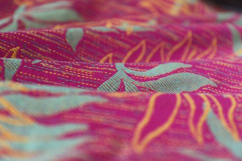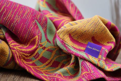 Oasis Duo Fuchsia Yellow Green Tencel – En guldgul sjal med blommor i djup fuchsia och gröna blad. Oasis är Yaros senaste mönster, detta är en “absolut måste ha-sjal” för sommaren. När solen skiner på sjalen så syns ett underbart skimmer. Vävd av bomull och tencel, vilket gör att den är mjuk redan från start, passar från nyfödd och upp. Enkel att hantera och passar alla erfarenhetsnivåer.