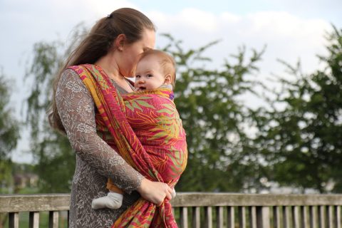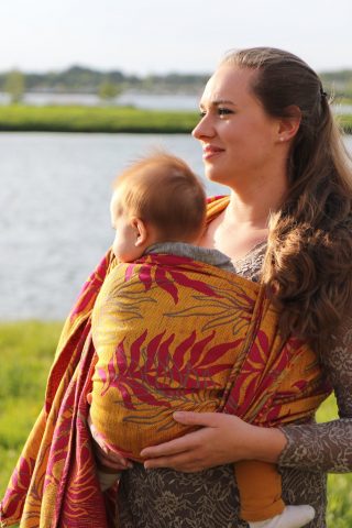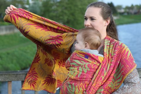 Med en ringsjal kan du snabbt och lätt bära ditt barn, du trär tyget genom ringarna, sätter i barnet och spänner enligt instruktionerna. Observera att det inte är rekommenderat att bära barnet i position “vagga” då det kan leda till att barnet inte får fria luftvägar.