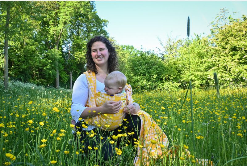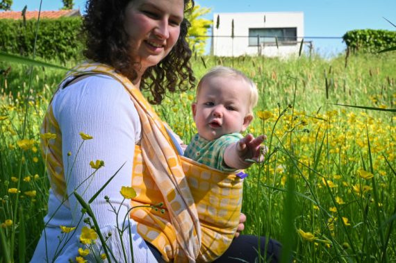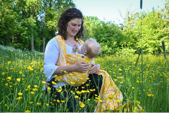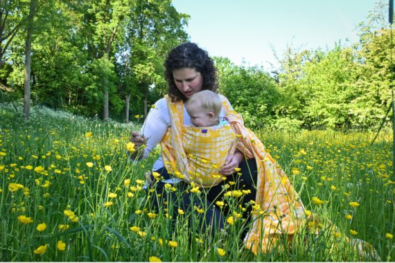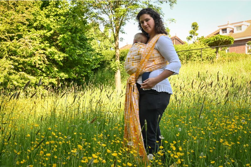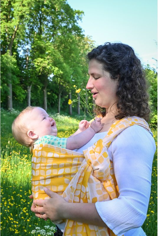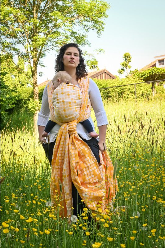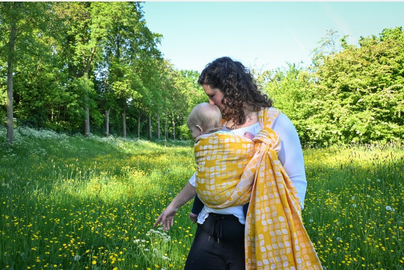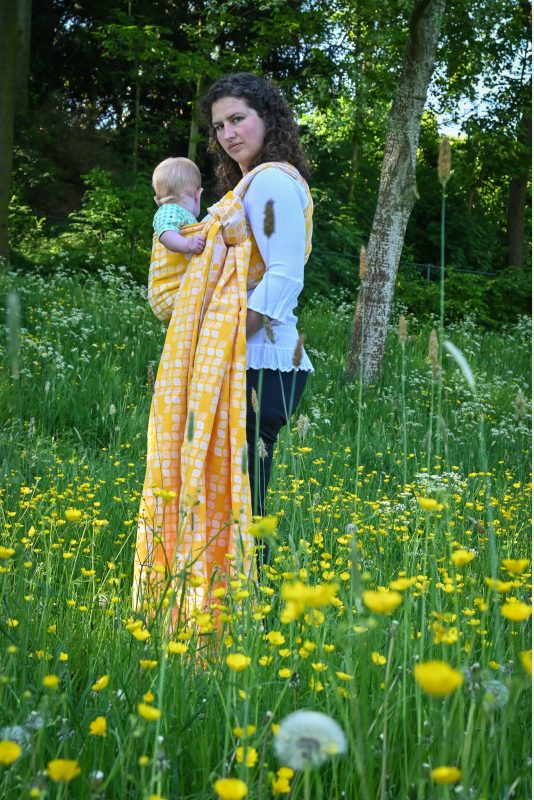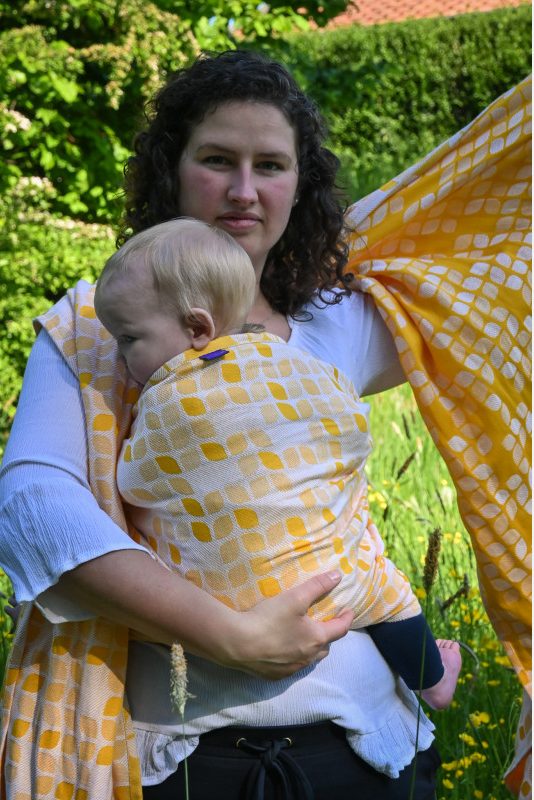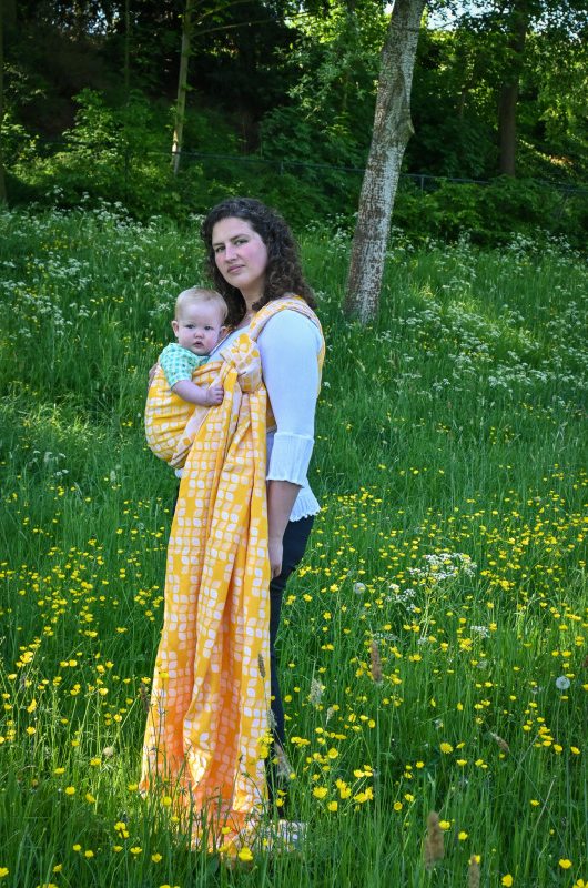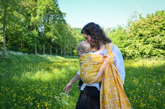 Med en ringsjal kan du snabbt och lätt bära ditt barn, du trär tyget genom ringarna, sätter i barnet och spänner enligt instruktionerna. Observera att det inte är rekommenderat att bära barnet i position “vagga” då det kan leda till att barnet inte får fria luftvägar.