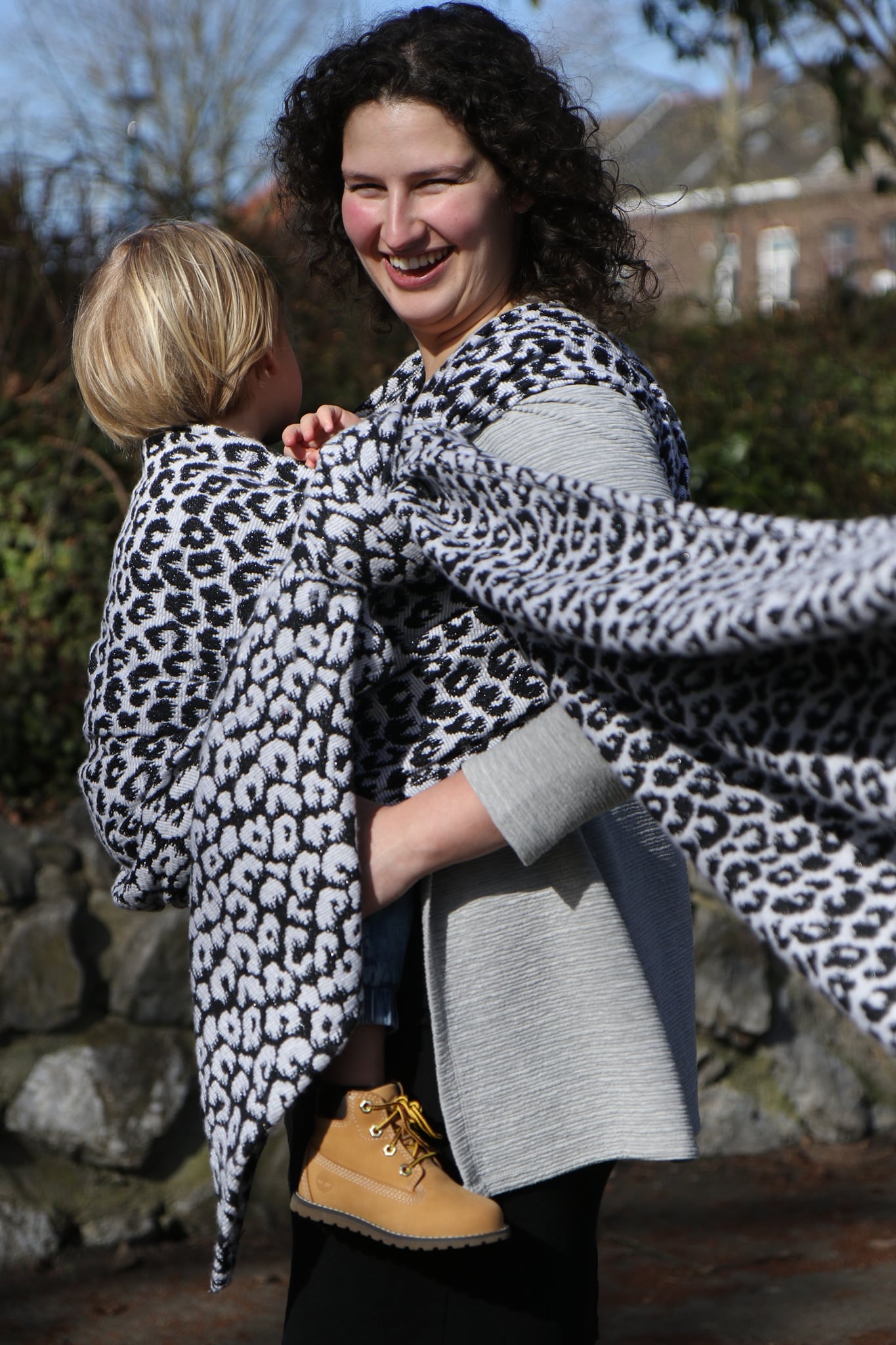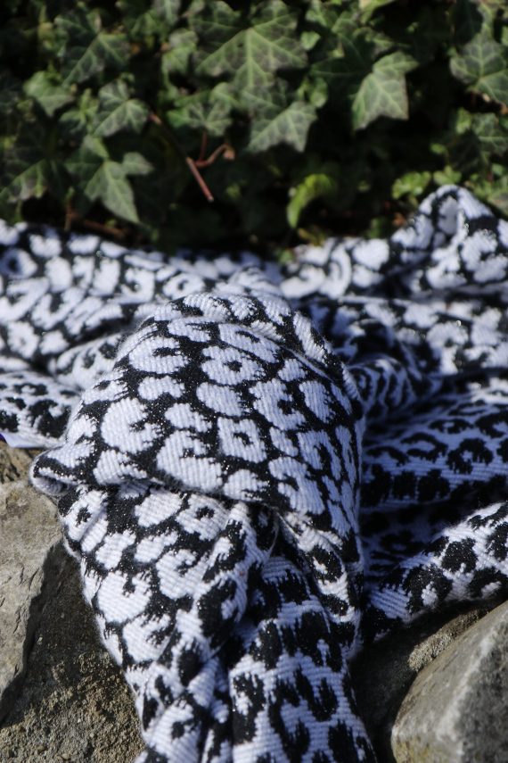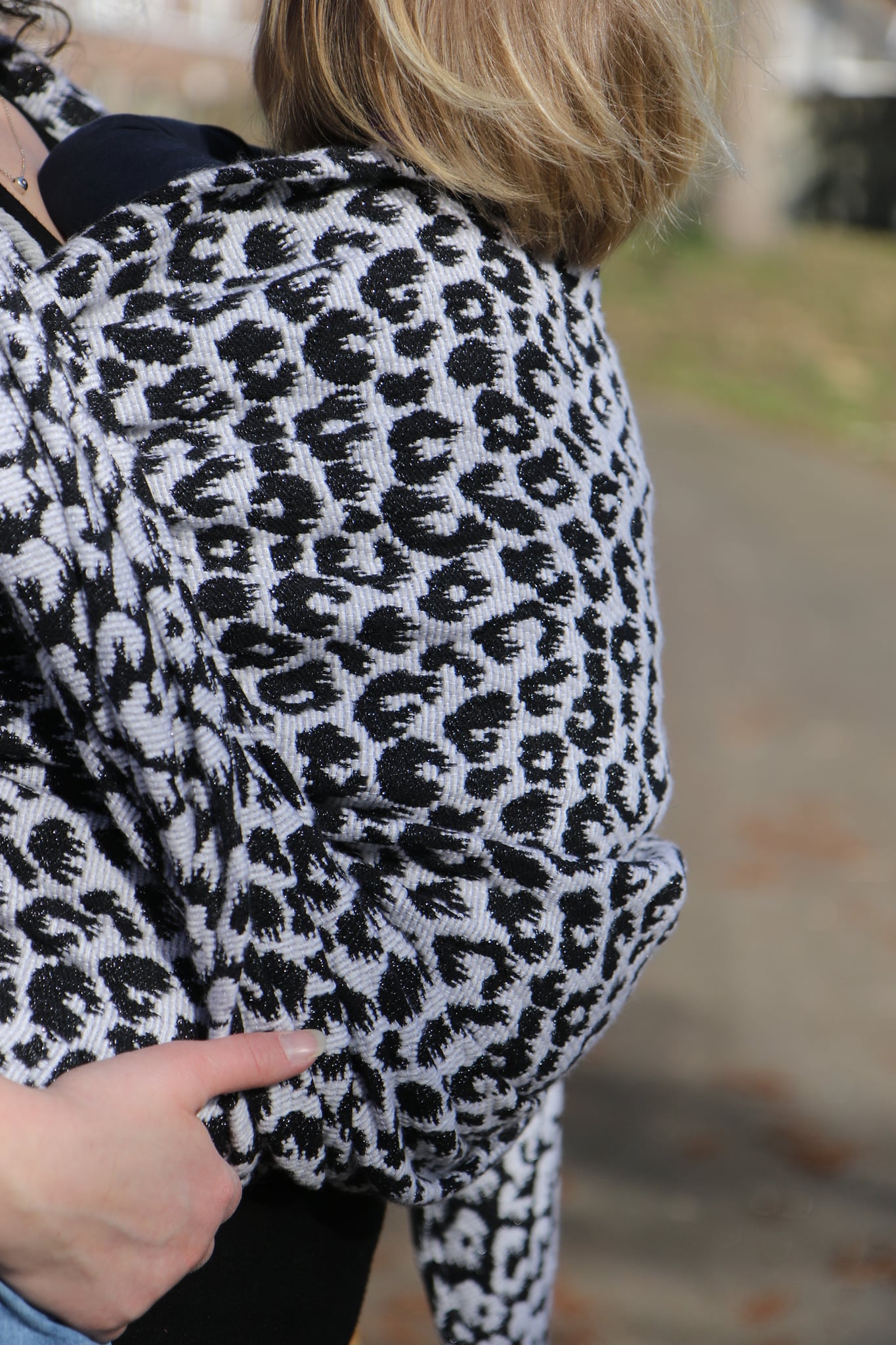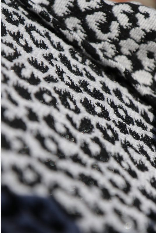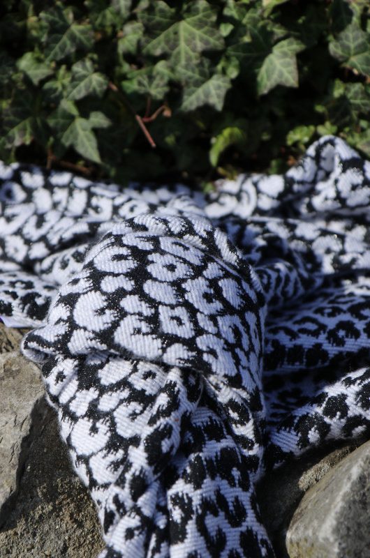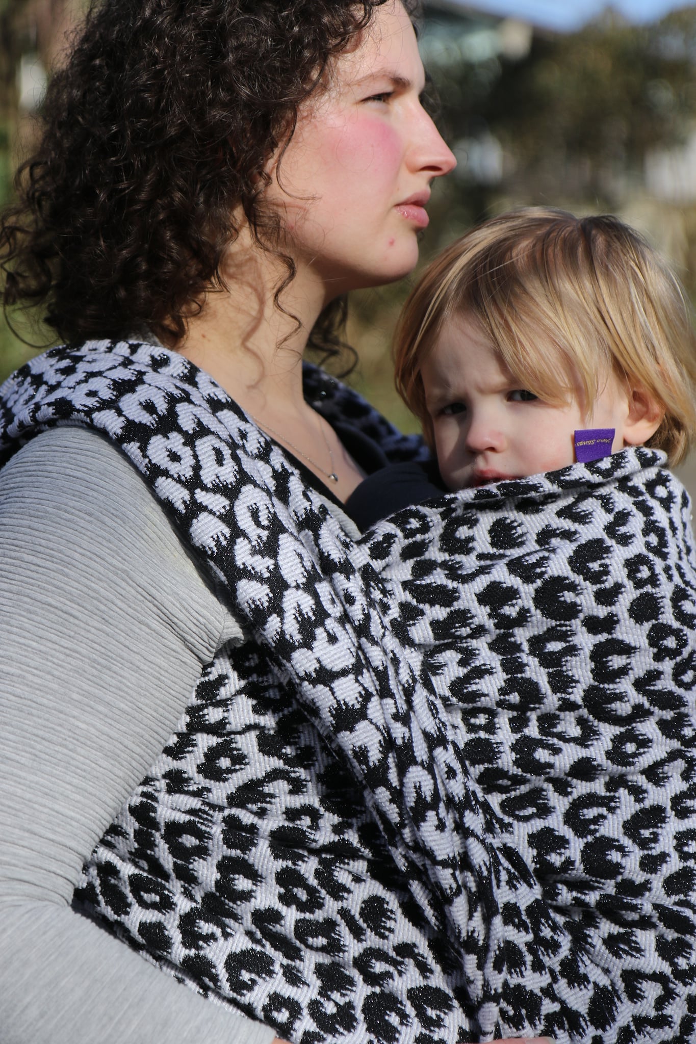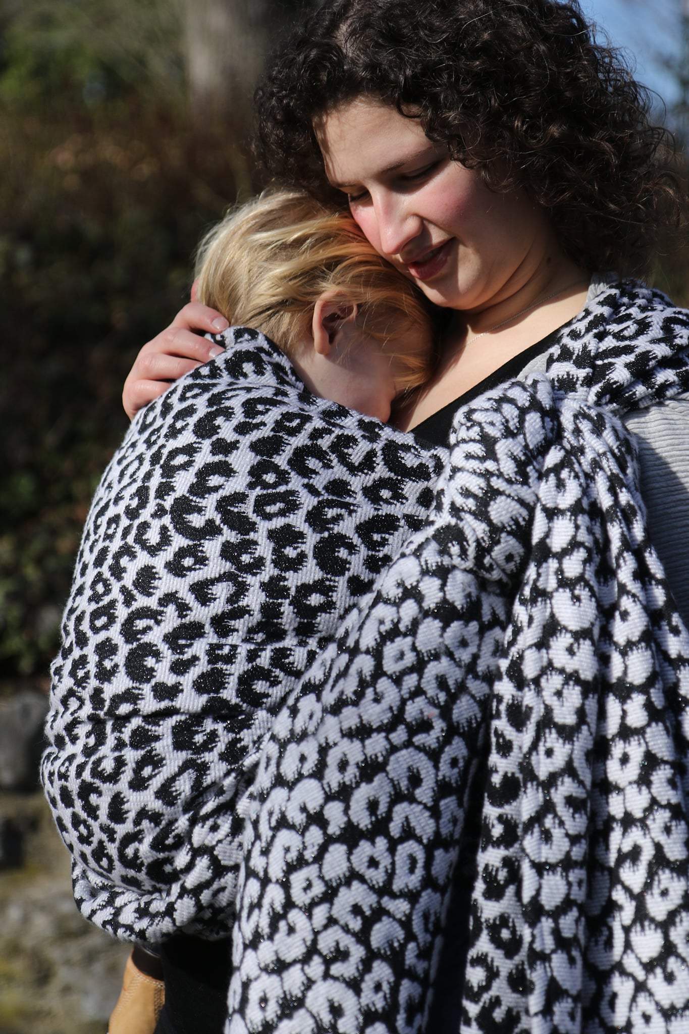 En ljuvlig sjal i pussycat-design i puffyväv och ullblandning. Lyxigt glittrig mot svart och vitt. Denna glimmar vackert ute i solen. Sjalen är mjuk och kommer omfamna er likt ett fluffigt moln. Den är åt det tjockare hållet, fördelen är att den ger god avlastning och passar för lite tyngre och större barn. Passar alla erfarenhetsnivåer. Denna sjal kräver handtvätt. Plantorkas.