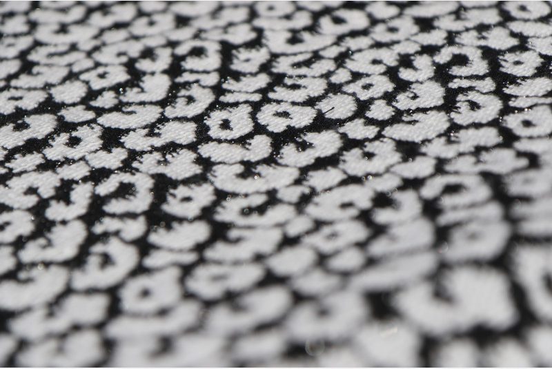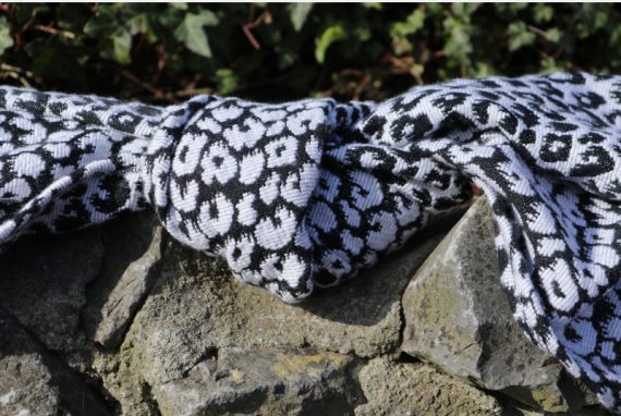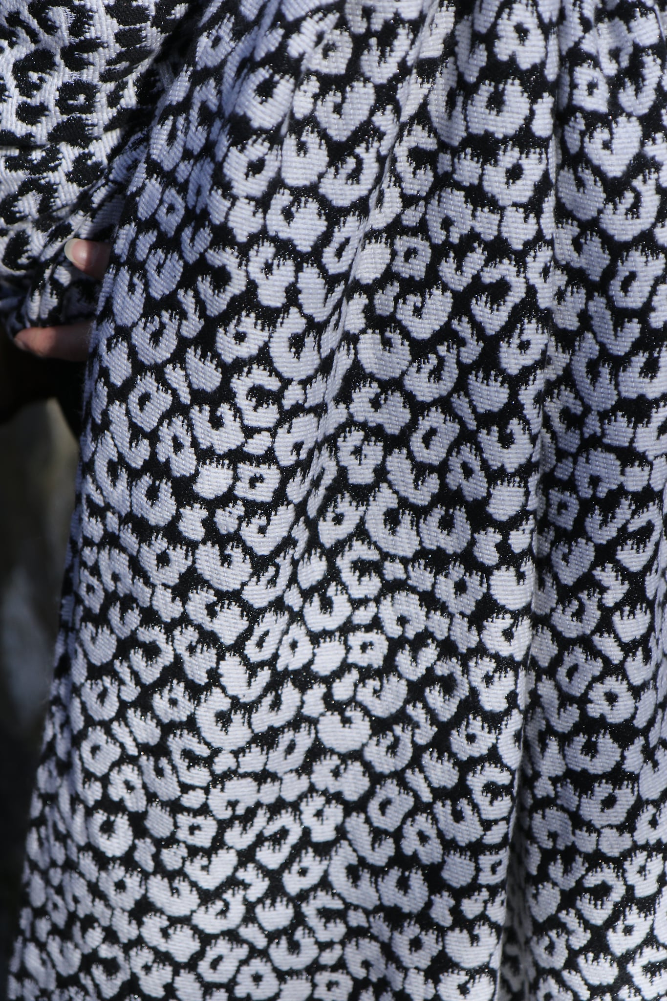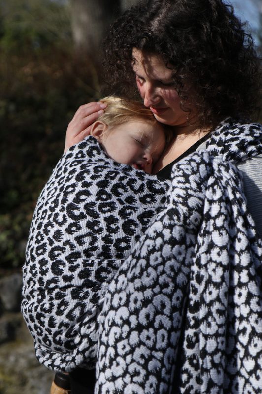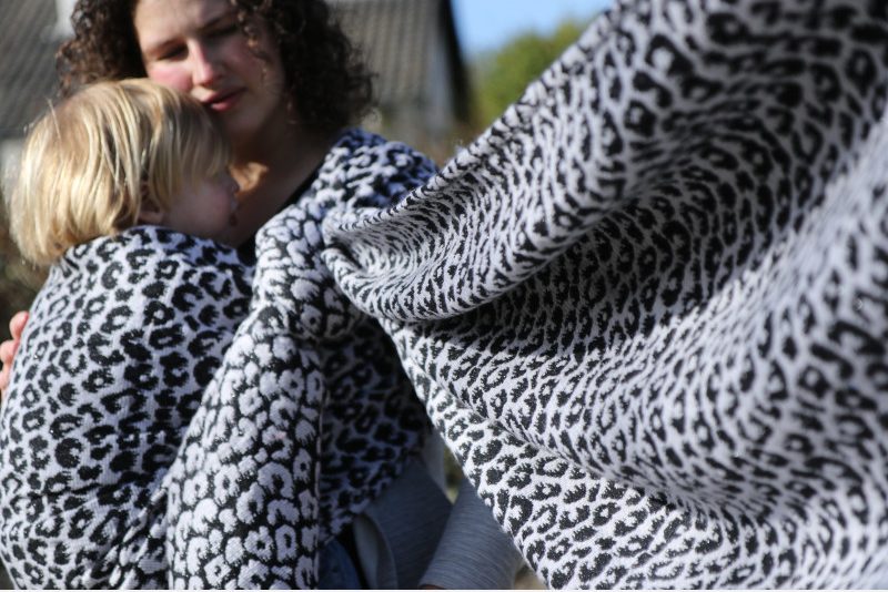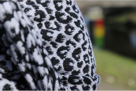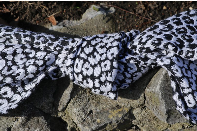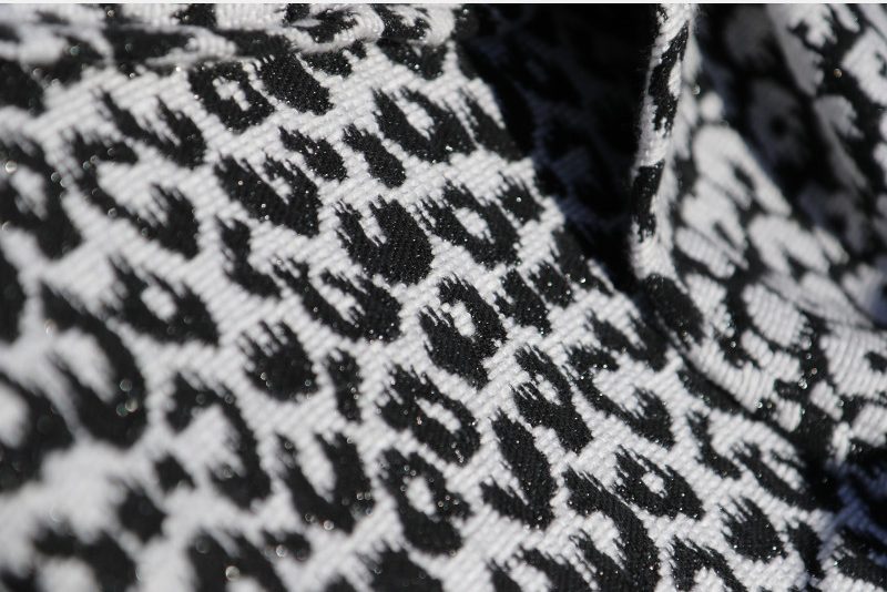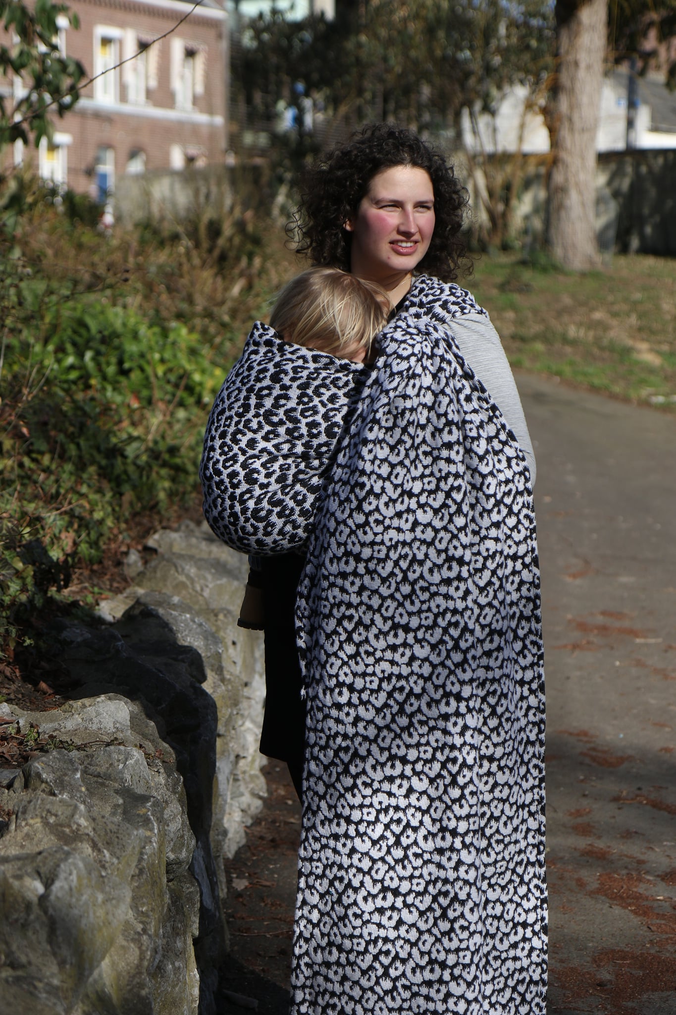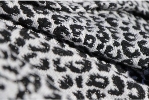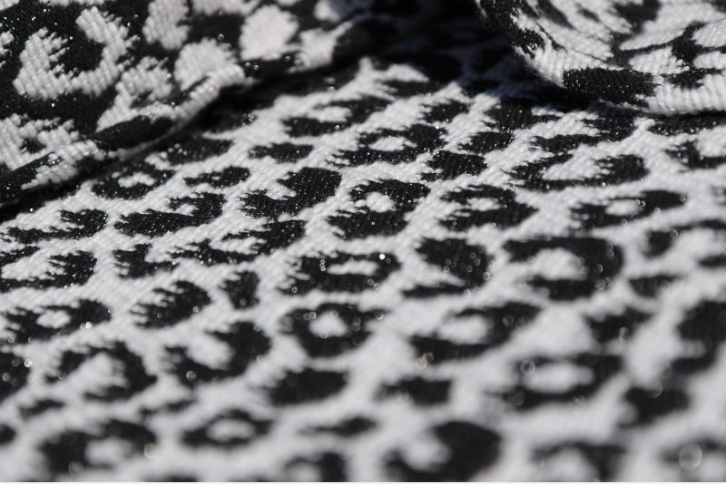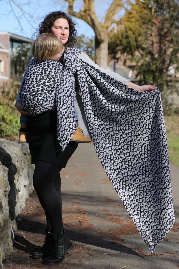 En ljuvlig sjal i pussycat-design i puffyväv och ullblandning. Lyxigt glittrig mot svart och vitt. Denna glimmar vackert ute i solen. Sjalen är mjuk och kommer omfamna er likt ett fluffigt moln. Den är åt det tjockare hållet, fördelen är att den ger god avlastning och passar för lite tyngre och större barn. Passar alla erfarenhetsnivåer. Denna sjal kräver handtvätt. Plantorkas.