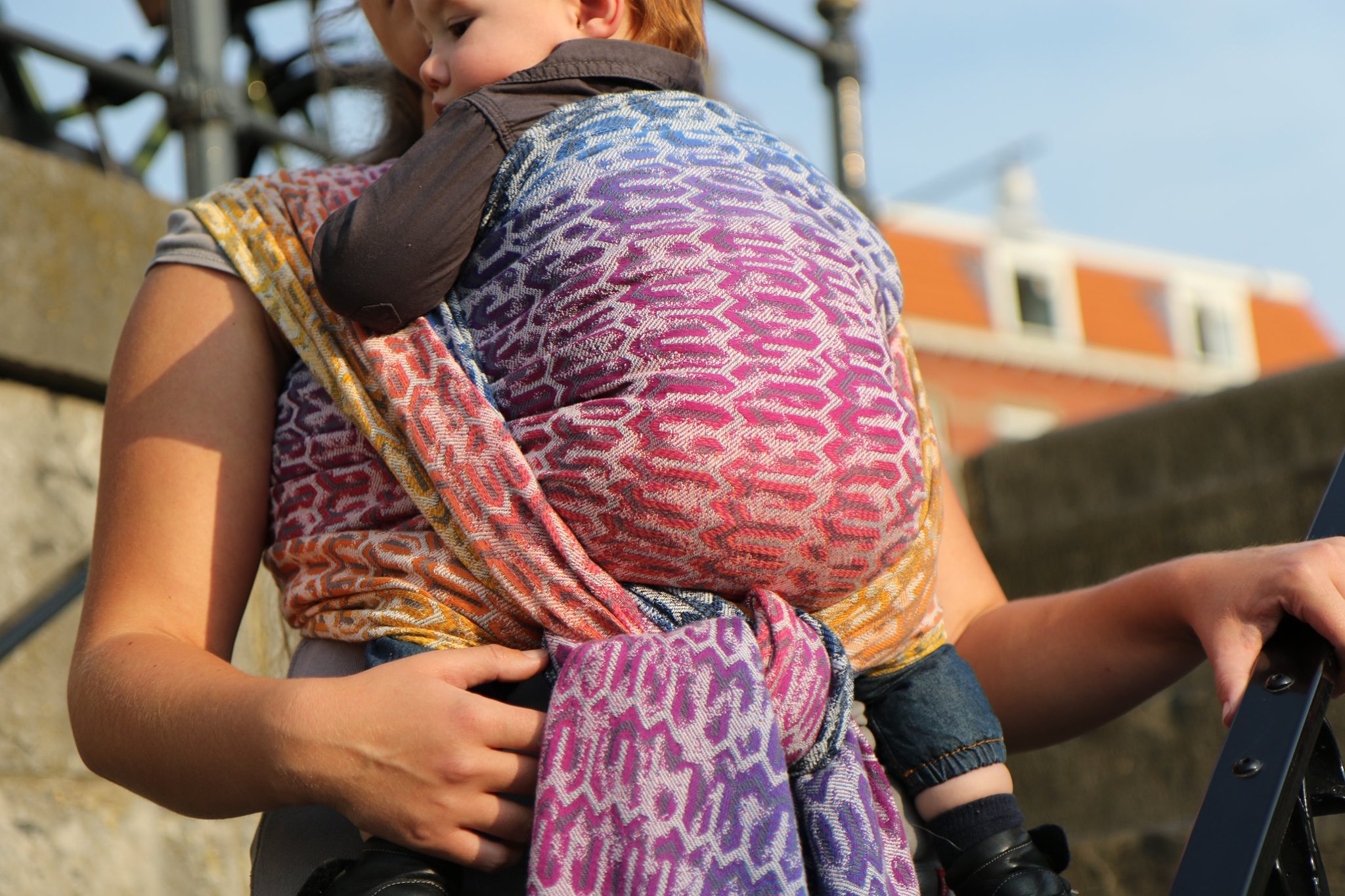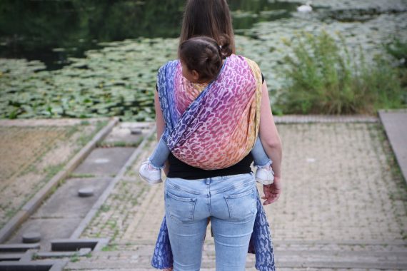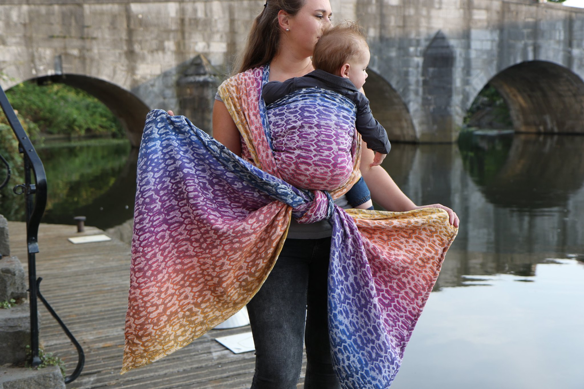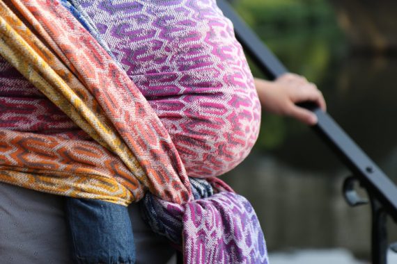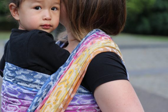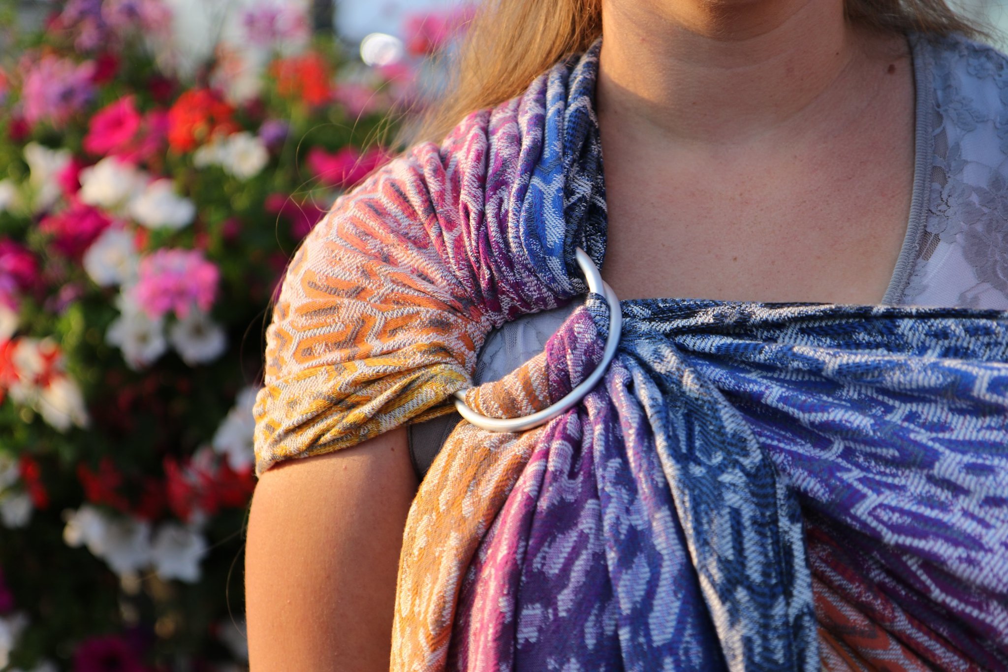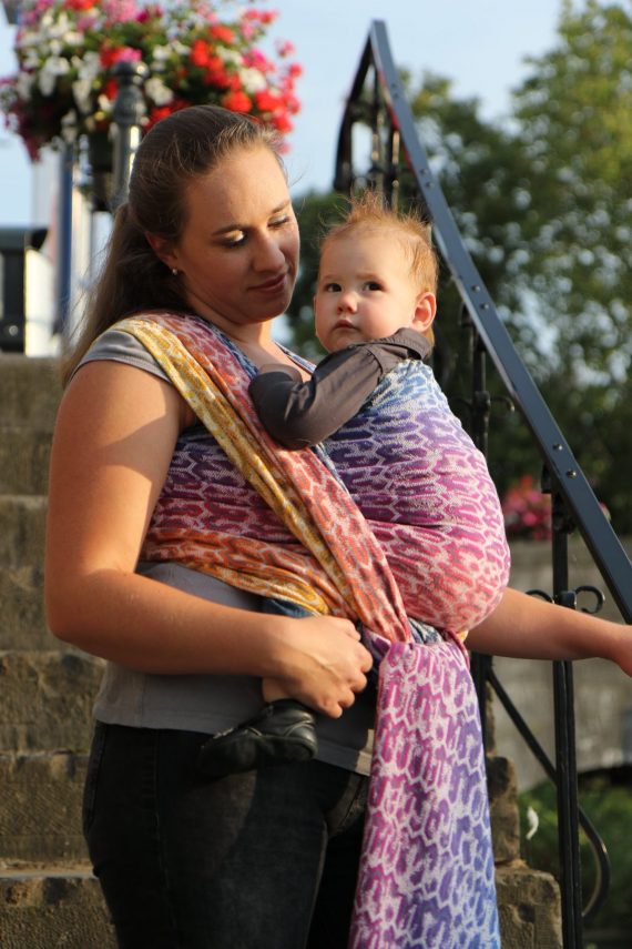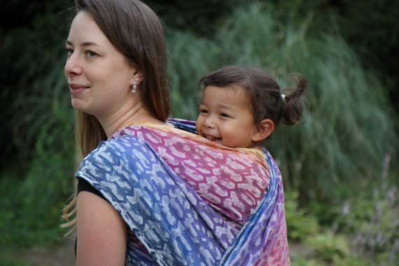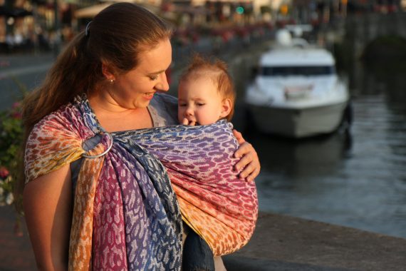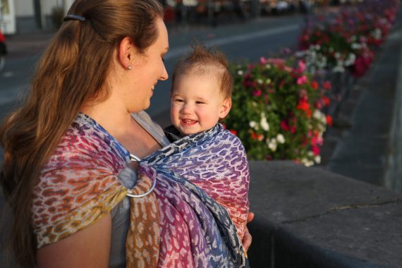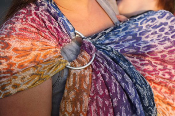 Med en ringsjal kan du snabbt och lätt bära ditt barn, du trär tyget genom ringarna, sätter i barnet och spänner enligt instruktionerna. Observera att det inte är rekommenderat att bära barnet i position “vagga” då det kan leda till att barnet inte får fria luftvägar.