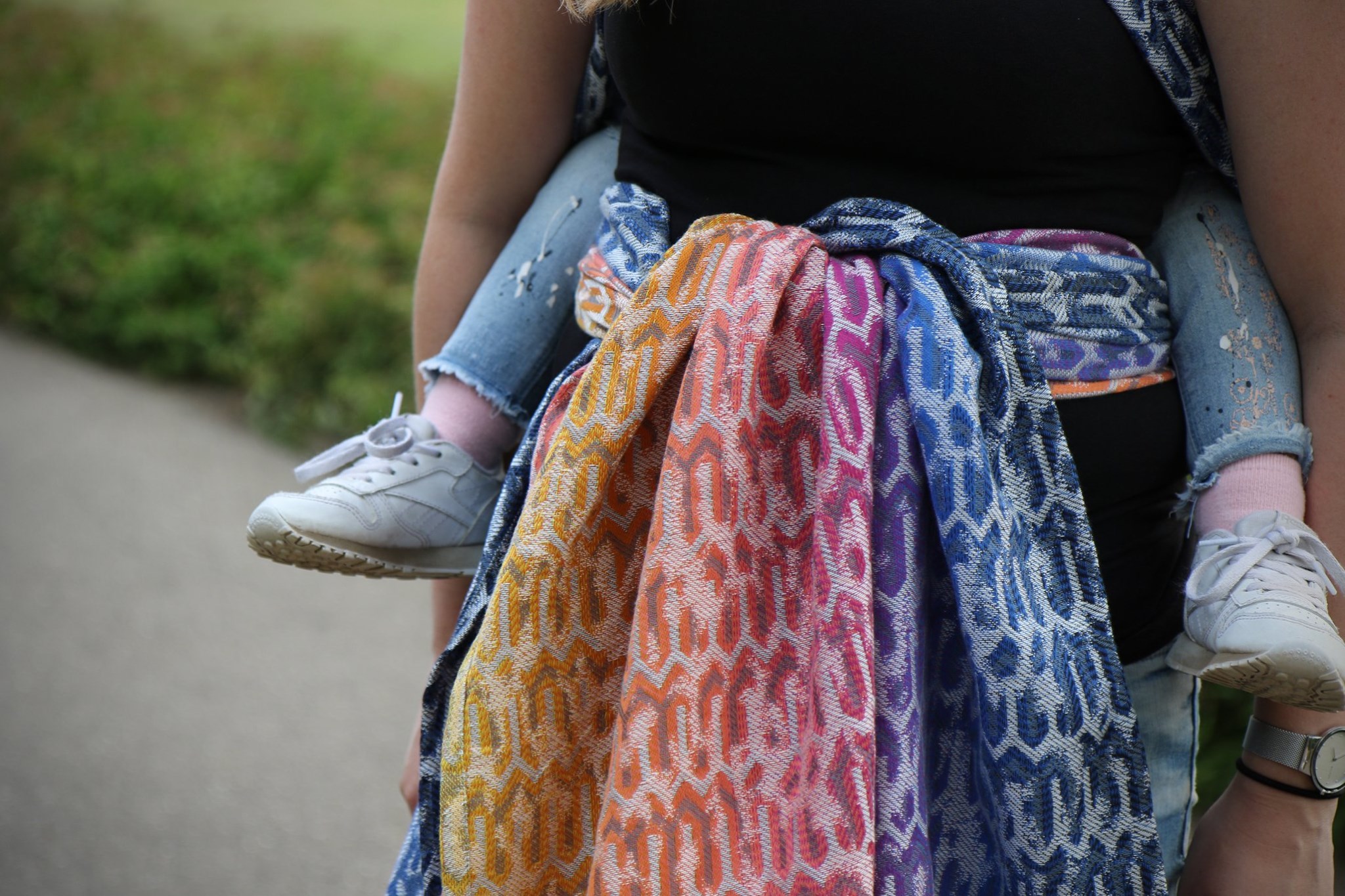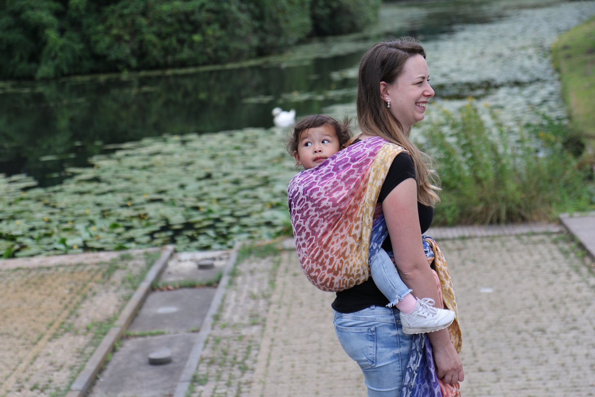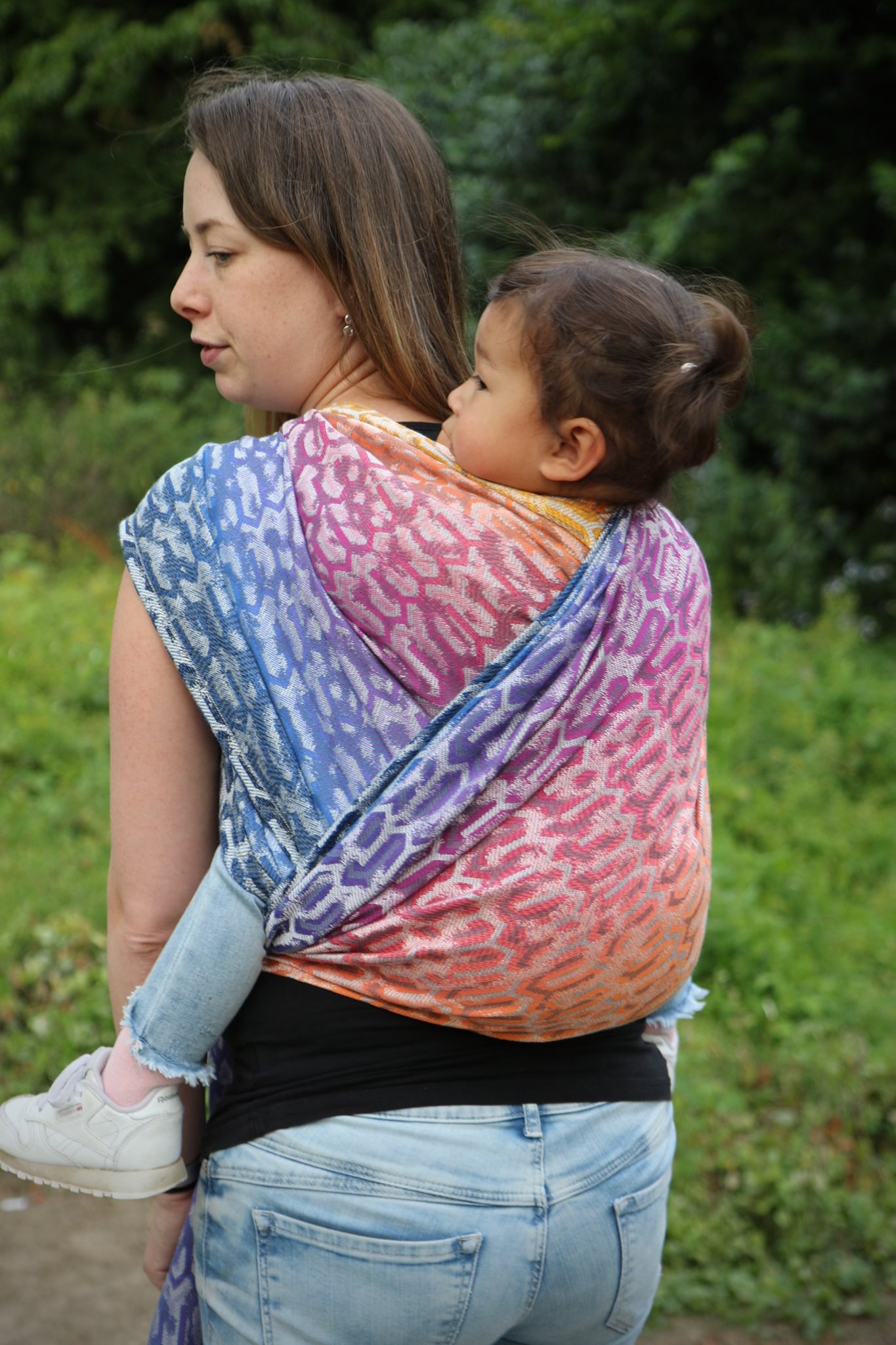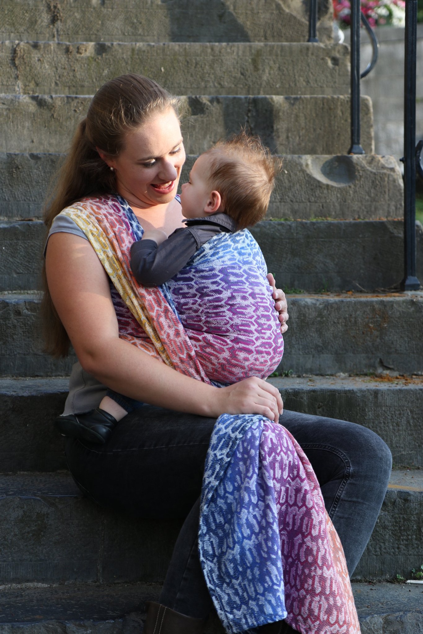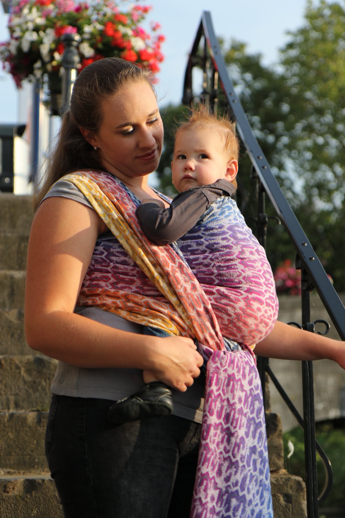 Med en ringsjal kan du snabbt och lätt bära ditt barn, du trär tyget genom ringarna, sätter i barnet och spänner enligt instruktionerna. Observera att det inte är rekommenderat att bära barnet i position “vagga” då det kan leda till att barnet inte får fria luftvägar.