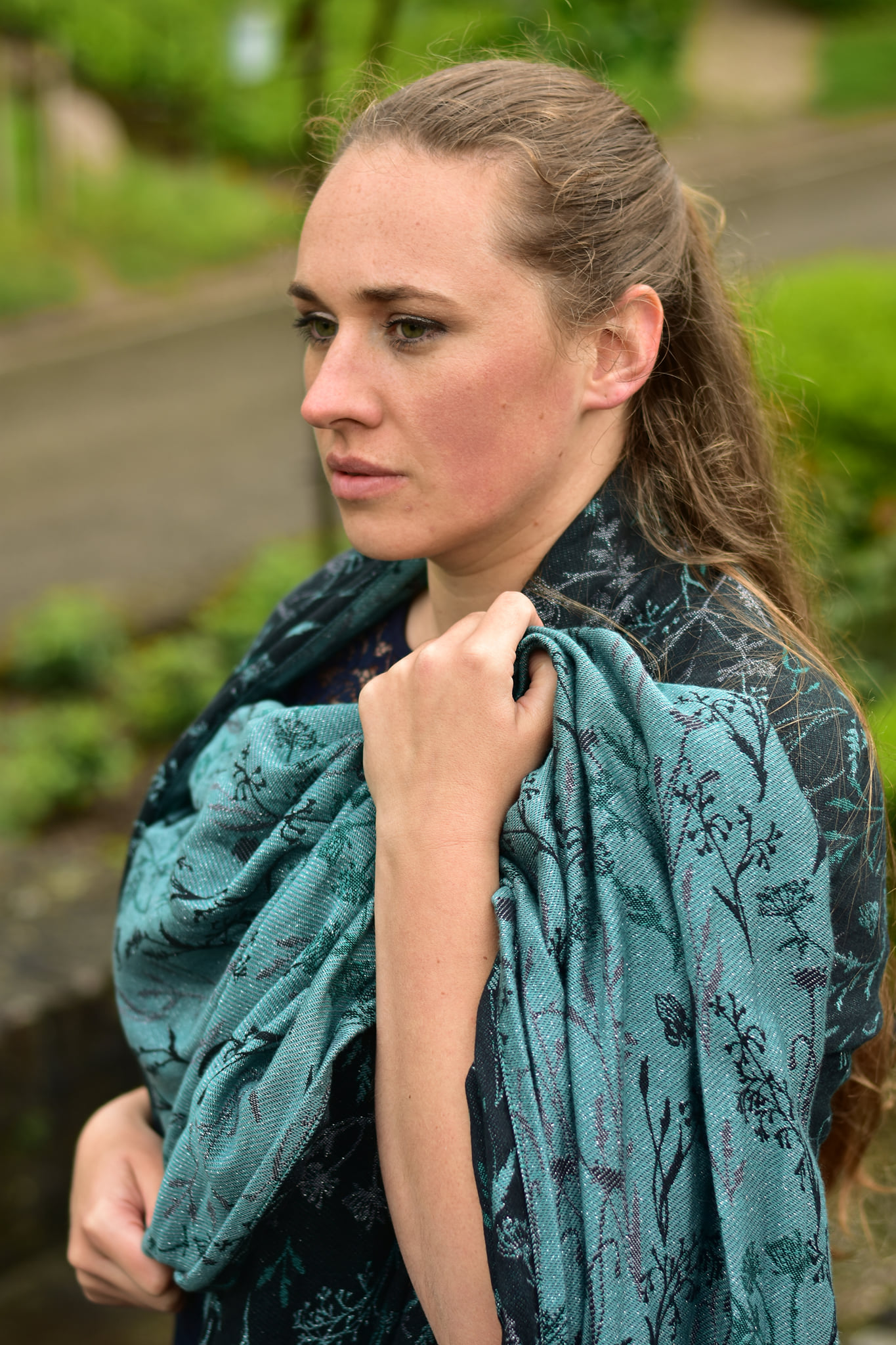 Vävd i duoväv gör denna sjal mjuk redan från start. Den sjalar känns tunn och följsam och passar därför särskilt bra för nyfödda eller mindre bebisar. Passar alla erfarenhetsnivåer. Subtilt glitter gör sjalen skimrande vacker. Kan tvättas i maskin på fintvättsprogram (ull/silke), på låg centrifugering. (max 400). Använd flytande tvättmedel.